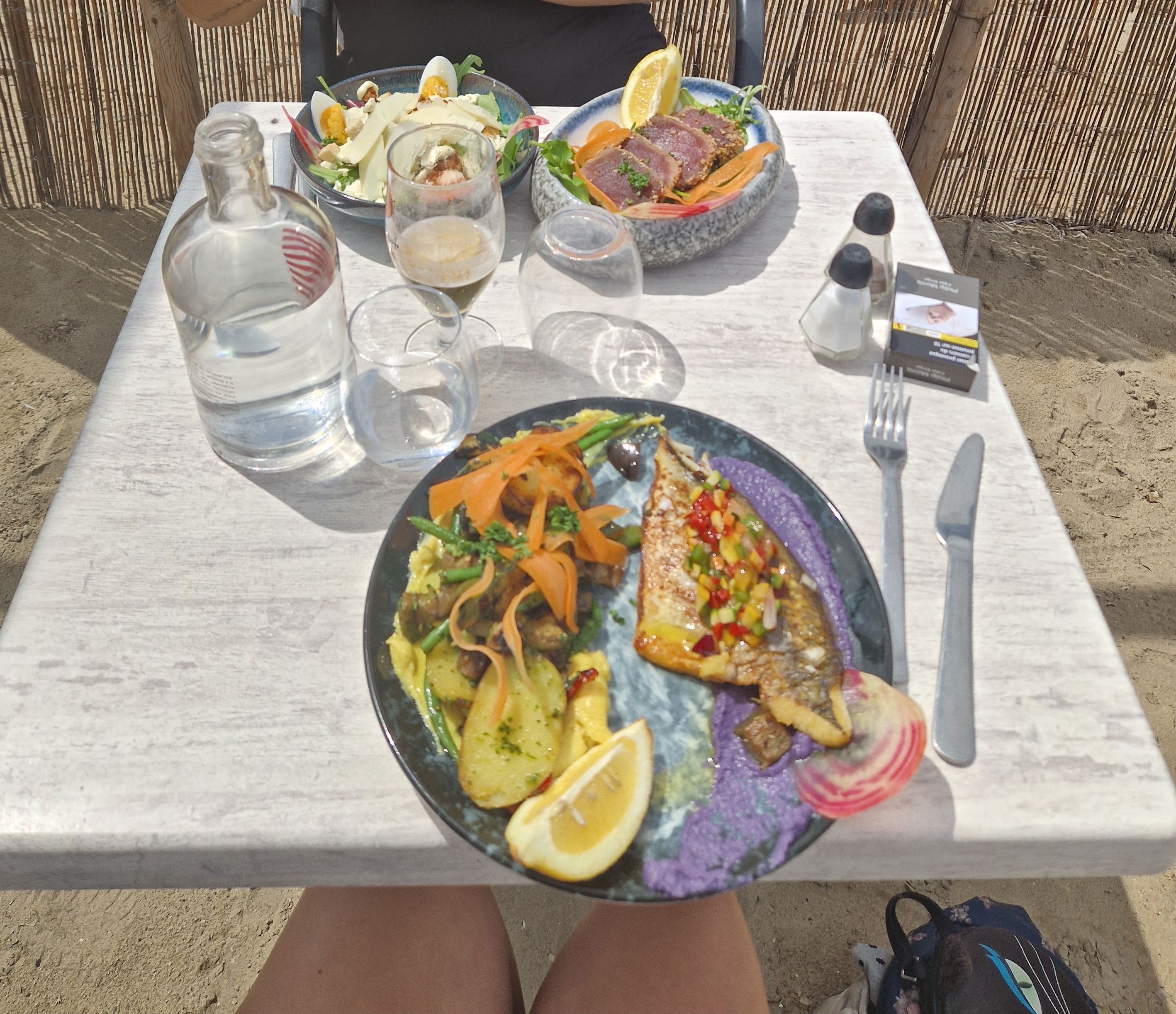 Nous avons déjeuné au resto et pris des transats pour le côté plage, mention spéciale pour le serveur Ilyes qui est très pro et ultra souriant, qui change d’autre de leurs serveurs/serveuses. Salade très bonne, les cocktails excellents Et puis leurs desserts, crêpes et plateau de fruits était parfait !