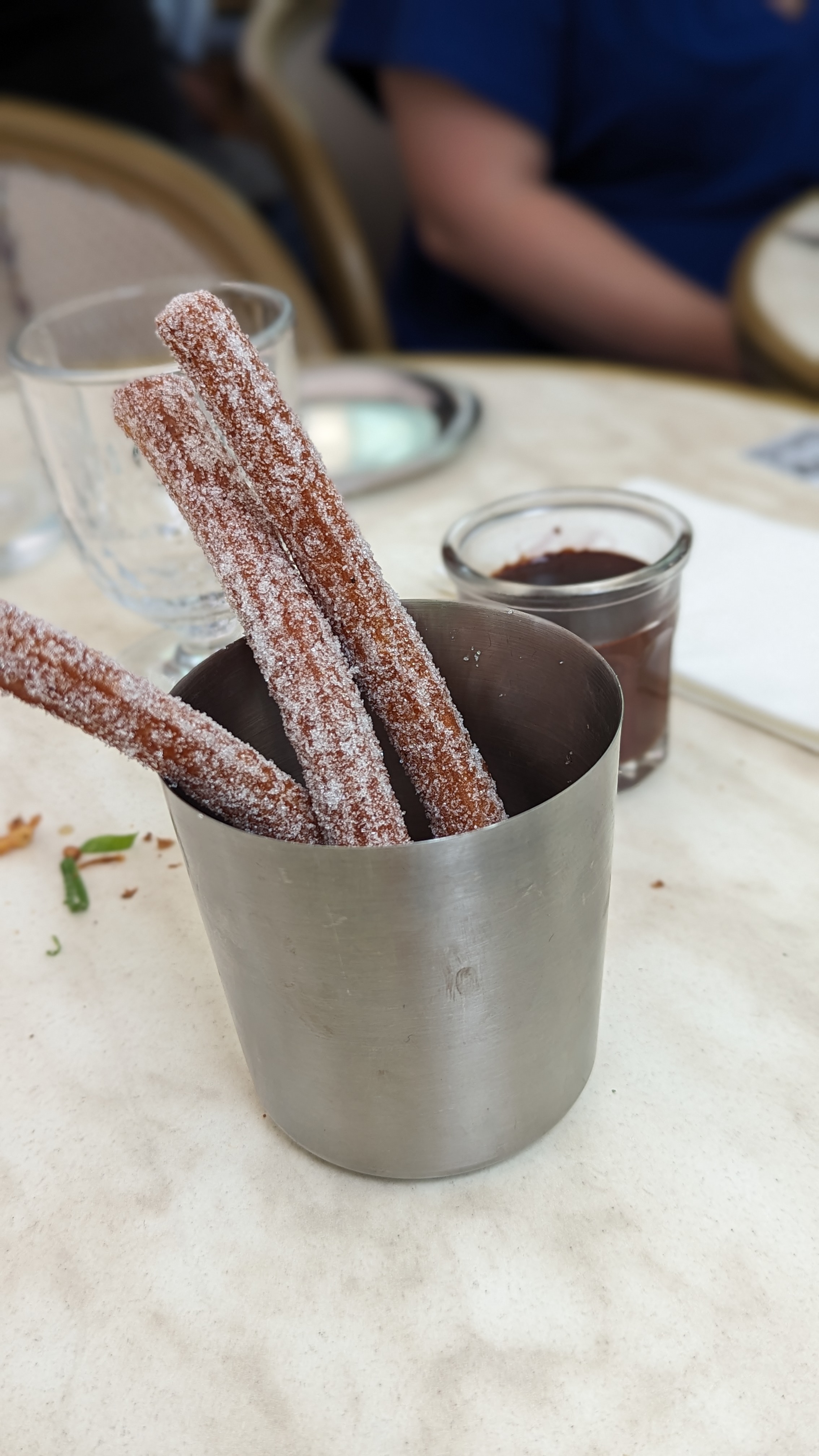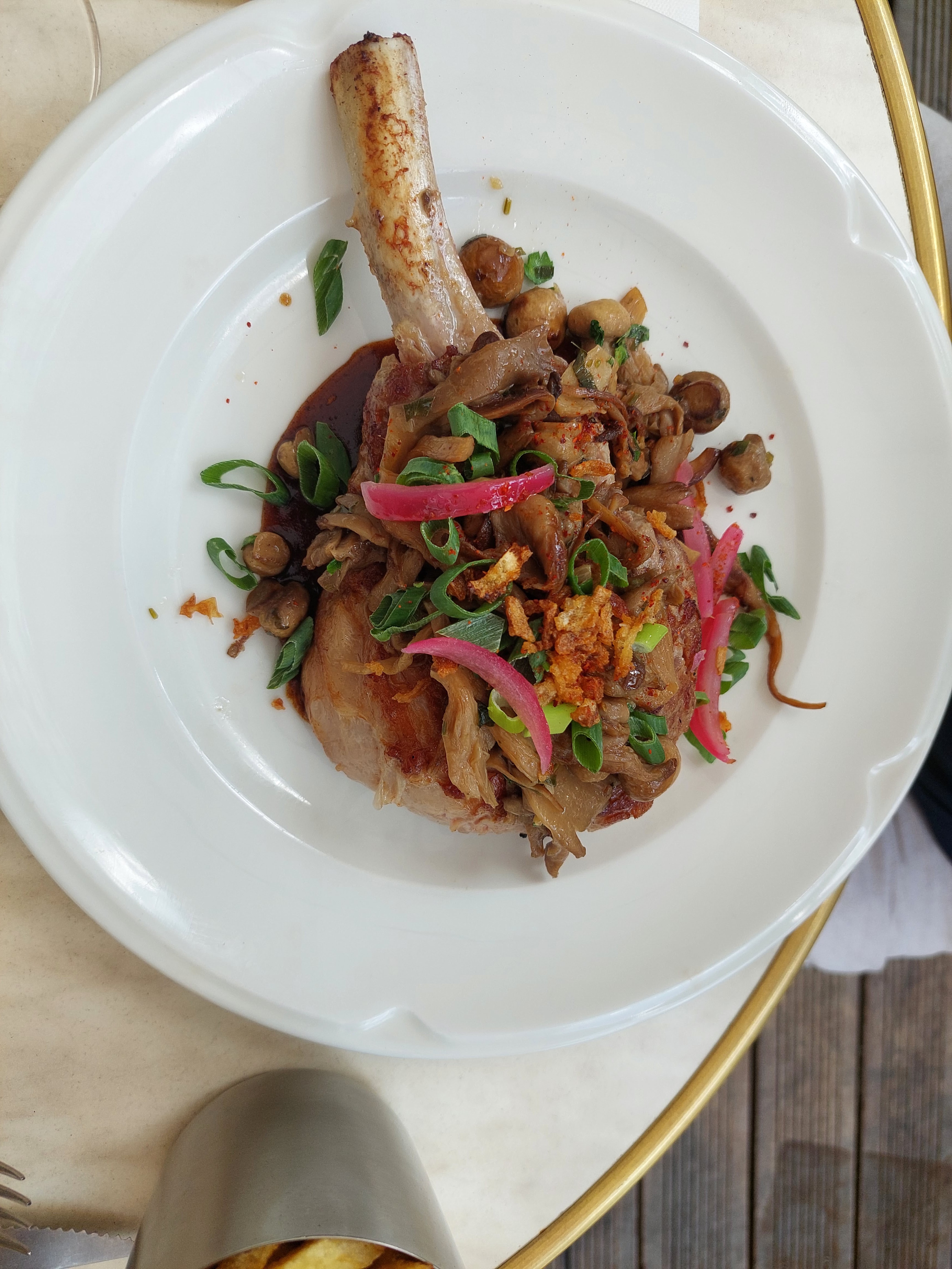 L'endroit, l'emplacement, la terrasse, la décoration, tout vous donne envie de venir. Un lieu original et très agréable en été. La terrasse est un havre de paix qui invite à passer un bon moment. Nonobstant, les prix sont vraiment exagérés sur certains produits. Les amuses bouches à 20 euros, sont ridicules. Le spritz à 14 euros... Quand-même ! Mais le pire fût la salade à 28 euros qui vous reste en travers de la gorge. En revanche, les cannelloni maisons étaient très bons. Le tomahawk de veau(vendu comme une côte) était correct mais la cuisson n'était pas celle attendue. Vraiment dommage, car le jus de viande était très bien réalisé et servi avec des frites maison qui sont toujours un plus. Grosse déception sur le churros en dessert servi avec un chocolat maison. Le churros en lui-même n'est pas complètement cuit ce qui fait que vous avez une impression pâteuse dans la bouche. Quant au chocolat, on sent qu'il s'agit d'un chocolat de qualité malheureusement, celui-ci est à l'eau... J'aurais préféré au beurre (voir au beurre salé) même si je sais que ça ne fait pas l'unanimité. Bref, une expérience mitigée. Il faut choisir avec soin ce que vous y commandez pour ne pas vous laisser une impression moyenne. Dommage, car l'établissement est vraiment bien placé et agréable mais la cuisine n'est pas au niveau du prix. Pour le service, comme presque partout maintenant, il est poussif mais de bonne volonté. Je ne leur jette pas la pierre nous connaissons les soucis de recrutement dans ce secteur. Encore une fois, il faut baisser les prix ou augmenter la prestation générale et l'expérience sera bien supérieure.