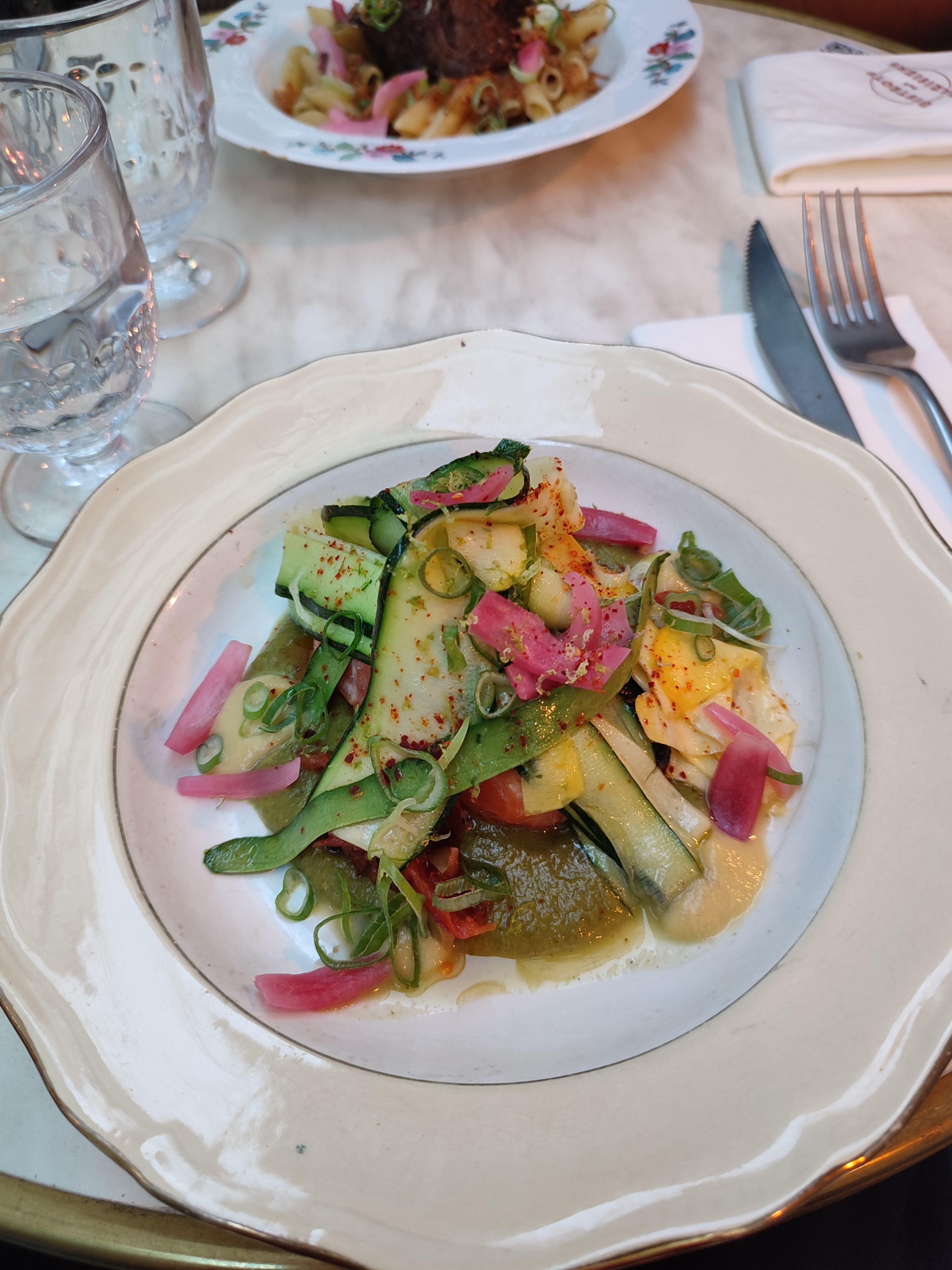 Petit résumé de notre soirée 🙂 Ambiance et cadre très sympathique. La salle est très belle et INSTAGRAMABLE comme beaucoup aiment. La terrace est mignonne et calme. Les serveurs sont agréables et plus avenants que le manager qui semble perdu. Nous demandons 2 spritz. Ces derniers n’étant pas sur la carte, la serveuse nous dit qu’il sont à 6€ et nous payerons finalement le prix d’un cocktail (14€) à la fin du repas. Nous avons partagé 3 entrées : Le gaspacho est très bon, rien a dire. Les cannellonis, très surprenant et même décevant. Ce ne sont pas des cannellonis mais des nems ricotta épinard. 95% d’épinard et très peu de ricotta donc très sec. De plus la pâte des nems n’était pas croustillante. Dernière entrée, le vitello tonnato, pas mal du tout. Le veau était bon malgres le surplus de sel dans l’assaisonnement de la salade. Le plat, nous avons toute mangé la volaille et c’était un bon choix, très bon. Le plat est copieux !! Nous ne sommes pas volé sur les quantités. Les desserts, mitigés ... le millefeuille est très bon et le vacherin surprenant. Quand on s’attend à un vrai vacherin et que l’on nous sert une coupe avec de l’ananas et une “crème” fouettée. Étonnant d’après la carte mais très bon tout de même. Nous avons été servit à deux reprises sans couverts ... pas super professionnel. Bref un peu cher pour le résultat et le service est à réorganisé. Le personnel à le mérite d’être agréable et souriant. Plutot décevant surtout quand on est une adepte des autres restaurants de Norbert.