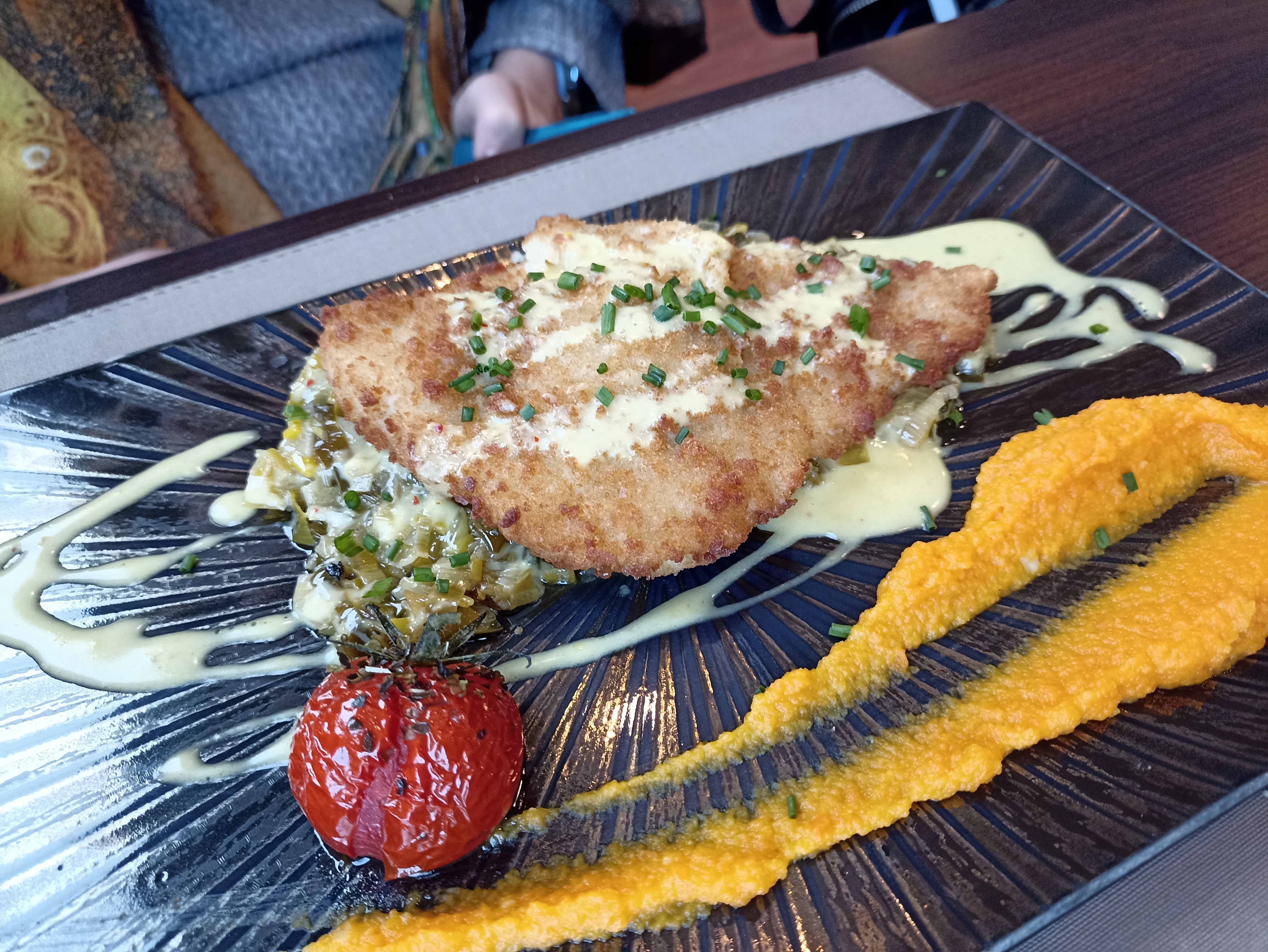 Repas d'anniversaire en tout petit comité ce dimanche. Un gros repas d'anniversaire au RDC mobilisait le personnel, (30 convives ?), cependant, nous avons étés servis rapidement et l'apéritif a été servi avec du pâté en croûte. (Le kir au Mac vin est à découvrir..) Très bonne gestion en cuisine pour l'attente entre les plats. Allergique au poisson, j'ai pris la pièce de boeuf en suggestion. Cuisson bleue respectée, accompagnée de cèpes frais en sauce, l'accompagnement était varié et très bon (photo). Les autres convives ont commandé la friture de carpe et frites et ont étés vraiment très satisfaits. Ils proposent même un plat vegan, Linguine aux champignons. L'architecture des locaux est surprenante, en forme de bateau, des plafonds ondulants, des plantes et des semis-étages, avec une vue lointaine sur la chapelle designée par Le Corbusier (à visiter) Parking à proximité, un autre à 30 mètres, accessible aux handicapés. Le personnel y est très agréable et efficace