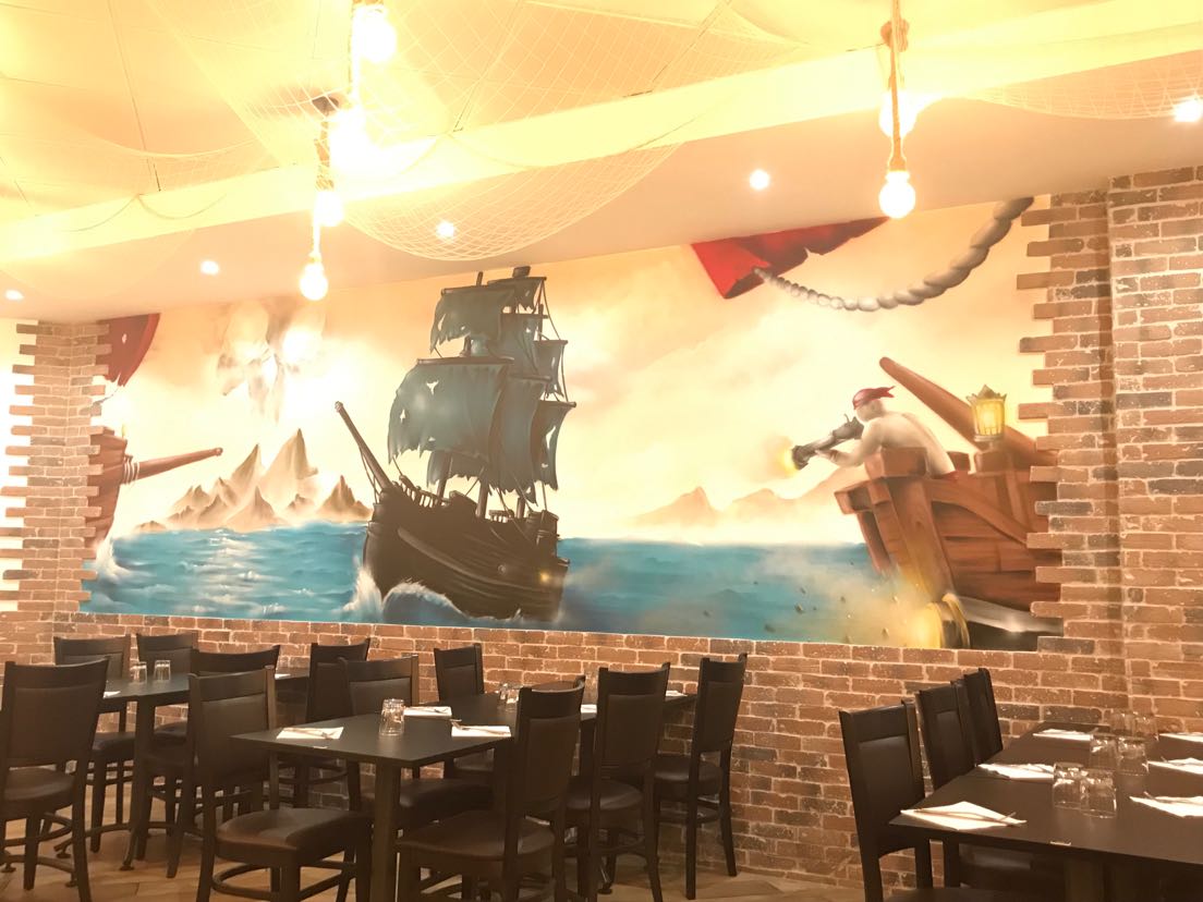 Emplacement idéal à la sortie de l'A71 et face à l'hôtel B&B. Il y a une terrasse pour prendre un verre, un bar intérieur et un assez grand restaurant. Il y avait une décoration sur le thème des pirates et du poisson vivant dans le restaurant, ce qui ajoutait à l'atmosphère qui était plutôt bonne. Le menu à la carte proposait des fruits de mer. burgers, steak et buffet, le tout à des prix raisonnables (25 euros pour le buffet ou 17 euros pour les enfants, 13 euros pour le burger). Le buffet offrait un excellent choix. Nous y étions un samedi soir d'août et il y avait un grand choix de plats mais pas une quantité énorme de chaque option mais ils étaient remplacés assez souvent. Il y avait beaucoup de fruits de mer disponibles, notamment des gambas, des huîtres et du saumon fumé. Il y avait de nombreux plats de poulet et de pâtes chaudes/riz/légumes, un immense bar à salades, de la charcuterie et du fromage et une bonne sélection de desserts et de glaces. Aucun d'entre nous n'a eu de problème de disponibilité ou de choix de plats au buffet et c'était un bon rapport qualité-prix. Le service était excellent, donc c'était un excellent choix et nous y retournerions certainement.