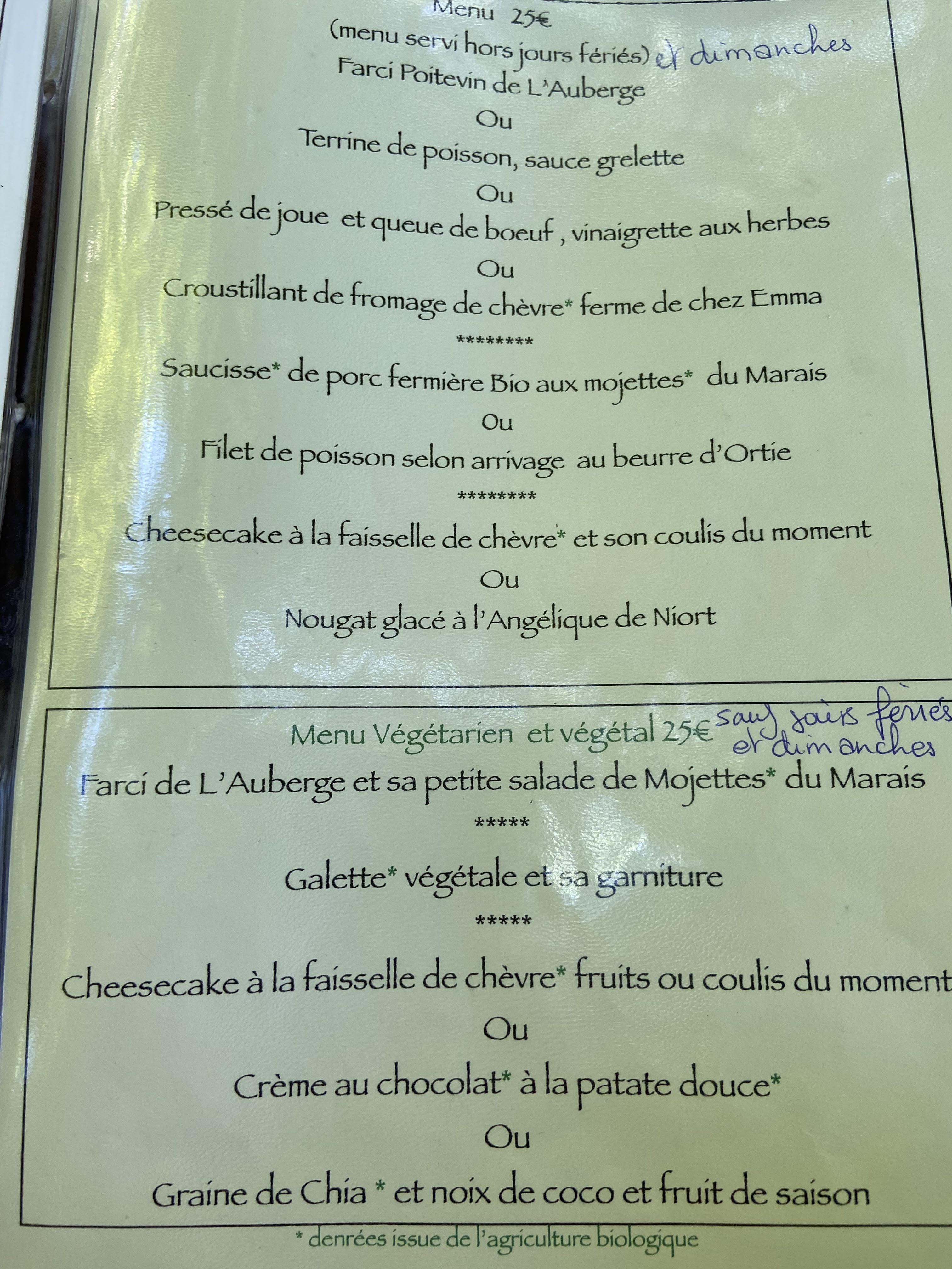 Déçu ☹️☹️☹️ Le changement de propriétaire se fait sentir. Bafouillage dans la réservation Des serveurs sympa mais la maîtresse des lieux à cran. Qualité des plats moyenne au regard du tarif. Les irish coffee loin d'etre à la hauteur de la prétention de la propriétaire. Sur 4 servis 3 n'avait pas d'alcool ce qu'a reconnu la patronne dont l'honnêteté est là mise à rude epreuve. Cette auberge n'est plus une référence culinaire du marais. A éviter. De plus les commentaires sur les avis des propriétaires ne sont pas objectifs et surtout dédaigneux.
