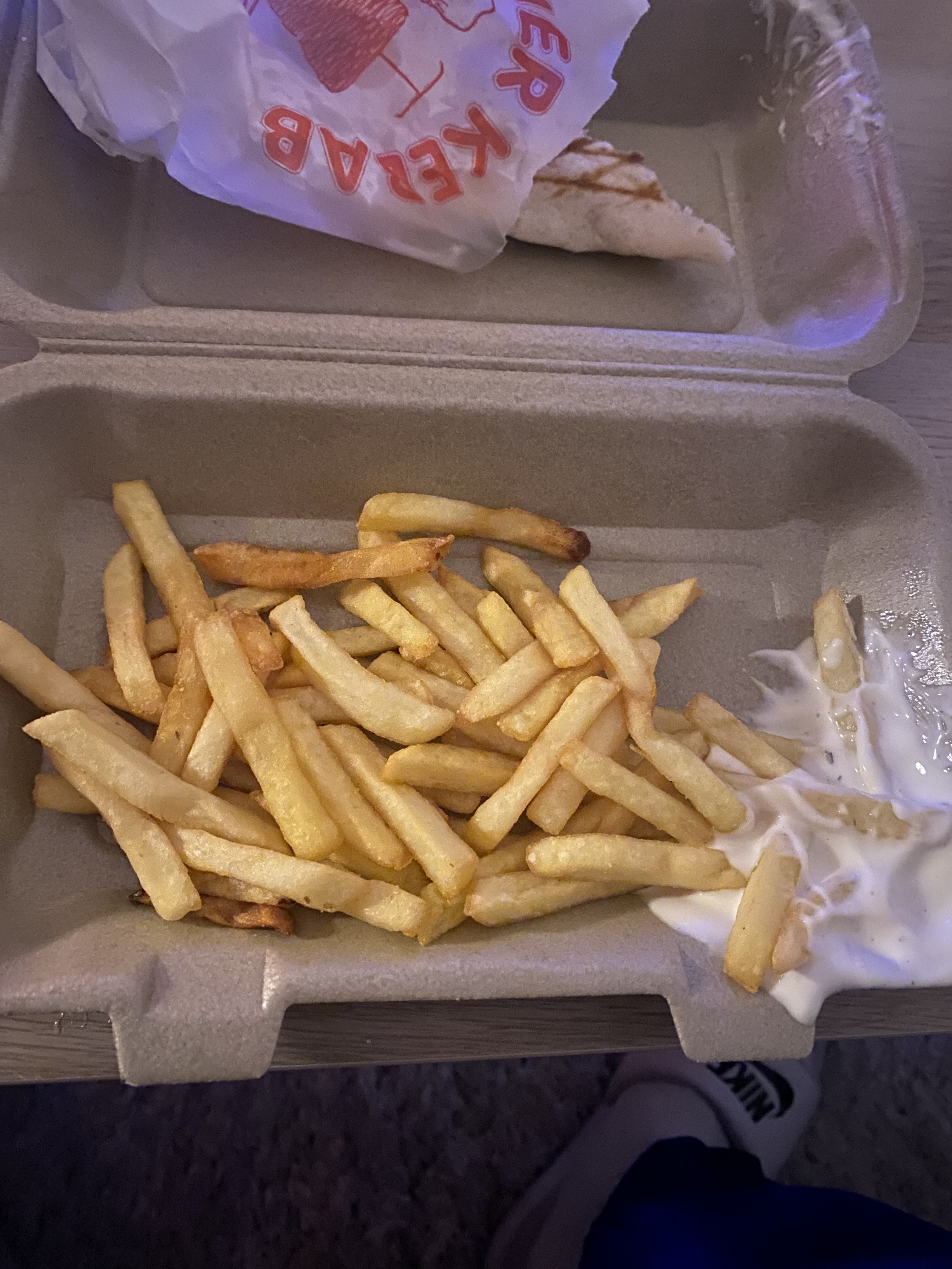 Viande kebab savoureuse, le pain est bon, frites bien servi, service rapide et sympa menu 7 balles sah