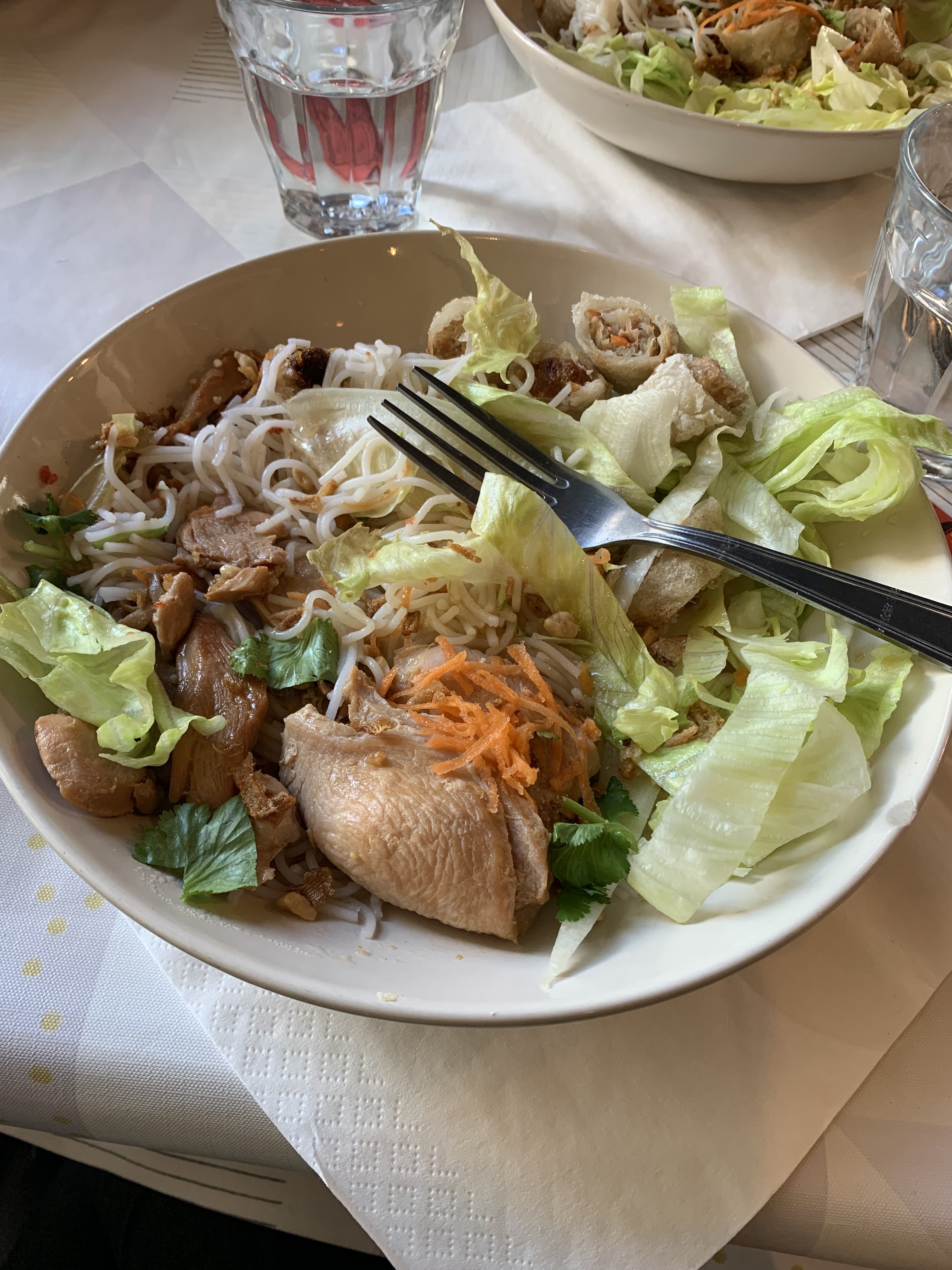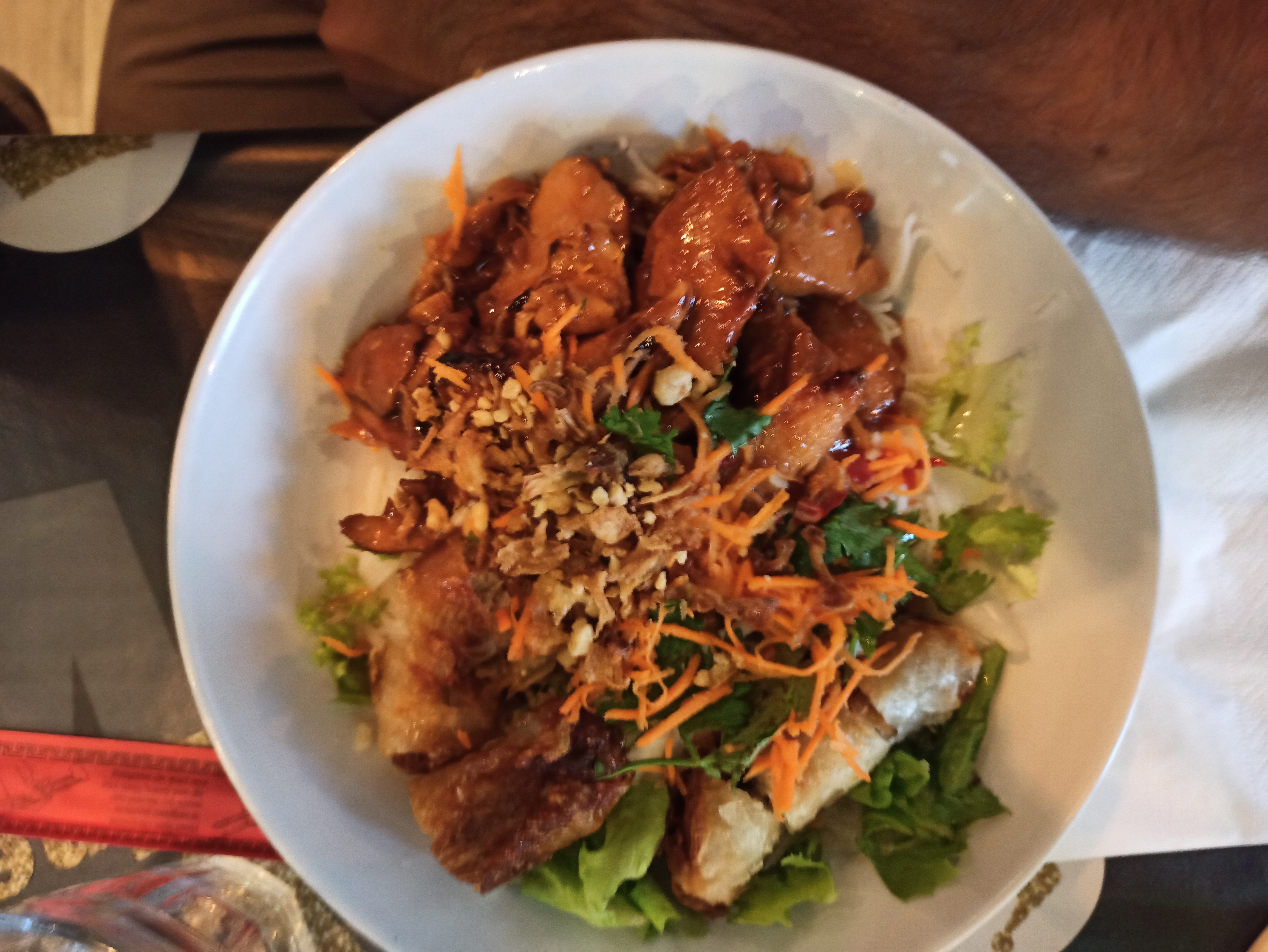 Un bobun végétarien avec des nems au porc et en prime des bouts de papiers dessus !