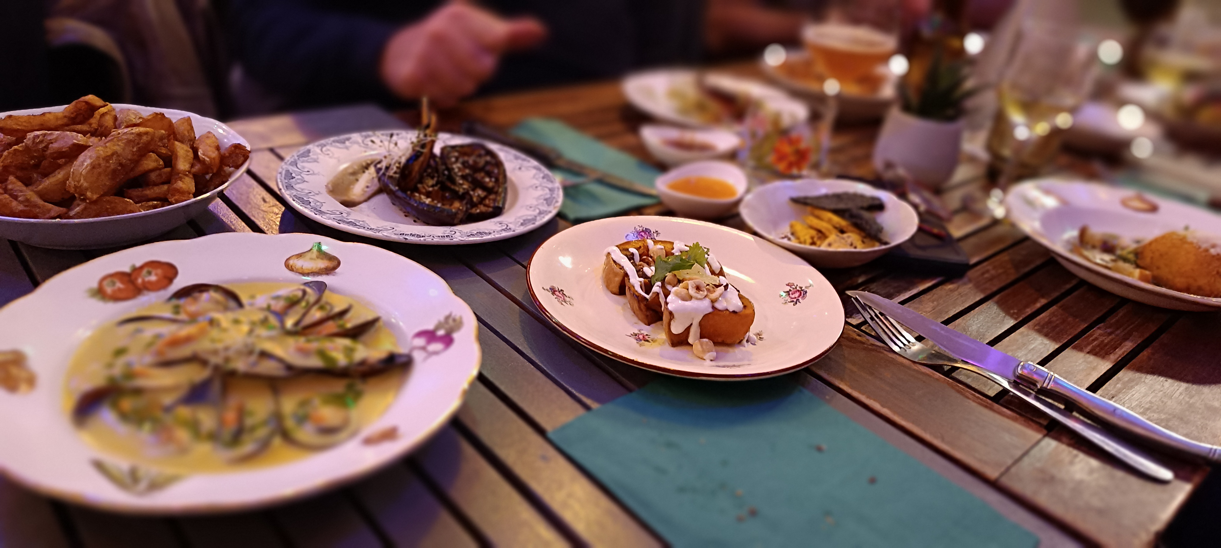 Plats à partager délicieux : travers de porc, légumes en tempura, frites (une tuerie !) ; et pour finir en beauté, une suggestion du patron : tatin au fenouil, une belle découverte. Ma cousine et moi nous sommes régalées. Sans oublier l’accueil, la prévenance et la gentillesse. Nous reviendrons.