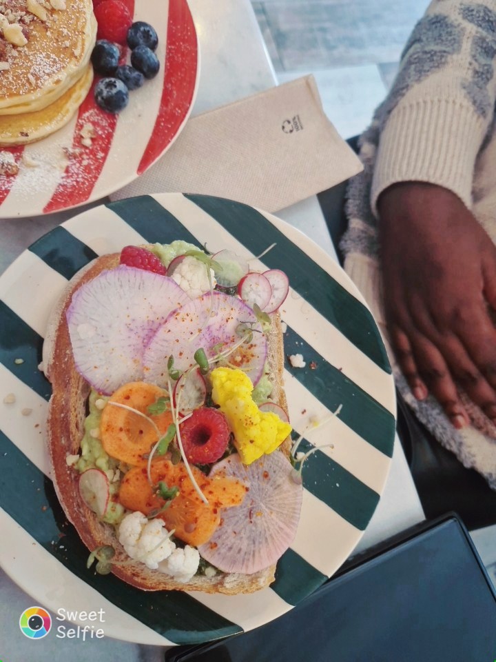 Un brunch attendu avec impatience qui m’a un peu laissée sur ma faim… je ne parle pas de la quantité des plats, qui est bien suffisante, c’est copieux. Les assiettes sont très belles mais dommage, quelques fausses notes: Avocado toast qui aurait été assez fade sans que j’ajoute un supplément bacon pour 2€, pancakes sucrés annoncés avec du sirop d’érable et arrivés avec une grosse couche de beurre de cacahuètes alors que je n’aime pas ça… et dommage, machine à glaçons en panne et donc pas de boissons glacées dispo, même la citronnade aurait eu besoin d’être rafraîchie. Nous avons bien vu que l’équipe était un peu dépassée, nous le comprenons, mais attention à garder vos bons points! Le concept et le lieu sont cools et l’accueil aussi ☺️.