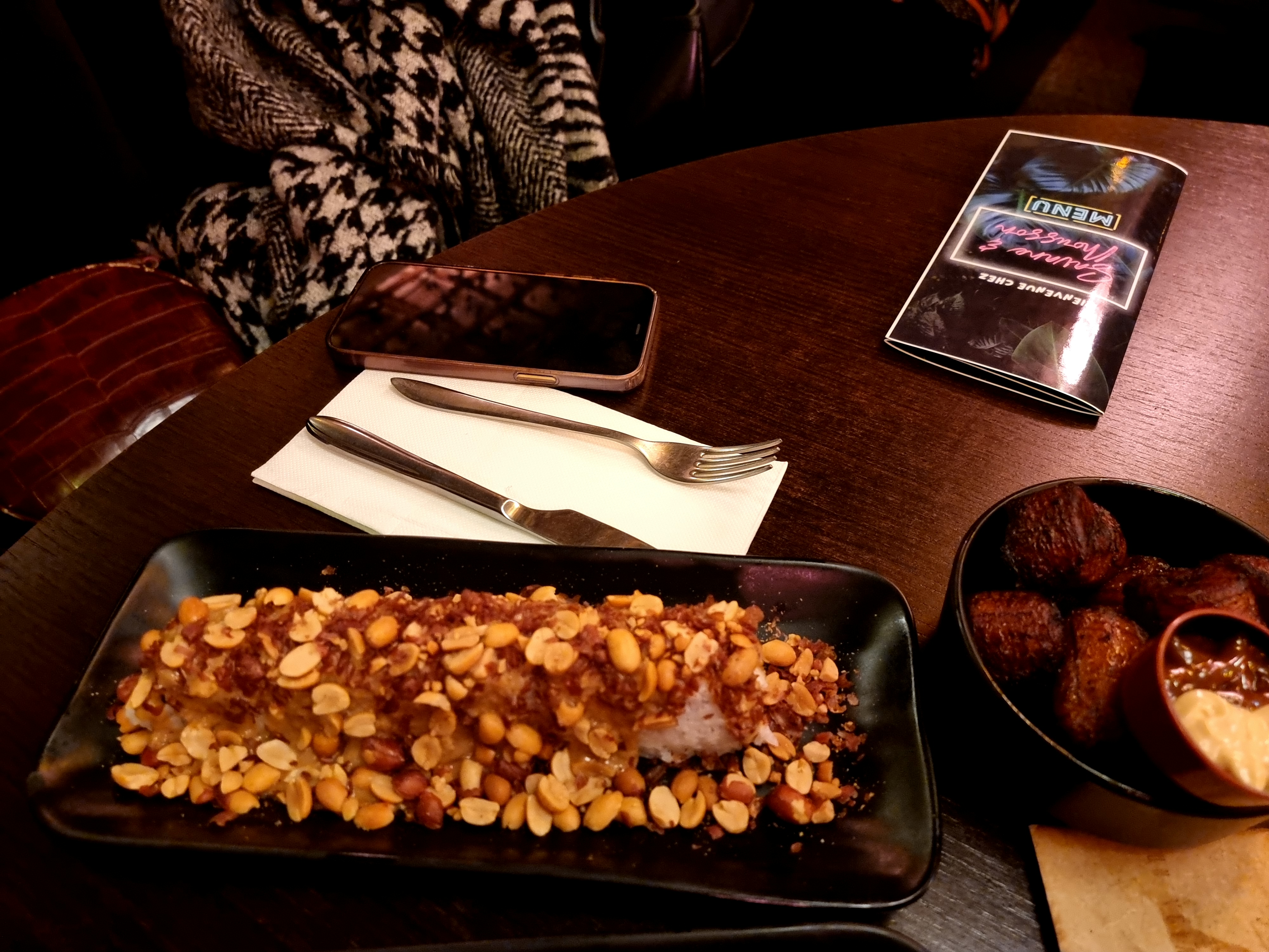 Nous avons testé ce restaurant dont j’avais beaucoup entendu parlé et dont les avis étaient très bons. Nous avons été un peu déçus par la salle et le fait que nous étions près de la porte. Pour ma part, à chaque entrée et sortie j’ai eu froid malgré le radiateur d’appoint. La décoration est très sympa mais en bas la peinture est écaillée à plusieurs du coup ça donne une impression que ce n’est pas entretenue. Deux serveurs présents, un très souriant et chaleureux et l’autre un peu plus froid et distant (c’est lui qui s’est occupé de nous) à finir par se détendre au fur et à mesure. Les plats n’ont pas fait l’unanimité mais je pense que c’est surtout une question de goût et un mélange de saveurs qui peut surprendre par l’originalité. Perso, j’ai trouvé ça bon. Musique très sympa et actuelle, bonne ambiance. En résumé : concept très sympa et original mais je n’ai pas trouvé l’expérience mémorable.