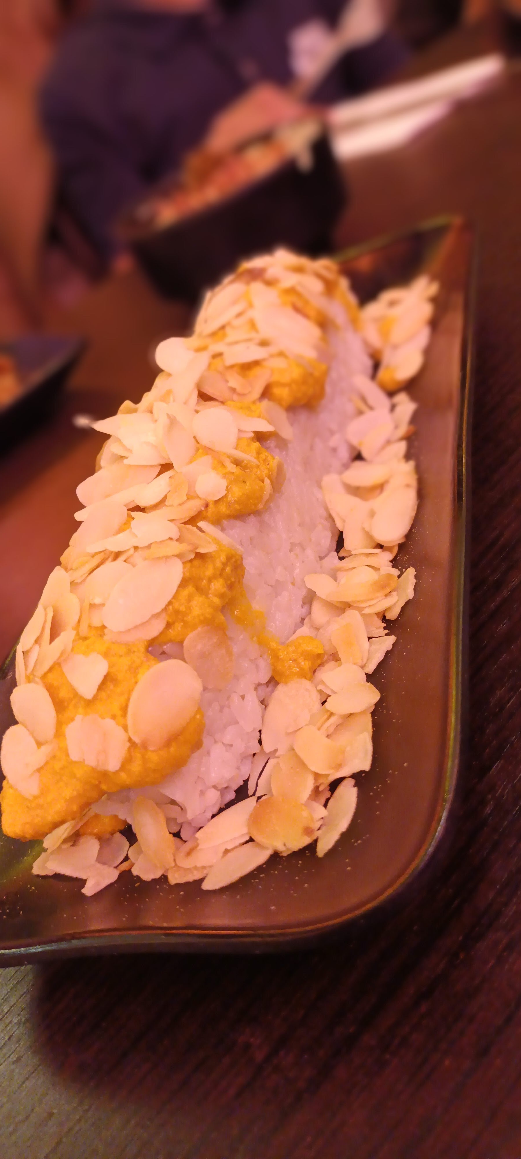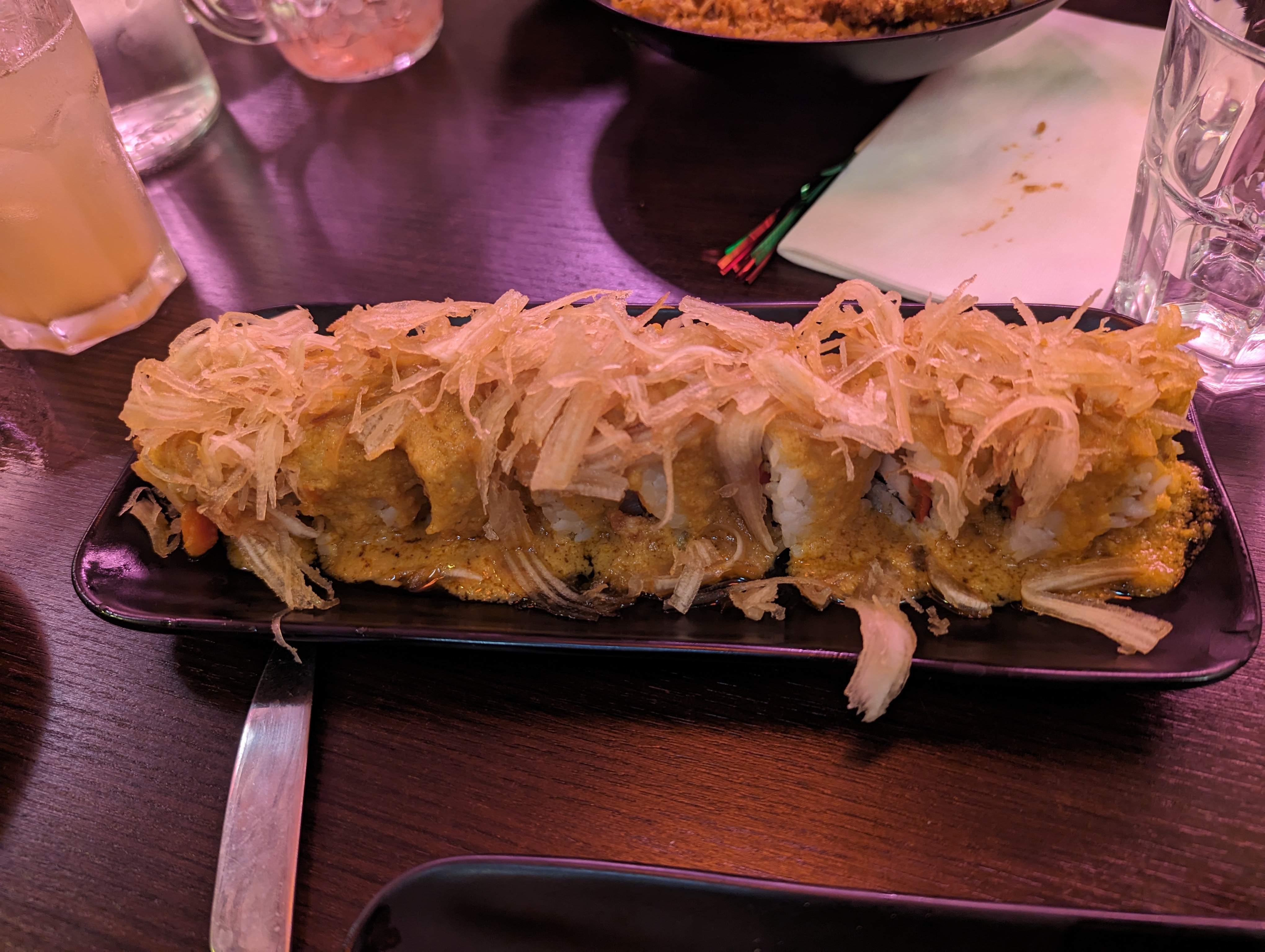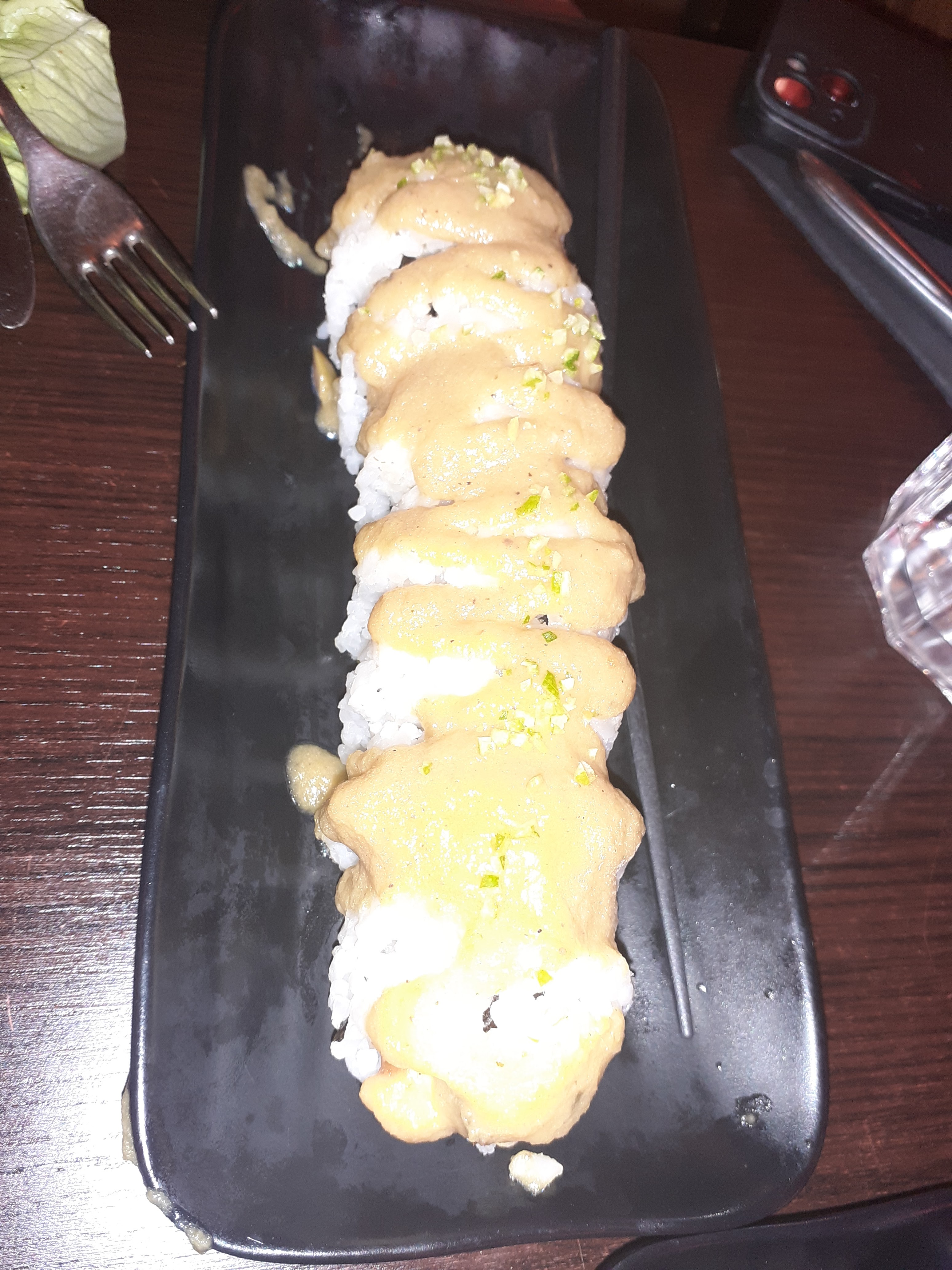La cuisine est assez spéciale et pour le coup pas à notre goût... Déçus de notre expérience mais la cuisine est très bien réalisée mais l'association des produits originale. Cependant, il était rempli dès l'ouverture donc je pense que les personnes qui aiment ce type de cuisine sont conquis par ce restaurant. *si notre avis est pris en compte, je me permettrais de dire que la sauce au dessus des california n'était pas nécessaire mais elle aurait pu être dans un bol à part.