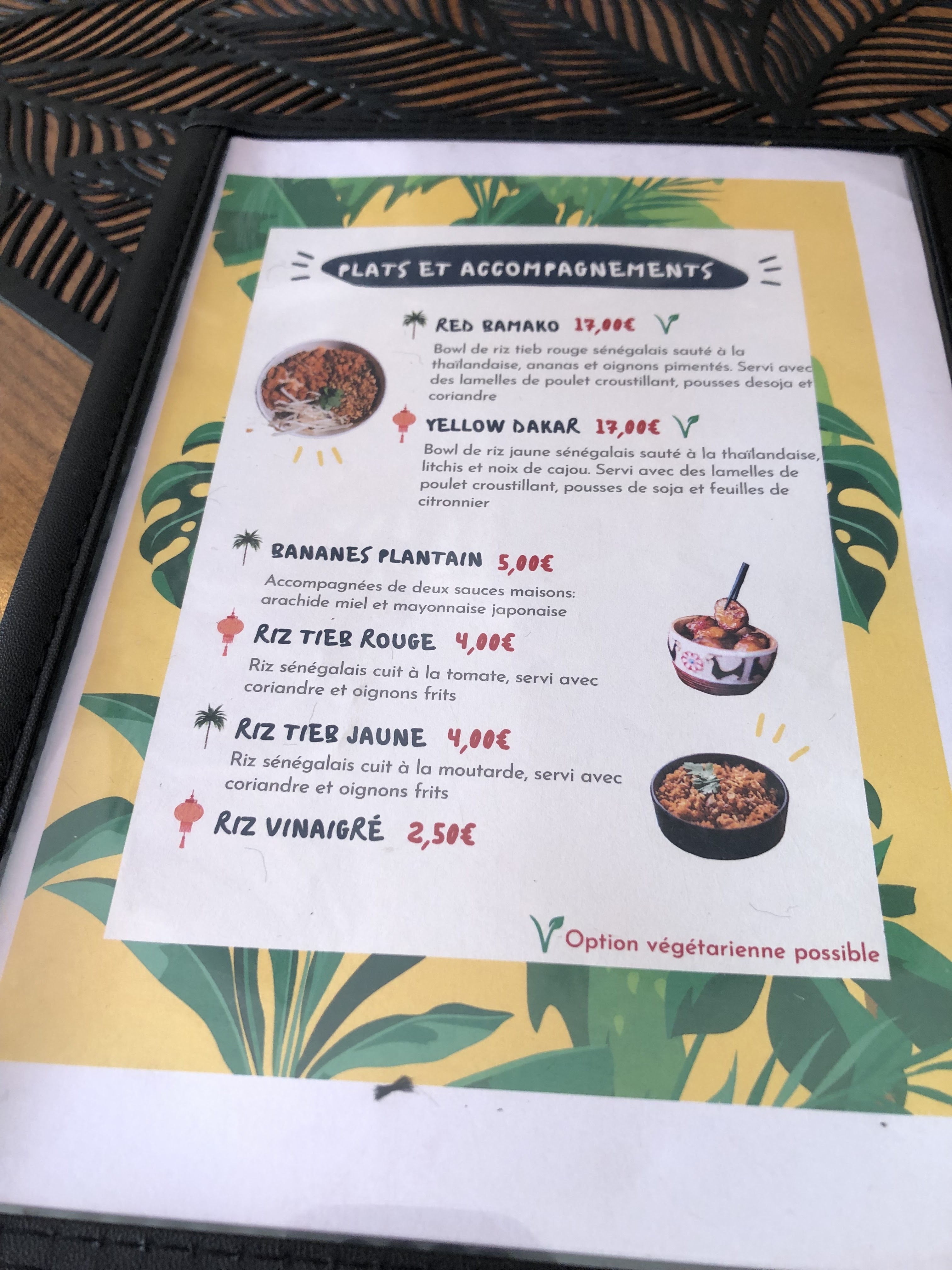 Menus changeant d'un établissement à un autre, très bon mélange Asie / Afrique
