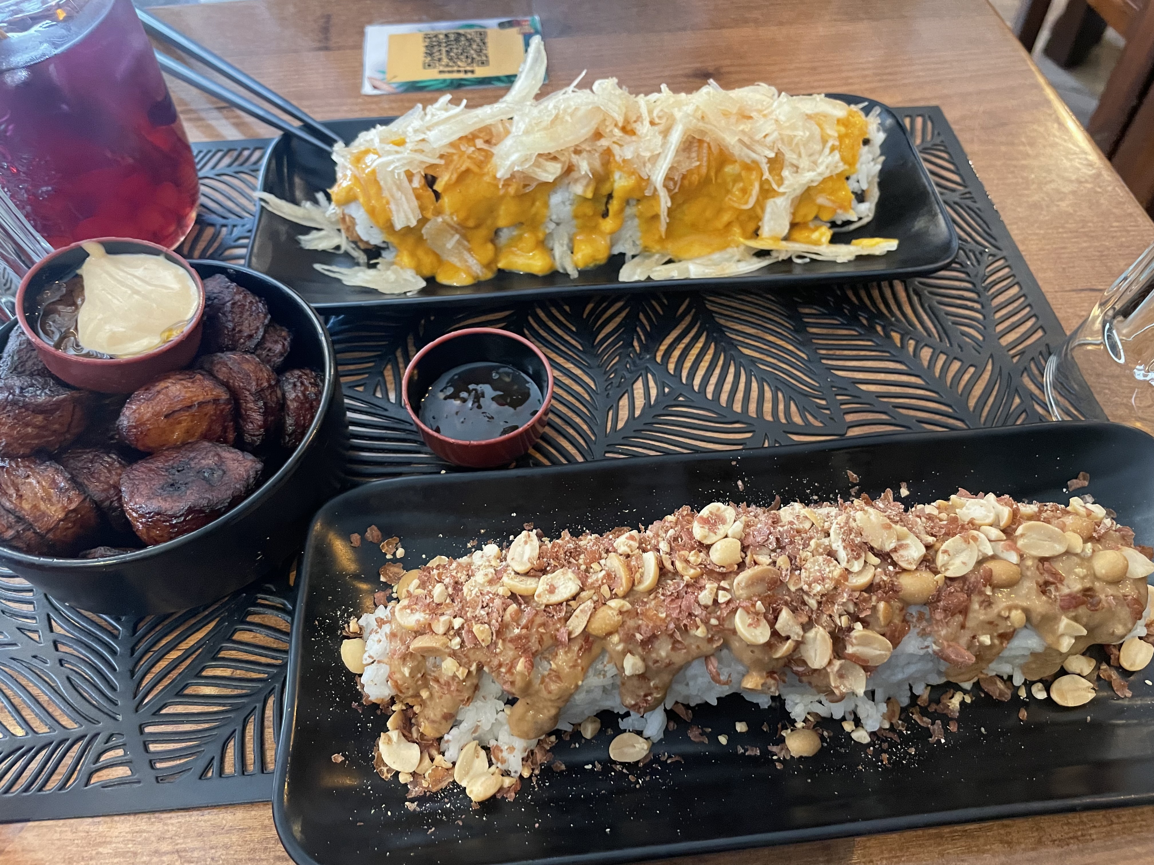 Nous avions réservé pour 12h45 - on a été installées 1h plus tard car la salle du bas n’était pas climatisée et que la terrasse sans parasol avec un bébé de 6 mois c’est pas terrible… Je vais rejoindre les nombreux avis : Coté cuisine: les plats manquent de goût et la fusion est parfois même désagréable les produits se sont pas de qualité et cela se voit car le cuisinier a la main lourde Sur les ingrédients décoratifs.. le poulet croustillant n’est pas bon.. Pour le prix des 8 California a 12,50 minimum il s’agirait de faire un effort sur les fournisseurs.. Le service: Formez l’équipe ? A l’accueil et la gestion ? Un groupe de 6 personnes a bloqué une table juste pour profiter de la climatisation alors que nous étions avec un enfant - je me suis retenue car cela n’est pas du fait de l’équipe..heureusement un serveur et une serveuse agréable et plein de bonne volonté ont géré notre service mais essayez par exemple de leur filer une prime pour l’entretien de leur tenue de travail Pour un si bon concept et de si jolis locaux spacieux il faudrait faire des efforts et miser sur la qualité des mets et du service car sur les réseaux sociaux on a l’impression que c’est incroyable et on est déçus … le seul point positif sont les bananes plantains … les cocktails sont excessivement chers pour rien… peut être le loyer ? Anyway nous avons été déçues
