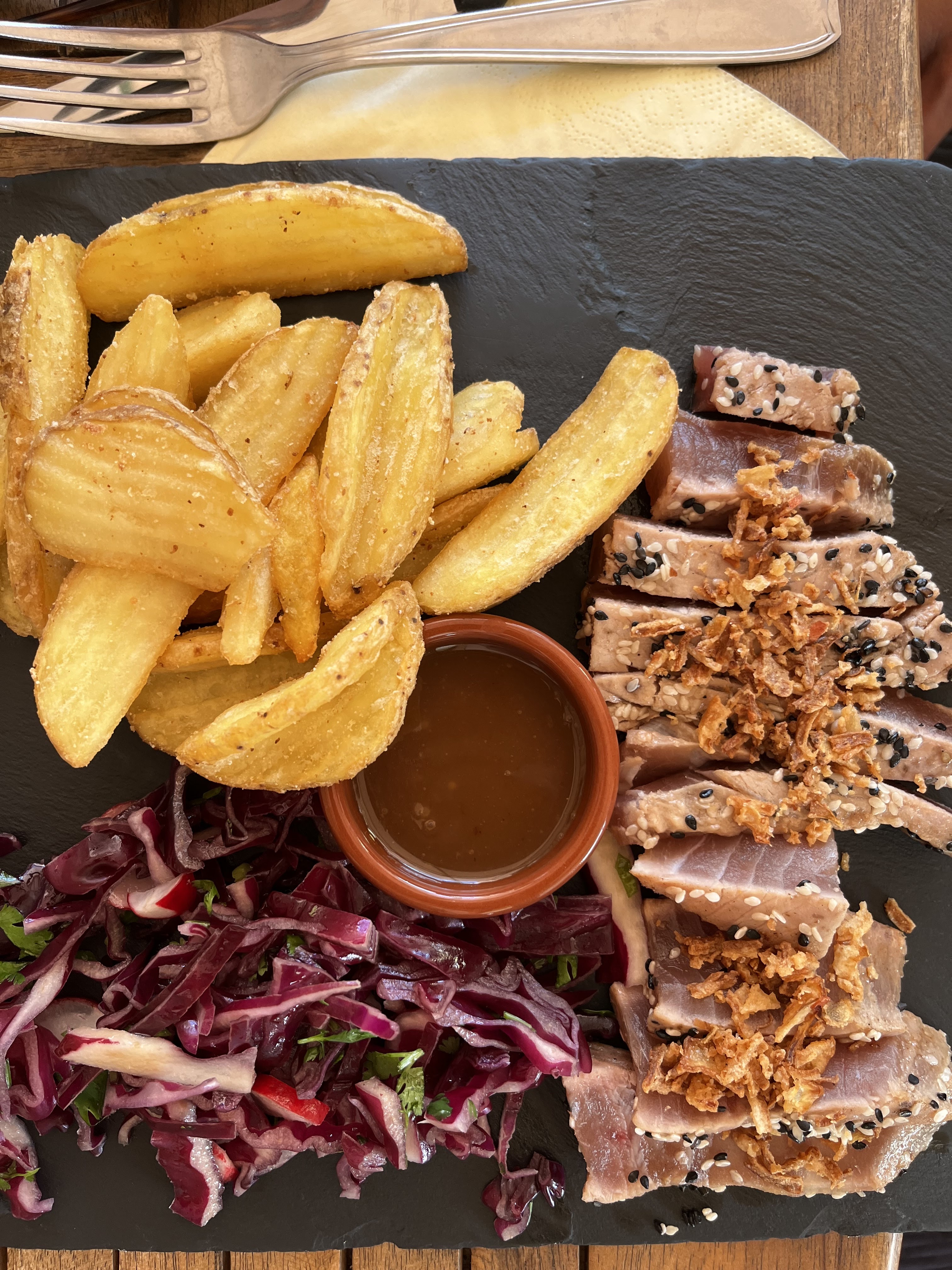 Venu avec ma femme hier soir pour des tapas, un steak de thon et une salade saumon mangue, c'était un régal ! L'équipe est au top ! Merci les petits jeunes d'avoir repris cet établissement. J'ai trouvé mon Qg de l'été ! 😎