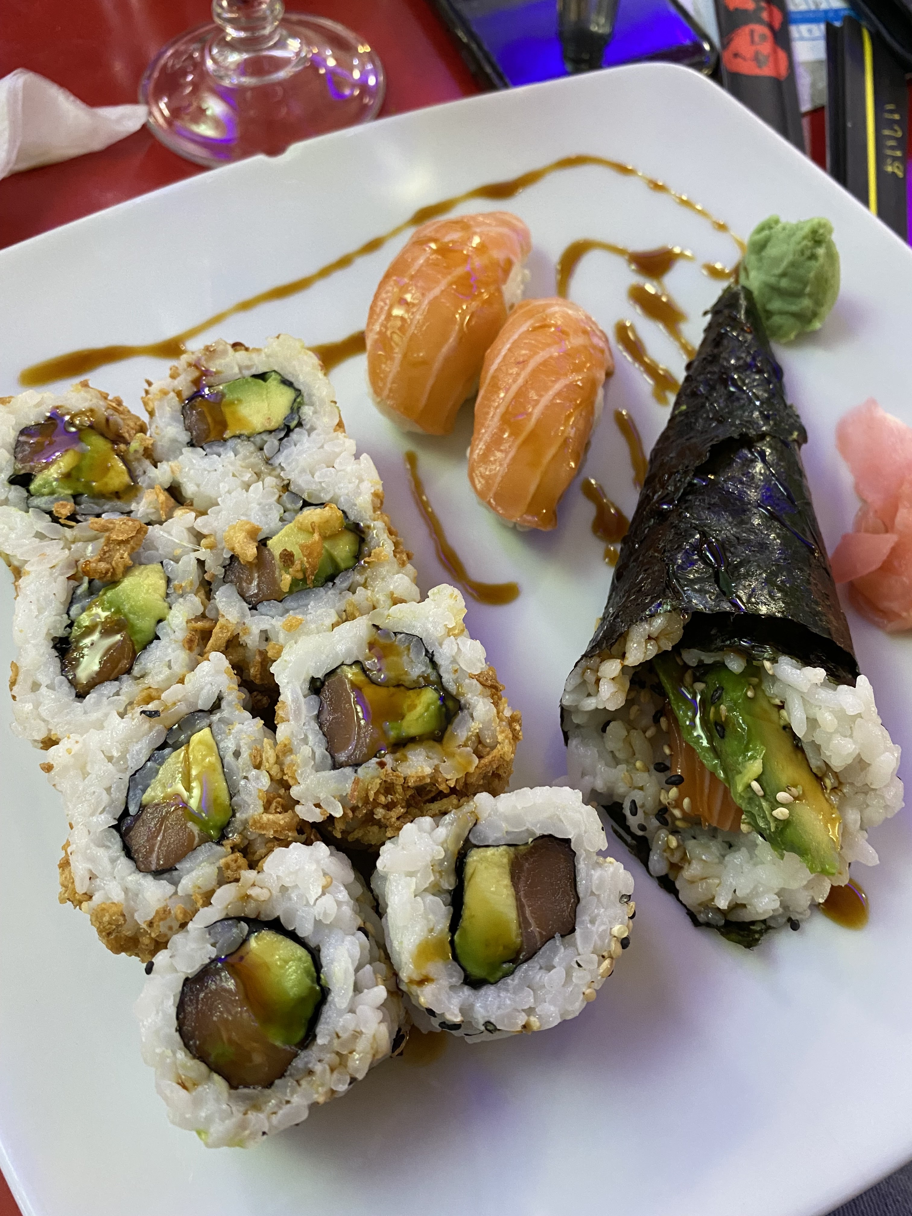 Idéal pour les fans de japonais car à volonté. Sushi sashimi maki brochettes miammmm. Les portions sont petites pour éviter le gaspillage. Le buffet est bien garni coté cuisine chinoise et côté dessert. Le restaurant est bruyant car pas mal de monde. Ne pas y aller trop tard si vous voulez avoir du choix. Le prix est très correct