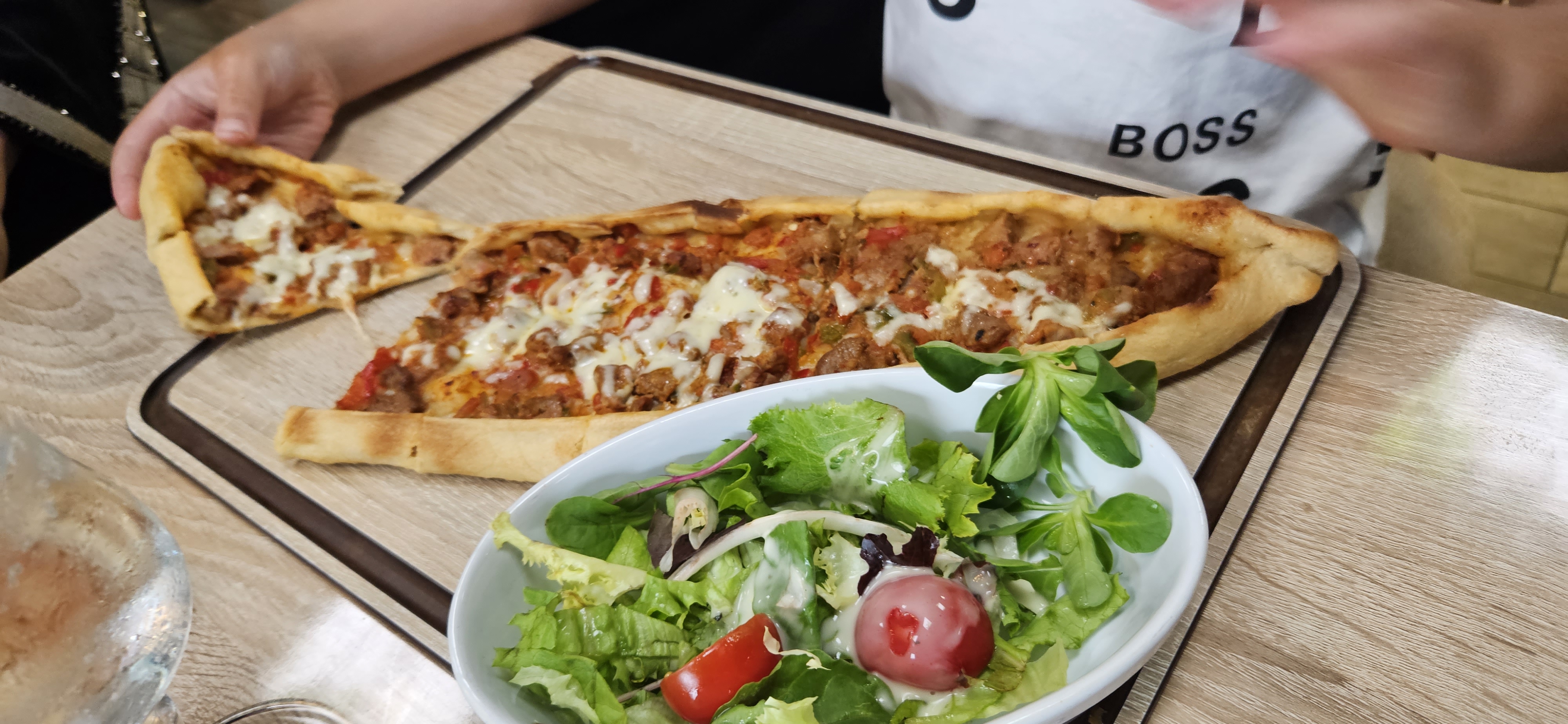 Nous y sommes allés ce midi avec ma femme, Nous avons commandé une entrée avec des cœurs d'artichauts, légumes et huile d'olive. Ensuite pizza turque au fromage pour ma femme et brochette de poulet accompagné de riz blé et frites pour moi. C'était très bon !!! L'ambiance est assez cosy et les serveurs sont très aimables. Nous reviendrons avec plaisir !!!