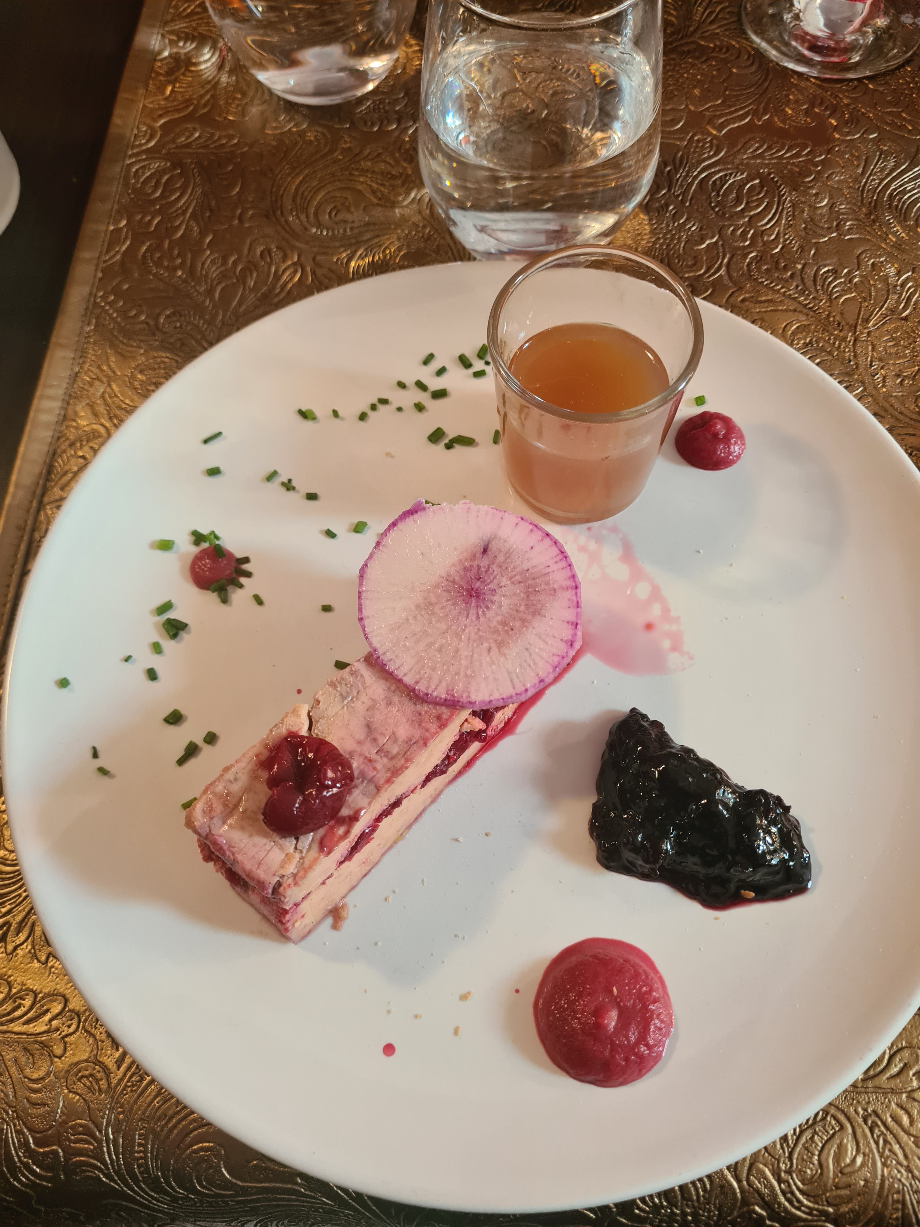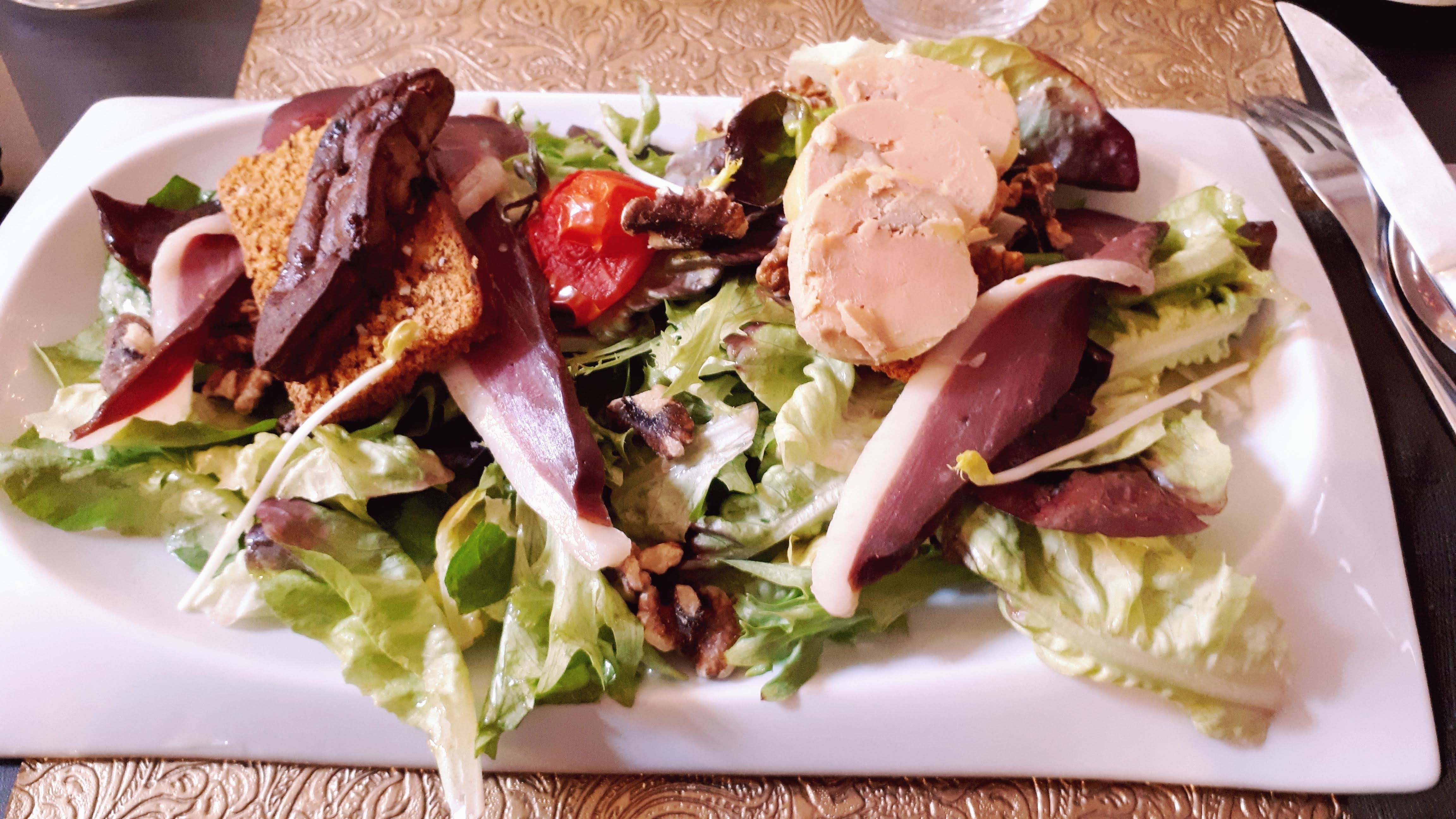 Hors de prix sans raison Lorsque nous sommes arrivés, il nous a été indiqué qu'il n'y avait qu'un seul menu ce soir là. Pas de souci pour nous. Mais de ce fait pas d'annonce de prix ni de carte. Nous ne nous sommes pas méfiés. L'assiette de l'entrée sortait du frigo, elle était gelée, il y avait encore la condensation sur l'assiette. De ce fait, tout son contenu etait tres froid, même le pain grillé ainsi que les 2 mini tranches de pain d'épices qui accompagnées les 2 tranches de foie gras. Puis vient le plat : c'était magret ou grande salade. Nous avons pris la grande salade : beaucoup de salade verte, quelques tomates, 2 tranches de jambon cru et une burratta. Aucun dessert ne nous a été proposé mais ça nous allait bien car nous n'avions pas très faim. La serveuse nous a aussi apporté une bouteille badoit toute poisseuse (pleine de confiture) et ne l'a pas ouverte (bouteille en verre avec capsule donc impossible à ouvrir sans outil). Le serveur a remédié à ce souci. Ce n'était pas un drame mais pas très pro. Bref après tout ça, nous passons à la caisse, pas spécialement déçus par le repas mais pas hyper emballés non plus et là c'est la douche froide : 41 € le menu entrée-plat !!! Et l'impression de se faire avoir vraiment comme des pigeons pour 2 tranches de foie gras et une salade, sans compter la badoie. Une vraie honte ce prix. Au moins 10€ de trop par menu. C'est la première fois de ma vie que je mets un avis défavorable mais vraiment là nous avons été scotchés. Bien sûr nous avons fait part de notre étonnement à la caisse, pensant à une erreur, mais il nous a été précisé que cela n'en était pas une et nous n'avons pas eu de geste commercial.