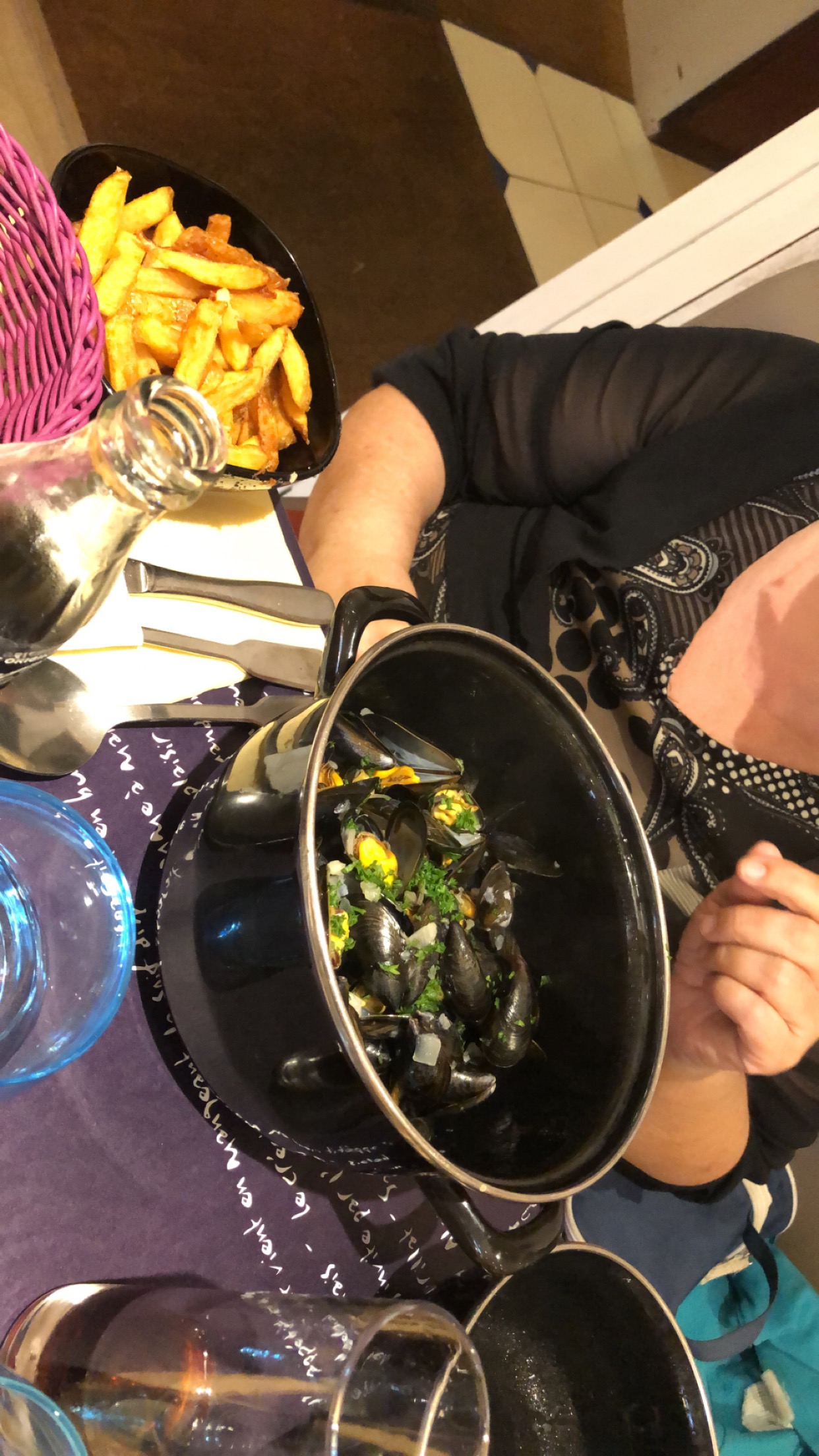 Excellentes mules et frites sur une jolie petite place