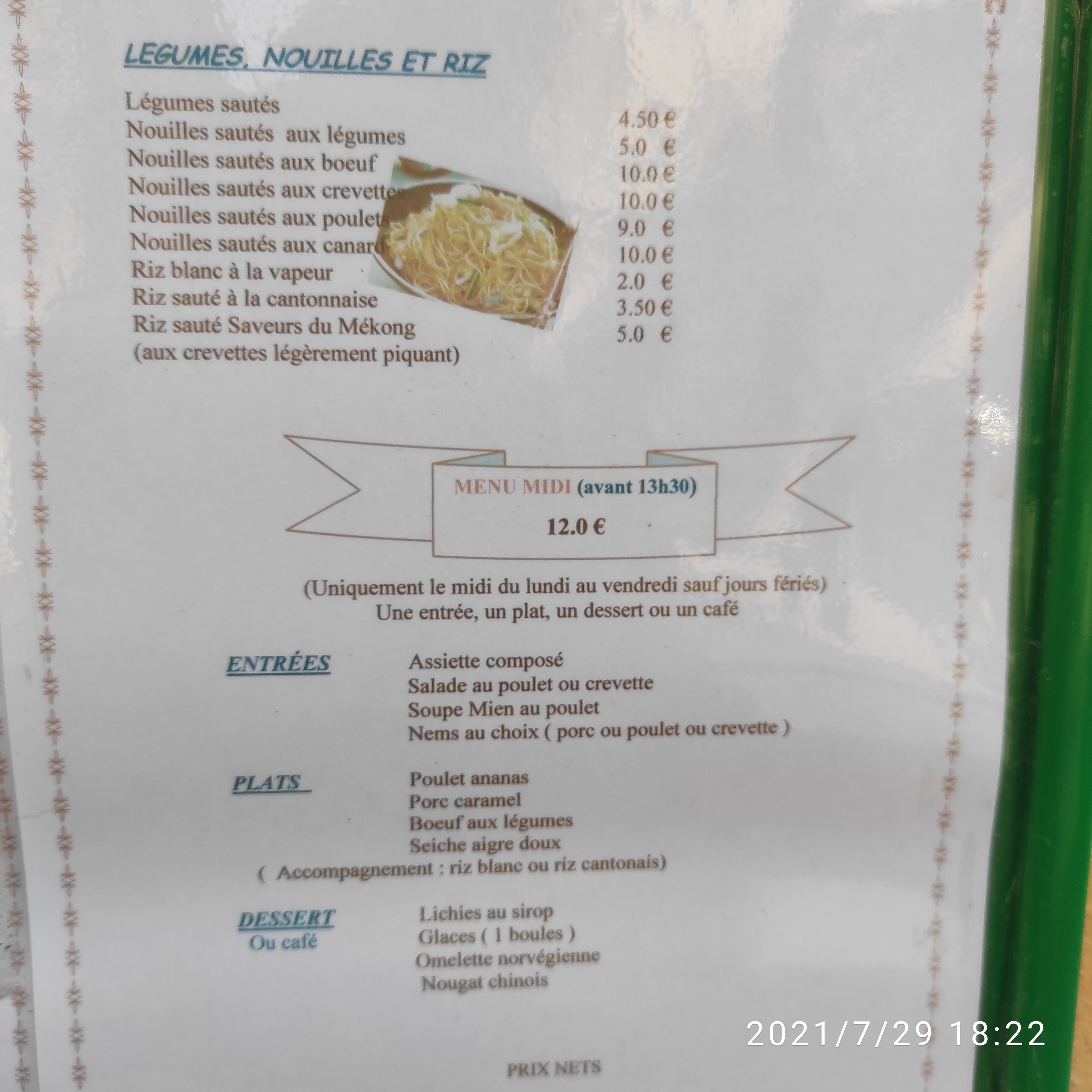 Je n'ai malheureusement pas eu le réflexe de prendre des photos. Cuisine chinoise traditionnelle, les plats sont copieux, un bon rapport qualité/ prix. Le personnel est réservé, gentil et à l'écoute. C'est ouvert tous les jours midi et soir sauf le mercredi.