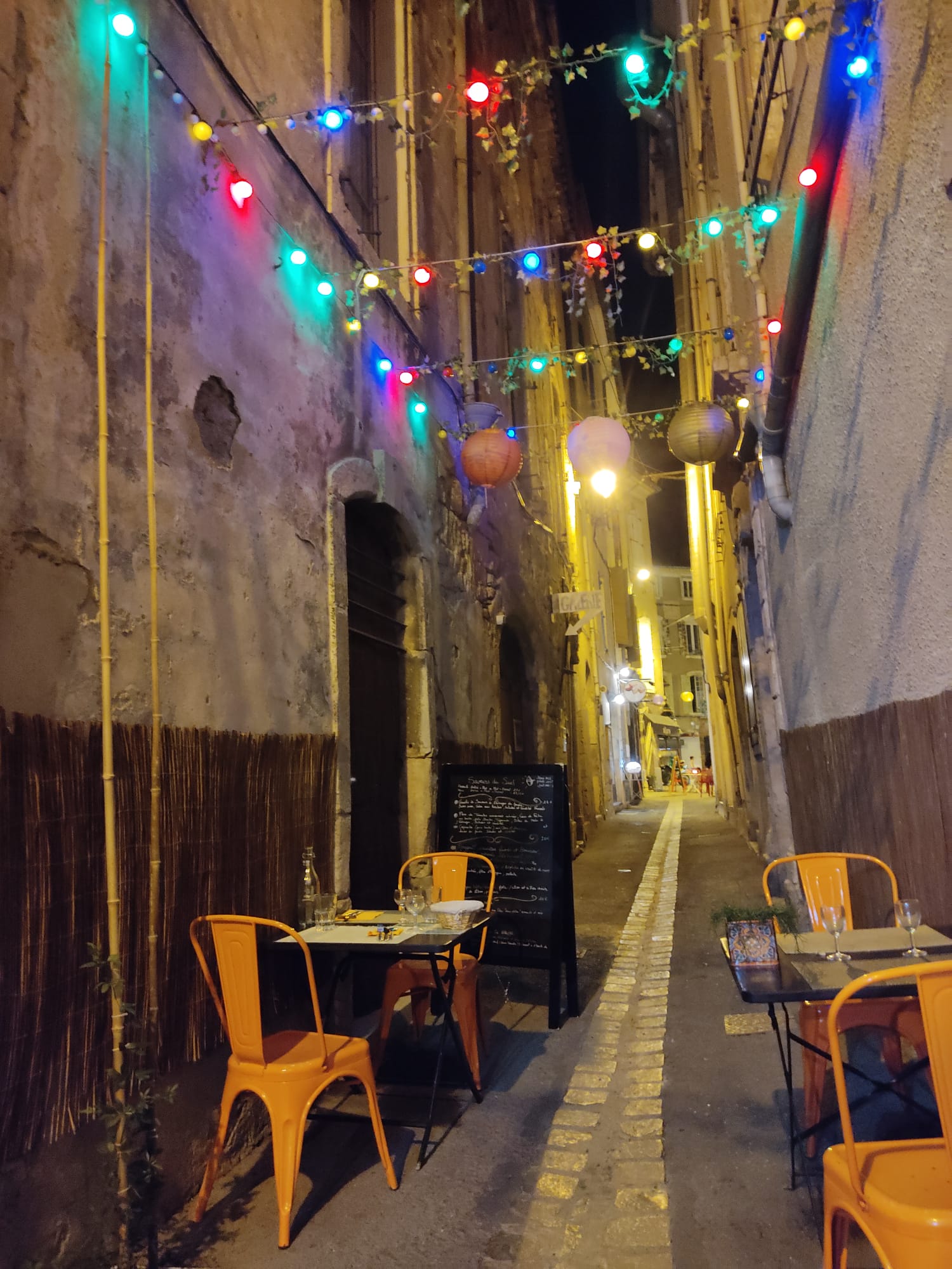 Ne vous laissez pas influencer par la ruelle ombragée et avancez vous : il y a un charmant patio et la cuisine y est très bonne et gouteuse! le service est dynamique, souriant, et plein de joie de vivre! Nous l'avons recommandé dès notre arrivée en famille!