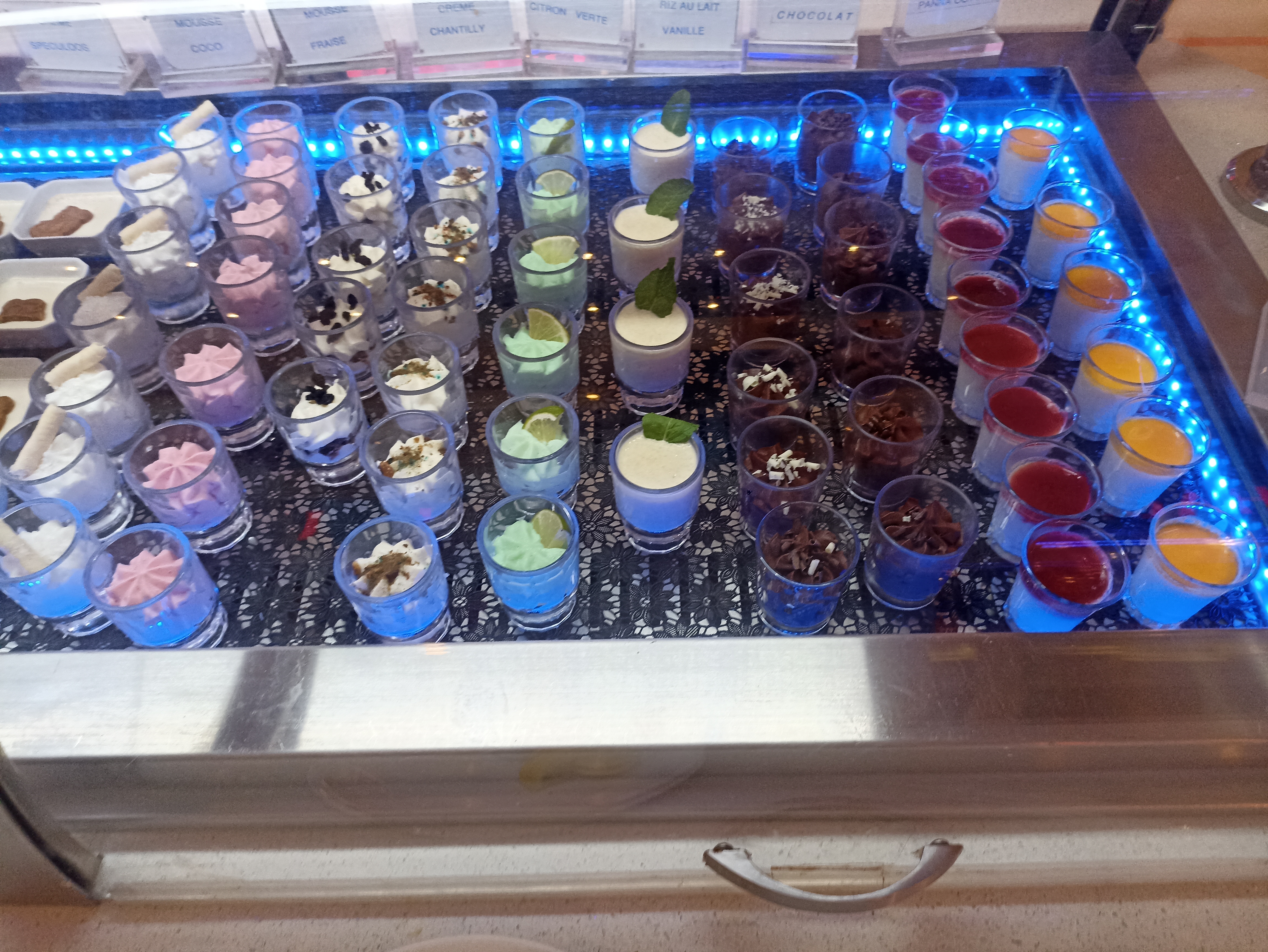 Très jolie lieu, belle verrerie, table spacieuse, lustres magnifiques... Le plus important, la nourriture : tout parfum de glace disponible, viande que l'on peut griller sur place, fruits de mer, notre friture de tous les jours, tiramisus, tartes... Et pour les plus sains il y a même des fruits et des légumes. Personnel efficace et chaleureux, à refaire !