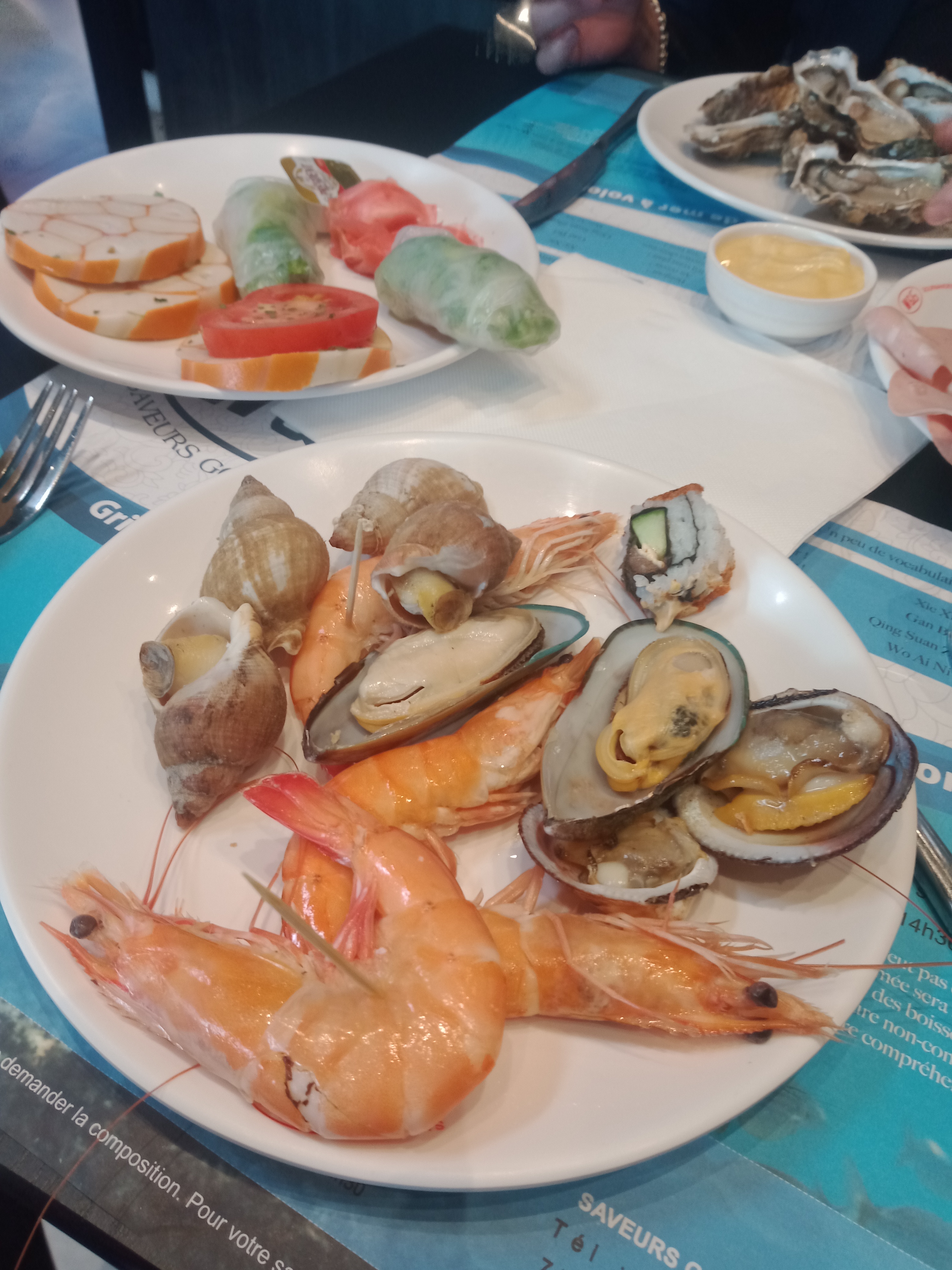 Première fois hier soir, table de 12 on s’est tous régalés. Tout est frais, Il y a un choix incroyable impossible de réussir à tout goûter !! Et quelle bonne surprise d’avoir eu des huîtres alors qu’on nous avait dit que ce n’était que le week end !! Tout petit bémol, les serveurs ne parlent pas trop bien le français du coup on peine à se faire comprendre ( pour l’aspartame par exemple ) On reviendra très souvent et on recommande à 100% !!