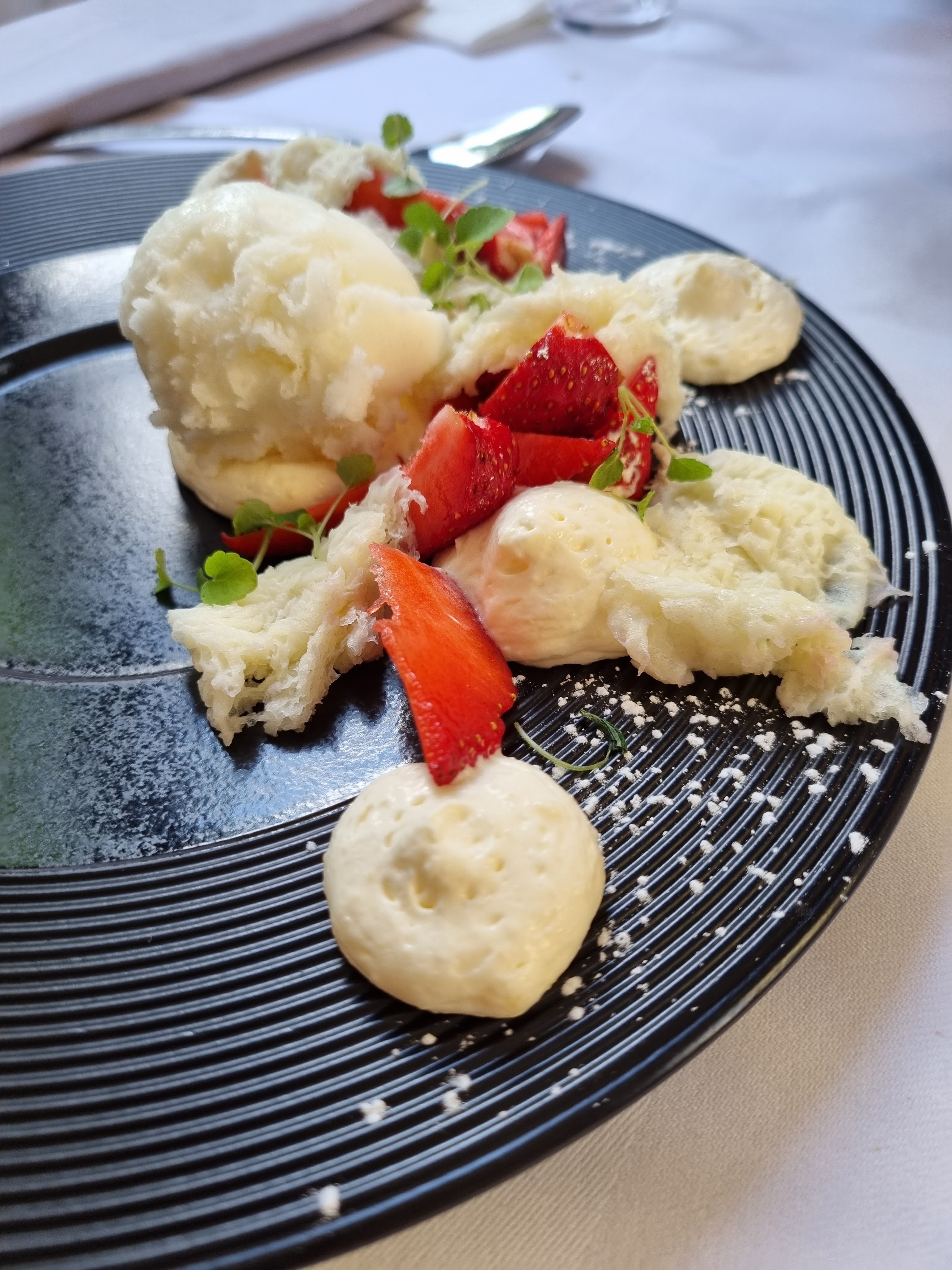 Très bien ! Et un 6 étoiles pour la tarte à la rhubarbe à la crème brûlée et sa boule de glace fraise.