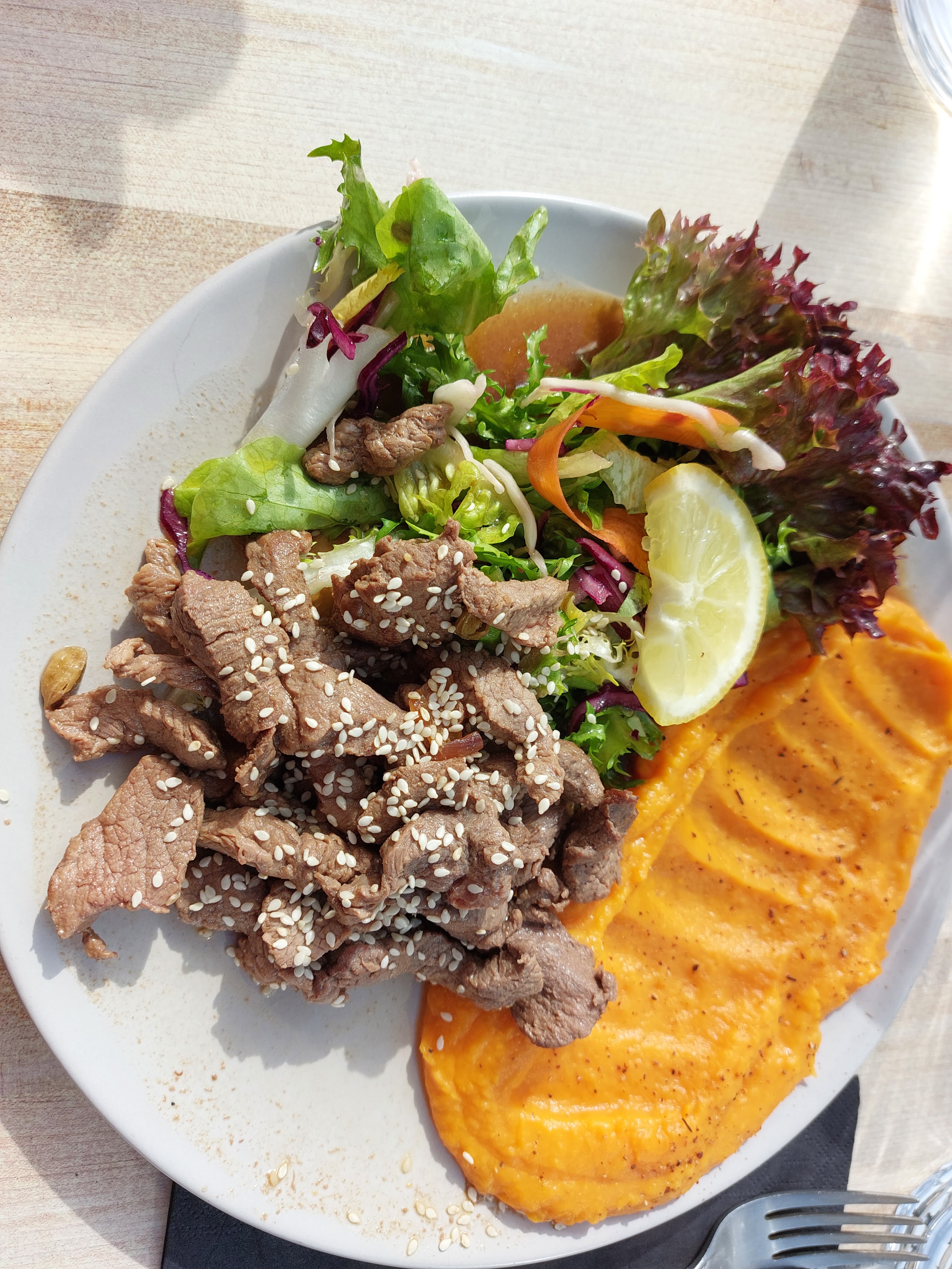 Excellent plats : différentes salades, burger. De qualité. Un service dynamique. Une attention pour les chiens 🙂 Merci !