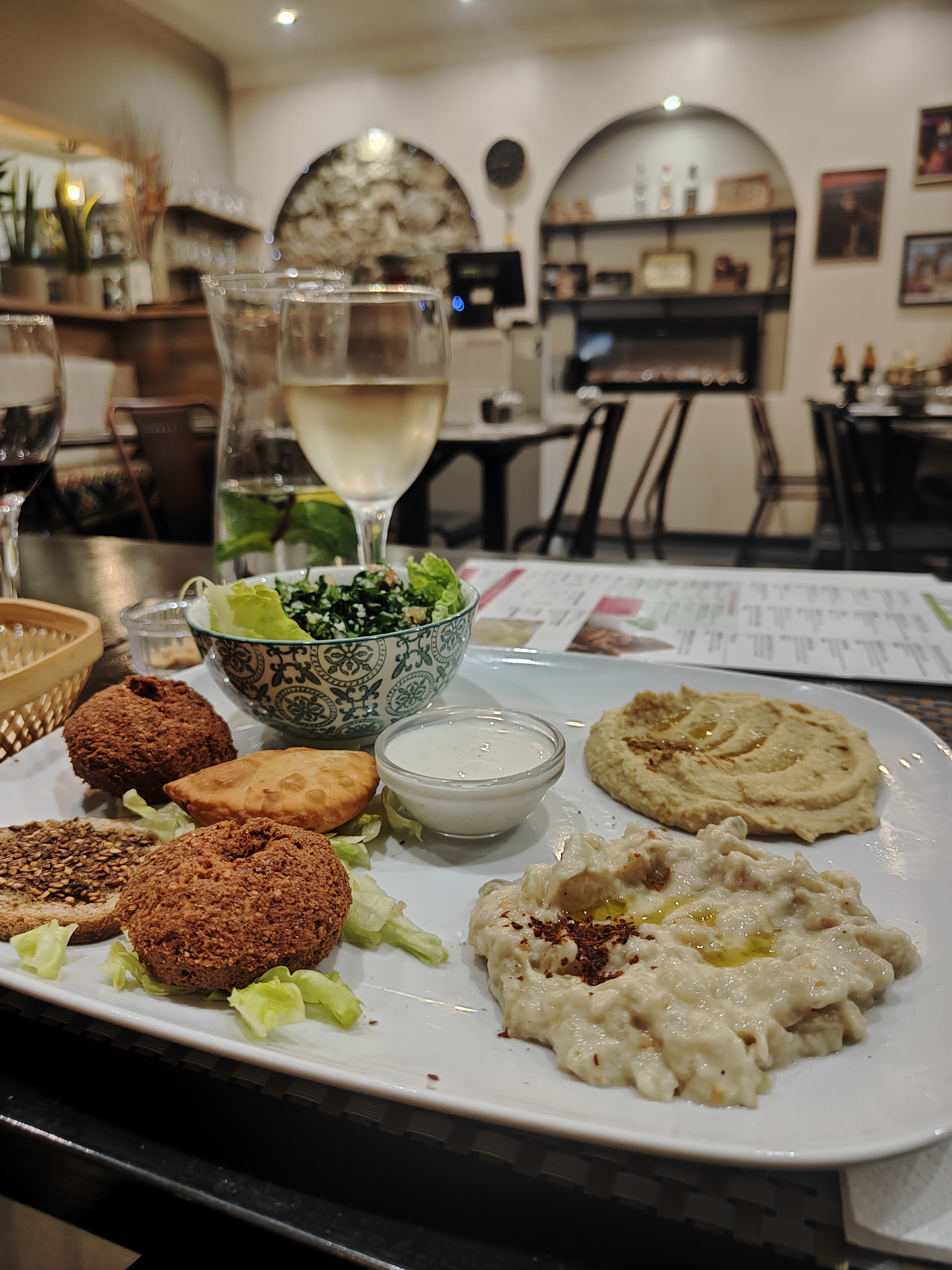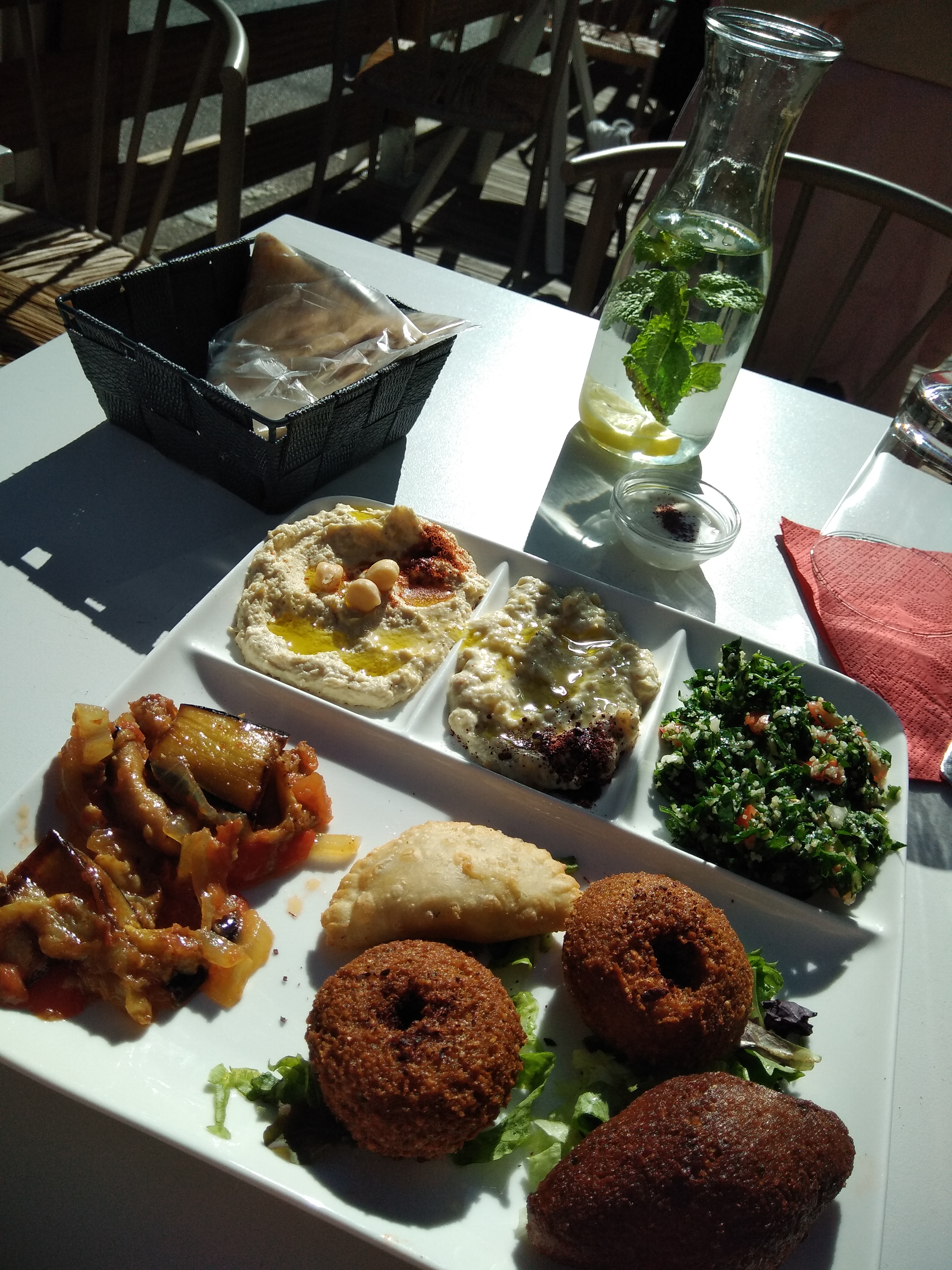 Excellents mezzés. Un peu déçu par le thé à la menthe, préparé avec un sachet de thé dans le verre.