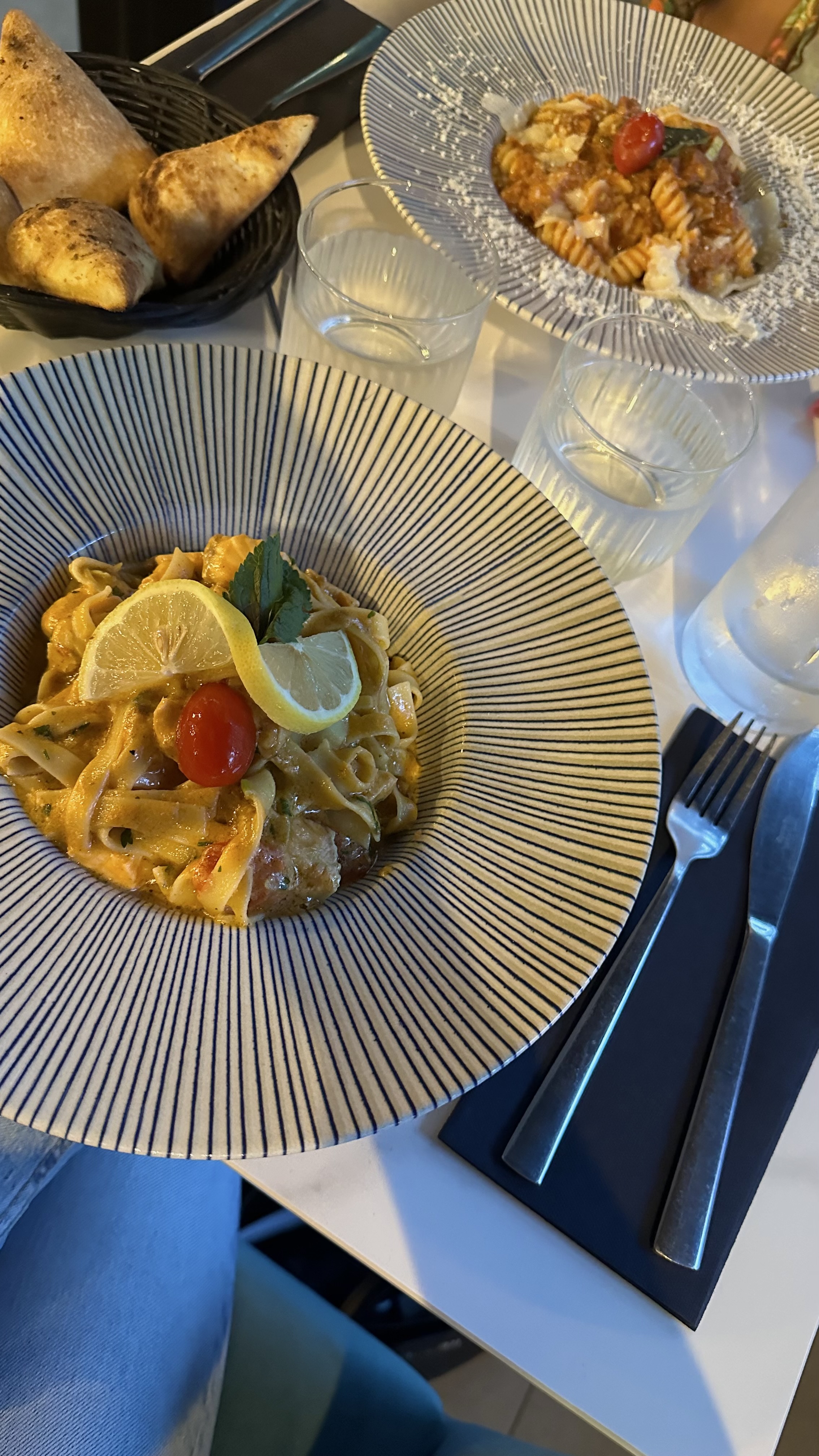 Les plats étaient excellents, préparés par un cuisinier italien que l’on pouvait apercevoir sortir quelques fois de sa cuisine, ce qui était un vrai plus, car déguster des plats confectionnés par un Italien ne pouvait que me rendre encore plus impatiente de savourer mon repas. Cependant, le service était très lent. Bien que nous ayons été les premières à entrer dans le restaurant, nous avons dû attendre plus de trente minutes pour nos plats, ce qui nous a frustrés et nous a même tentés de partir. Concernant l'ambiance, une table d'anniversaire était réservée non loin de nous, donc je vous laisse imaginer ce que nous avons vécus… Le jour de notre visite, il n'y avait pas de musique dans la salle, donc nous entendions les bavardages de nos chers camarades de table, ce qui ne nous a pas forcément dérangés, mais pourrait en déranger d'autres. Les pâtes étaient tout de même délicieuses, tout comme les petits pains. Malgré beaucoup d’améliorations à apporter, ce restaurant reste un lieu pas mal à découvrir. La fourchette de prix était de 10-20€, pour ma part j’ai pris des pâtes aux quatre fromage, si je ne me trompe pas. Bonne dégustation à vous ! ~