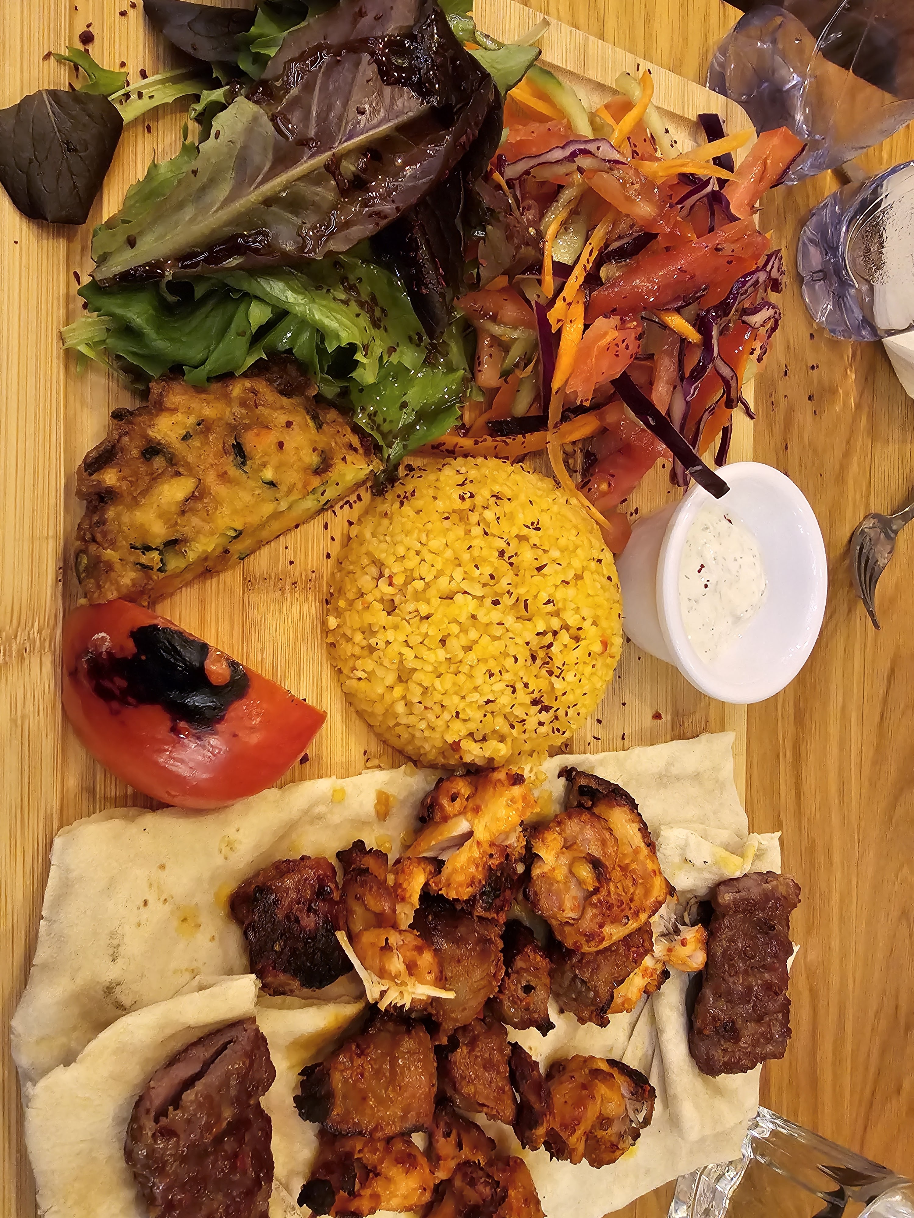 Accueil sympathique. Plats maison et frais. Choix restreint. C’est plutôt un gage de qualité. Vous avez le choix entre un dürüm ( kebab où le pain, comme pour la pita grecque, est remplacé par une galette) et une assiette avec galette,viande, crudités et boulgour. La viande est tendre et bien assaisonnée. La galette, froide et pâteuse ( je ne l’ai pas mangée). Le boulgour et les crudités manquent sérieusement d’assaisonnement. Près de 20€ tout de même… Un seul dessert : 3 mini bouchées de baklava pour 6€. C’est vraiment trop cher !