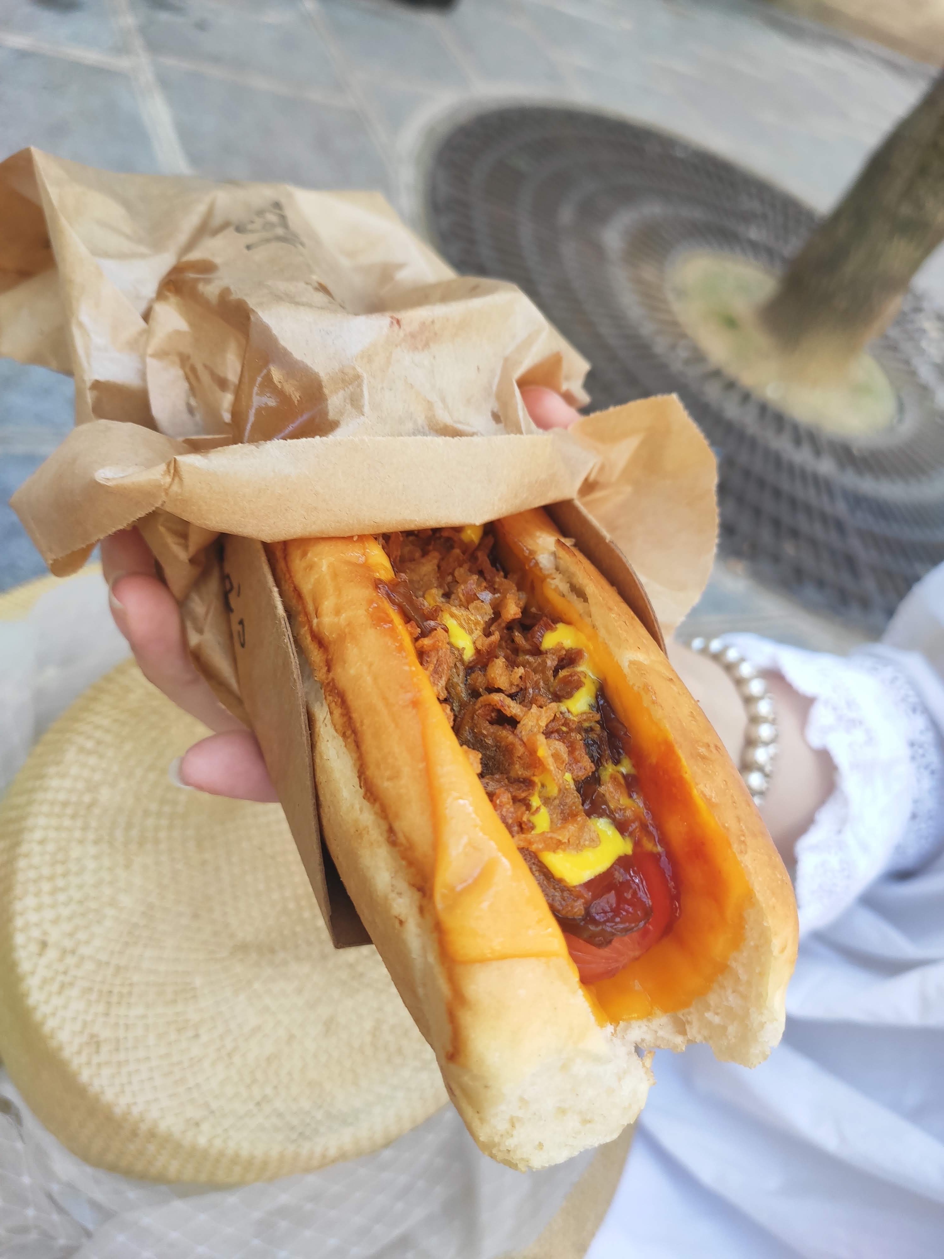Excellent Hot dog à emporter, idéal pour un petit creux.
