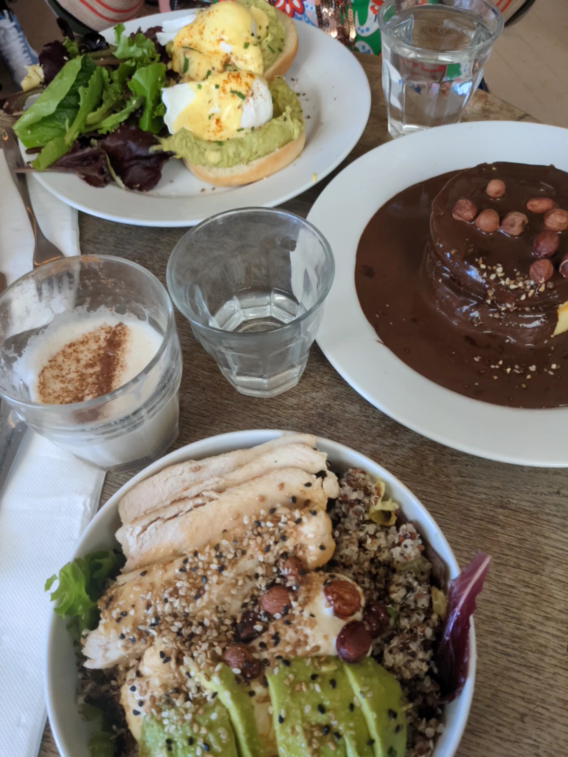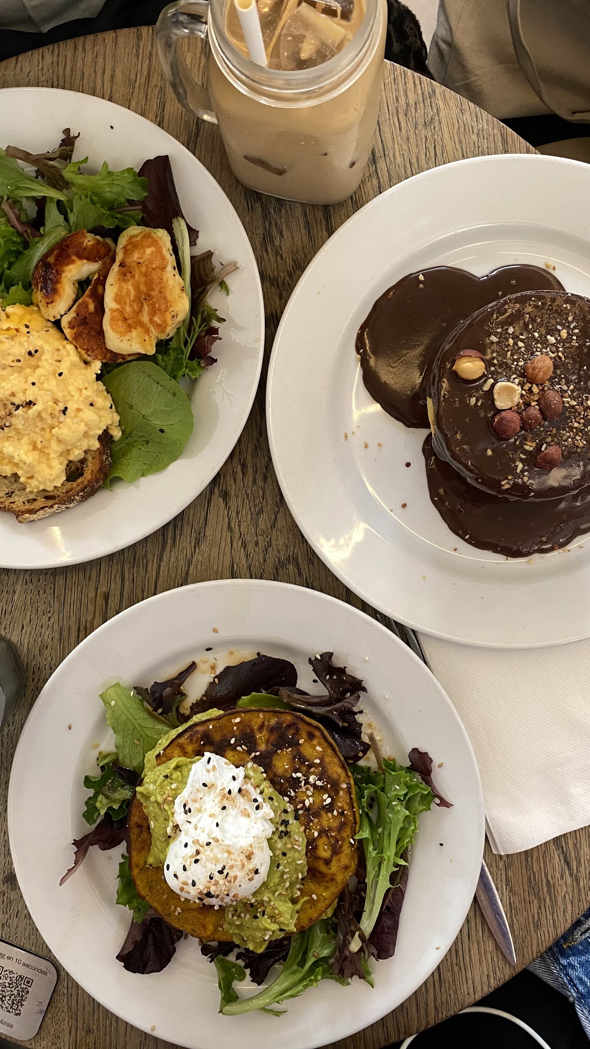 Très moyen, un peu déçue car les plats ne sont pas à la hauteur de la réputation. On nous a servi les plats, sauf qu'il n'y avait plus de couteaux disponibles donc on a dû attendre qu'ils arrivent pour pouvoir manger. On est trop assis les uns sur les autres... J'ai bien aimé les pancakes à la patate douce, en revanche, les oeufs brouillés étaient très basiques et l'halloumi beaucoup trop sec. Je n'ai pas aimé le pain du toast à l'avocat, qui était mou et fade. Dommage qu'il n'y ait pas plus de noisettes et pralin sur les pancakes.