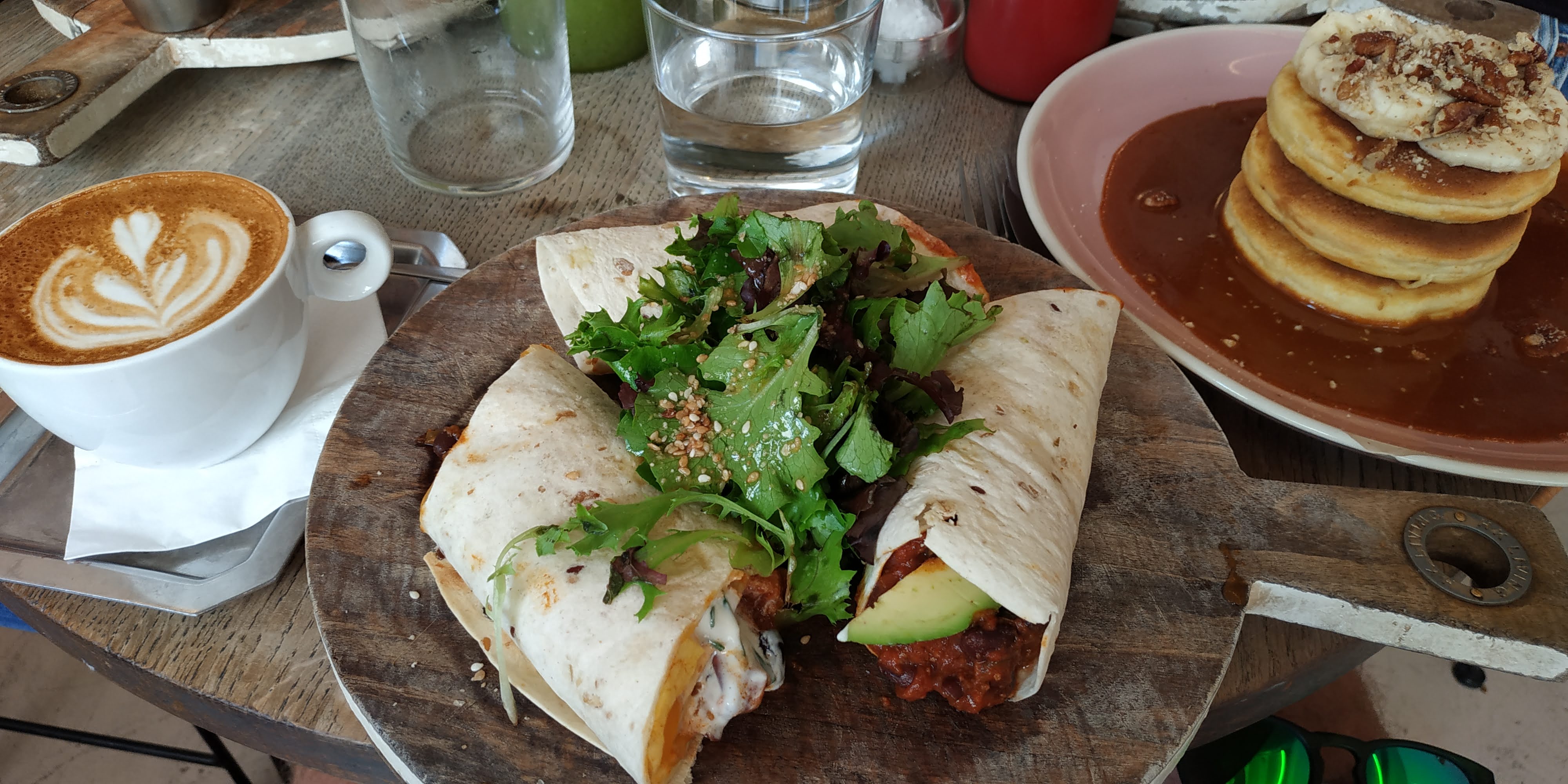 Victime de son succès, il y a souvent de l'attente, mais rien d'insurmontable. Le service est efficace et la carte plutôt original pour un coffee shop. Il n'y a pas que des avocado toasts. J'ai pris un flat white (désolé pour la photo pixelisée, bug tel) double dose de café 🤪 Ensuite burrito, bon, un peu épicé, entre le classique et le breakfast burrito, pas mal, sans être le meilleur que j'ai mangé, mais bon hein ! Sinon les pancakes sont bien épais et moelleux, et bons, avec différents styles/garnitures qui matchent bien. Le banana bread était yummy avec sa crème mascarpone au café, même si le goût café était malheureusement trop léger, voire imperceptible pour moi. Ma femme a dit le sentir tout de même, à chacun son palais... Les jus sont très bons, bien dosés, bonnes associations 😋
