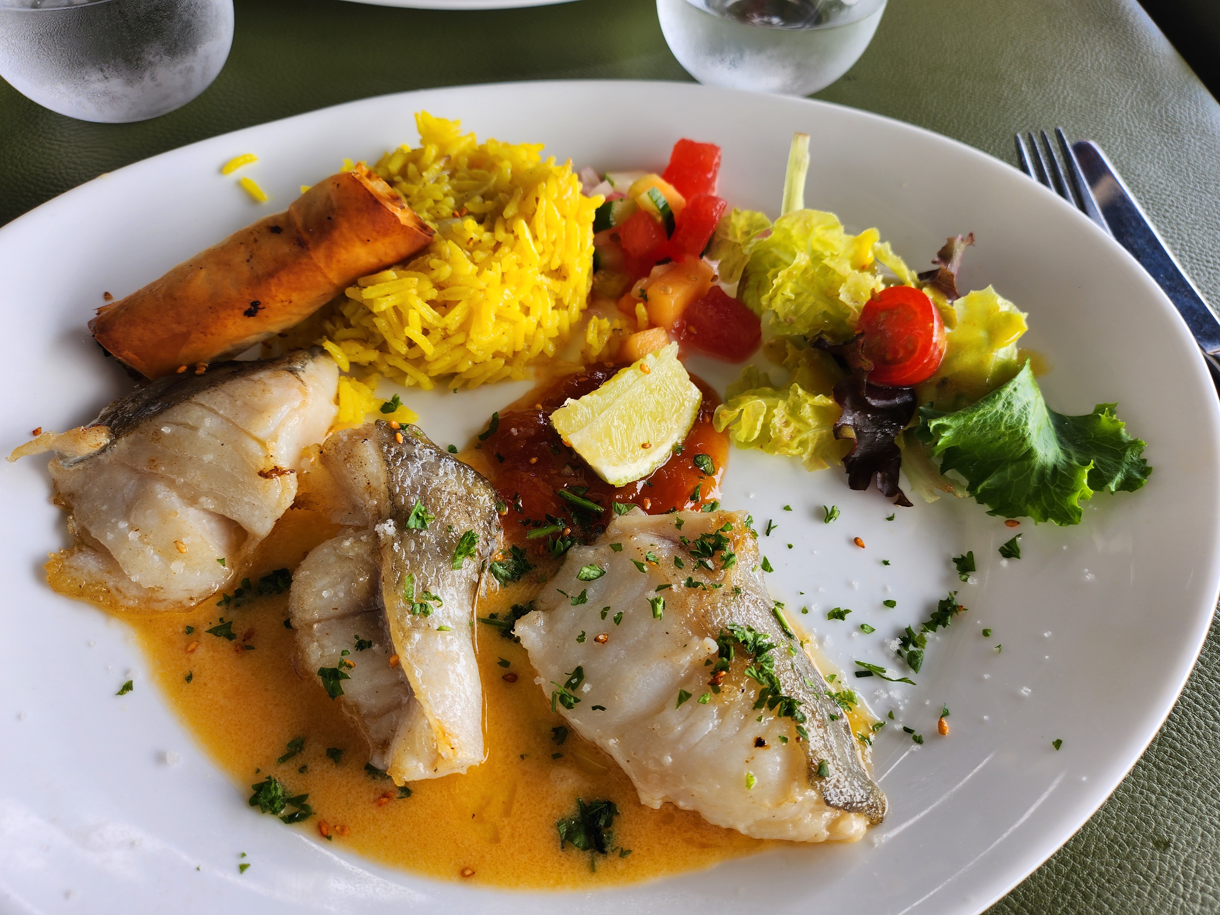 Plats de poissons avec légères présences d'épices et juste cuisson. Nous avons passé un très bon moment.
