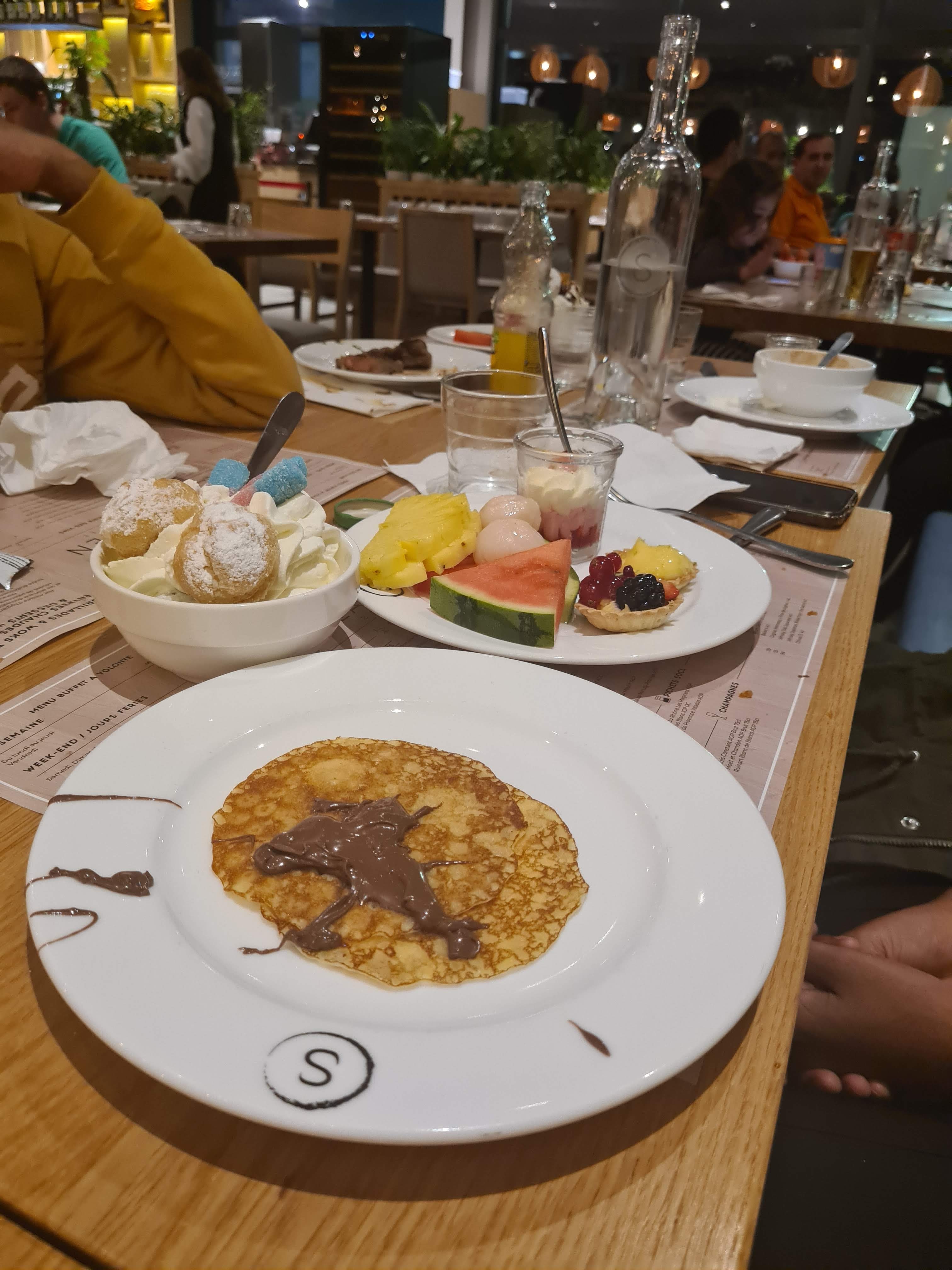 Une offre rare dans ces endroits 😊 C’est comme si vous dîniez dans un hôtel 5* tout compris en Turquie. Un très grand choix de plats, snacks, desserts, douceurs, fruits de mer, sushis, viandes. Vous payez à l'hôtel les boissons (sauf l'eau), mais les prix sont très bas. Un buffet pour une personne coûte 26 euros. Le restaurant est très lumineux et spacieux, avec des fenêtres panoramiques et une vue sur les montagnes.