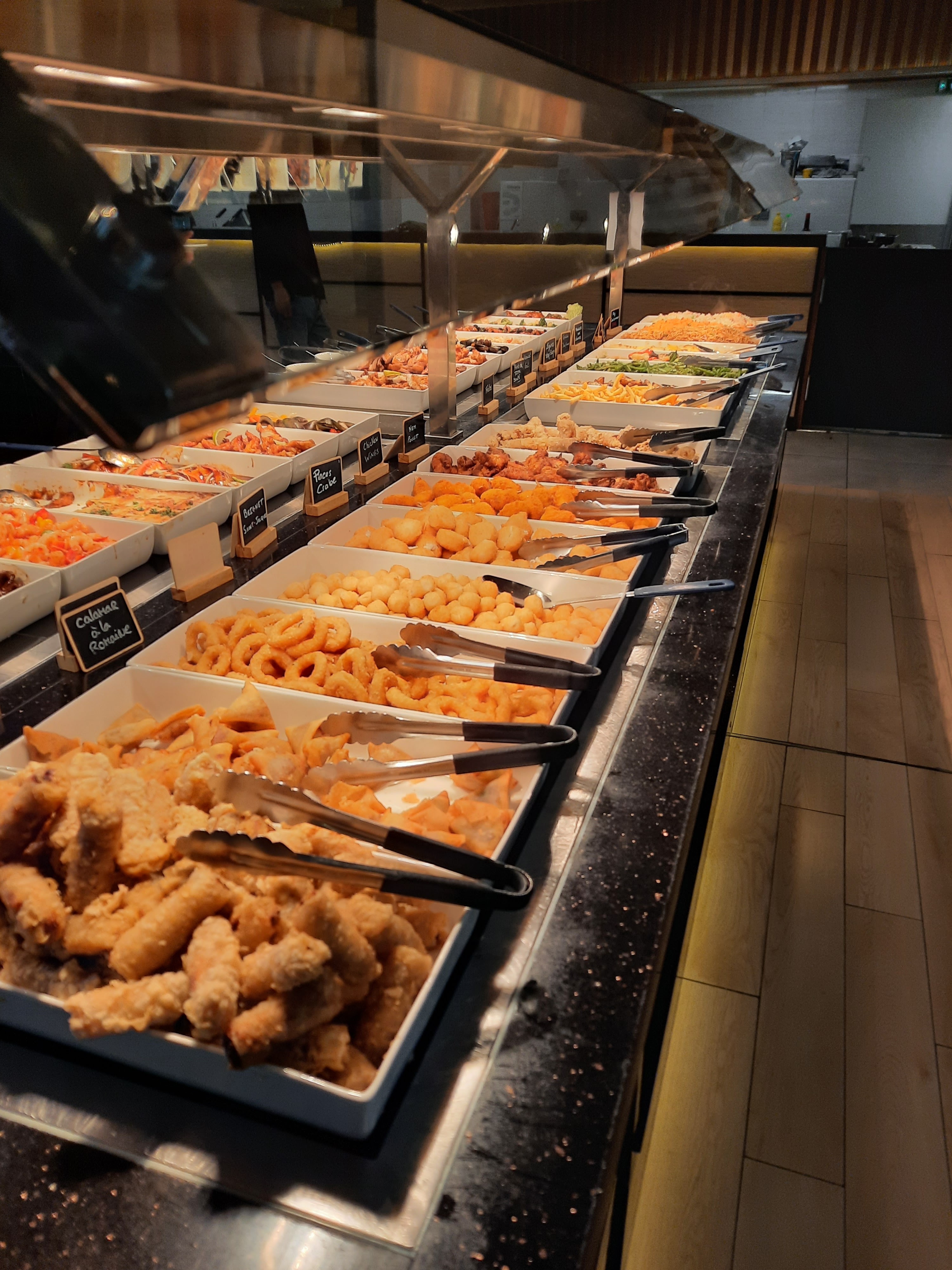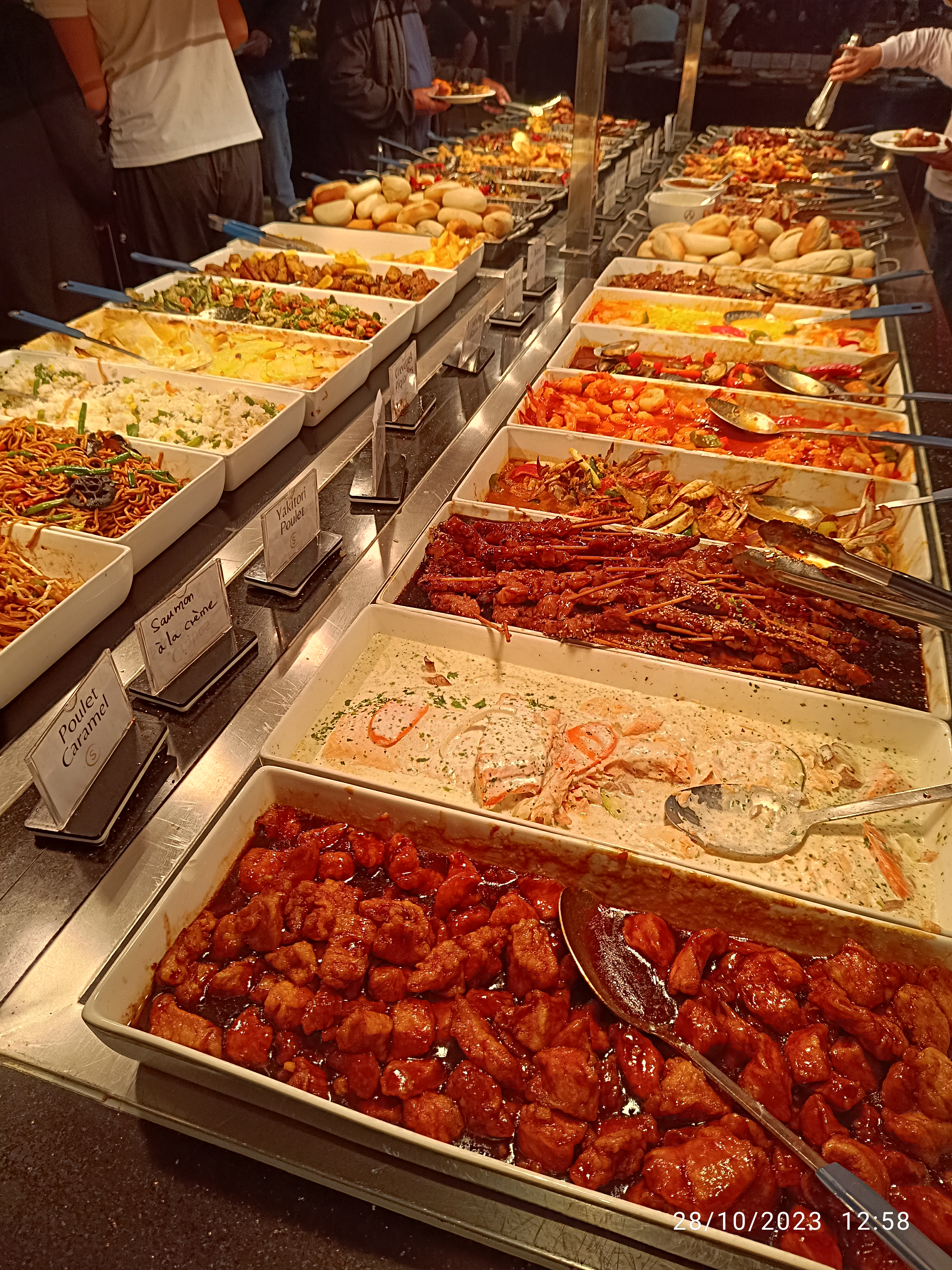 Très très grand buffet divers et varié dans ce restaurant avec une immense salle, à déconseiller aux personnes qui n’aiment pas les endroits trop bruyants avec beaucoup de monde. La nourriture est bonne pour un prix normal pour un buffet à volonté. Pas possible de réserver le week-end, mais on arrive à avoir une table pour 2 assez vite, pour plus nombreux prévoir davantage d’attente. En revanche, nous avons mangé avec toutes nos assiettes sales du repas car les serveurs ne débarrassent pas qu’au fur et à mesure, dommage.