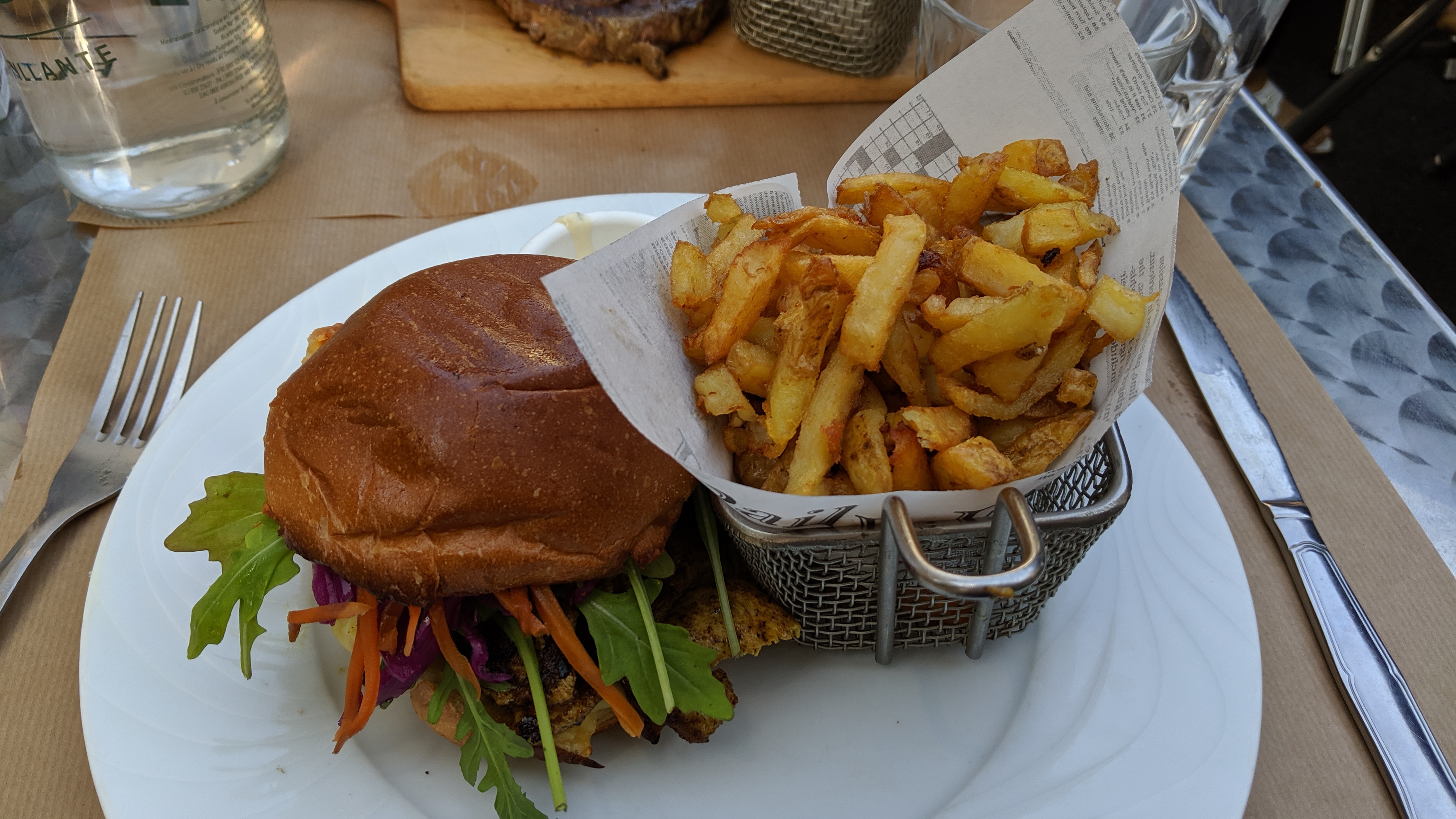 Terrasse charmante bien qu'un peu serrée, le menu n'était pas à jour sur le site, nous n'avons donc pas pu tenter la fondue au fromage ni le risotto champignons que nous avions repéré, nous nous sommes rabattus sur les burgers végé, mais qui n'étaient malheureusement plus disponibles ce soir-là. J'ai été personnellement déçu par le burger tout fromage que j'ai trouvé fade, mon amie a apprécié le burger poulet, bien que le poulet soit reconstitué et donc d'une qualité moindre. Dommage pour une première visite, nous n'y retournerons pas.