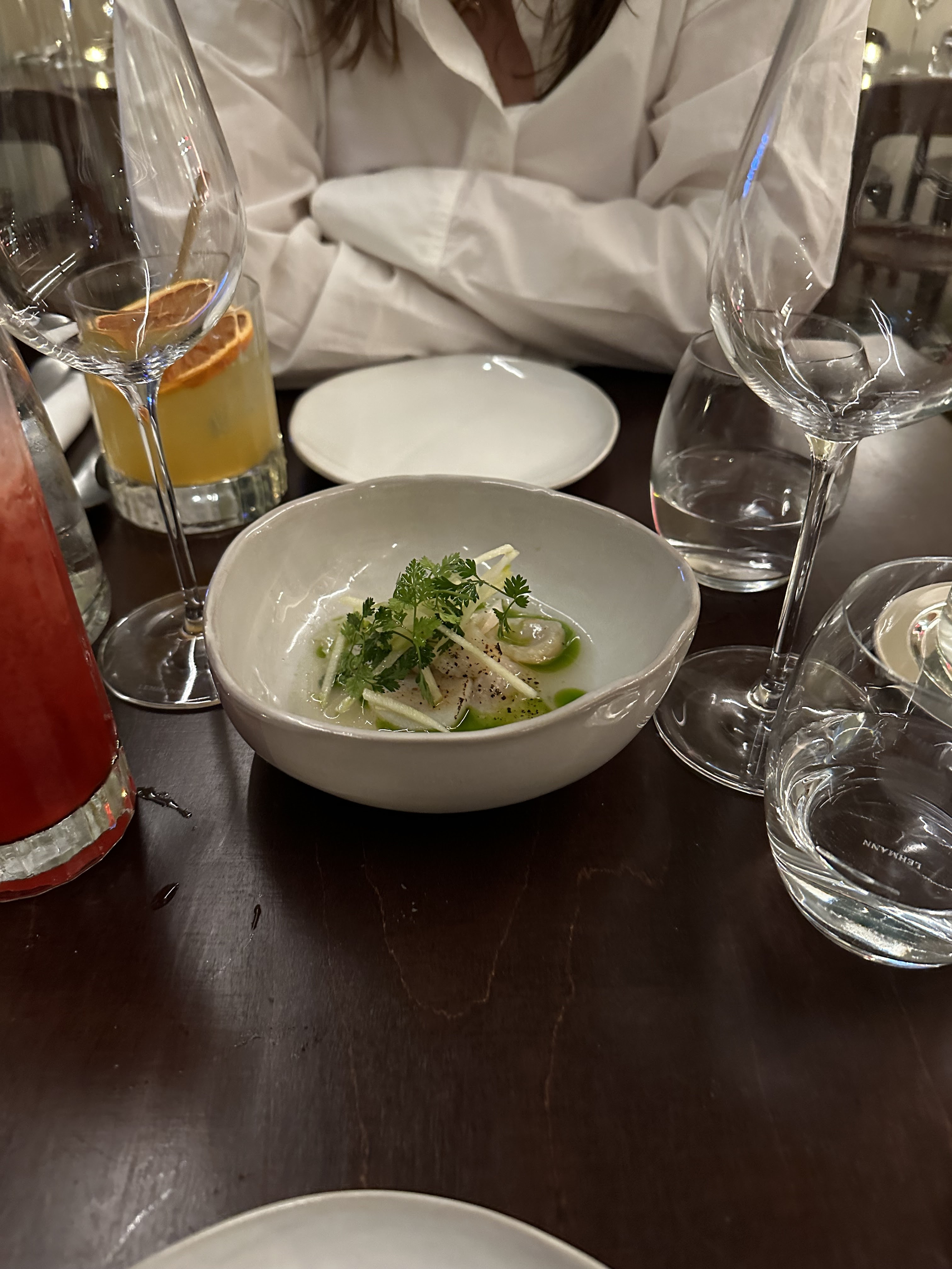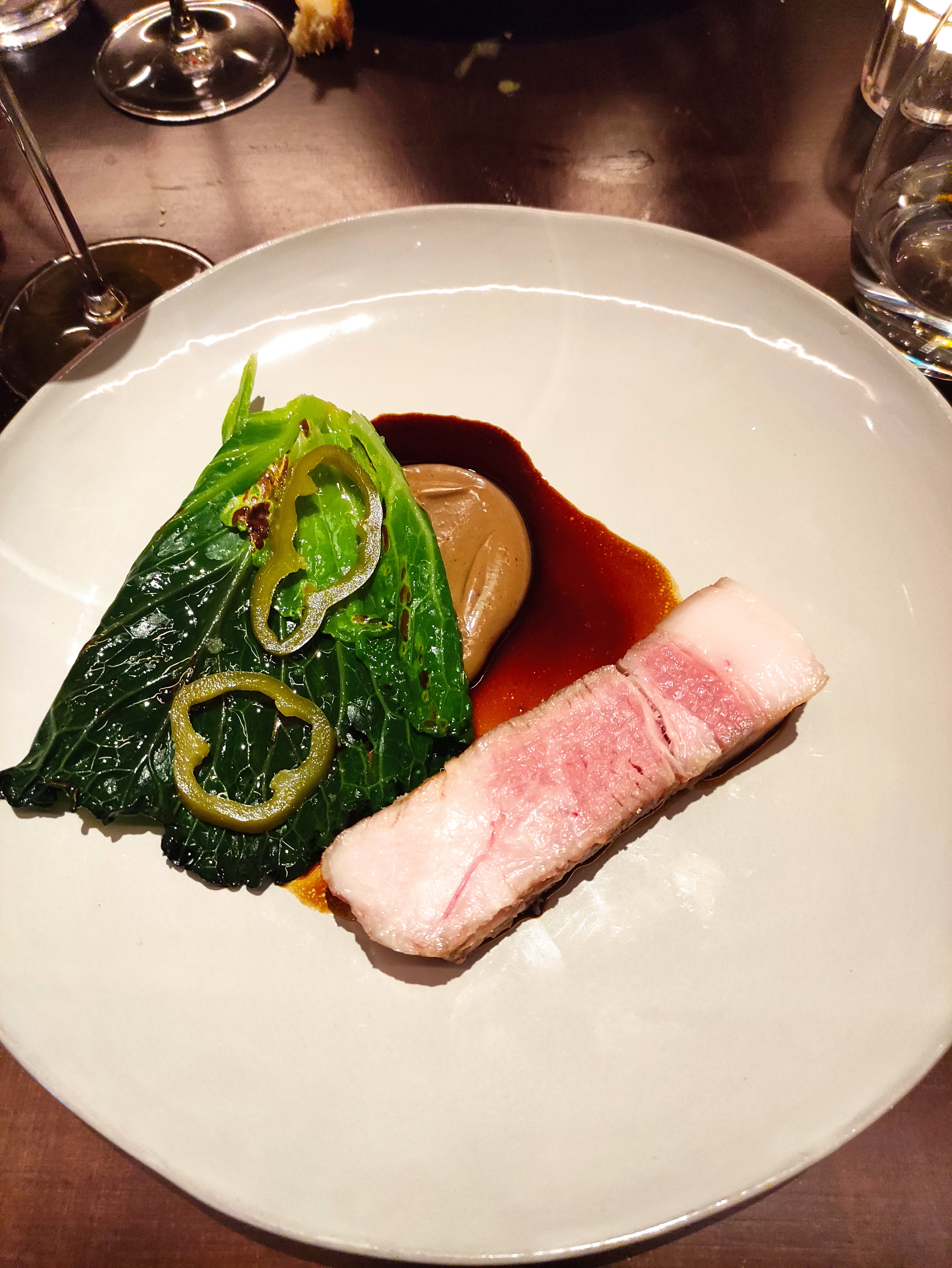 L'endroit est très minimaliste, pas de nappes ou de sets, chaise en bois (pas très confortable), ambiance limite hostile mais peut être dû au peu de monde ce soir là. La jeune femme qui s'occupe du service est très agréable, avenante et aimable. En revanche la cuisine ne vaut vraiment pas le détour et surtout pas pour le prix. Plats principaux ( 3 au choix sur la carte) basique, bon sans plus et surtout les portions plutôt de dégustation pour un prix autour des 35€. La présentation des plus spartiate comme les accompagnements.