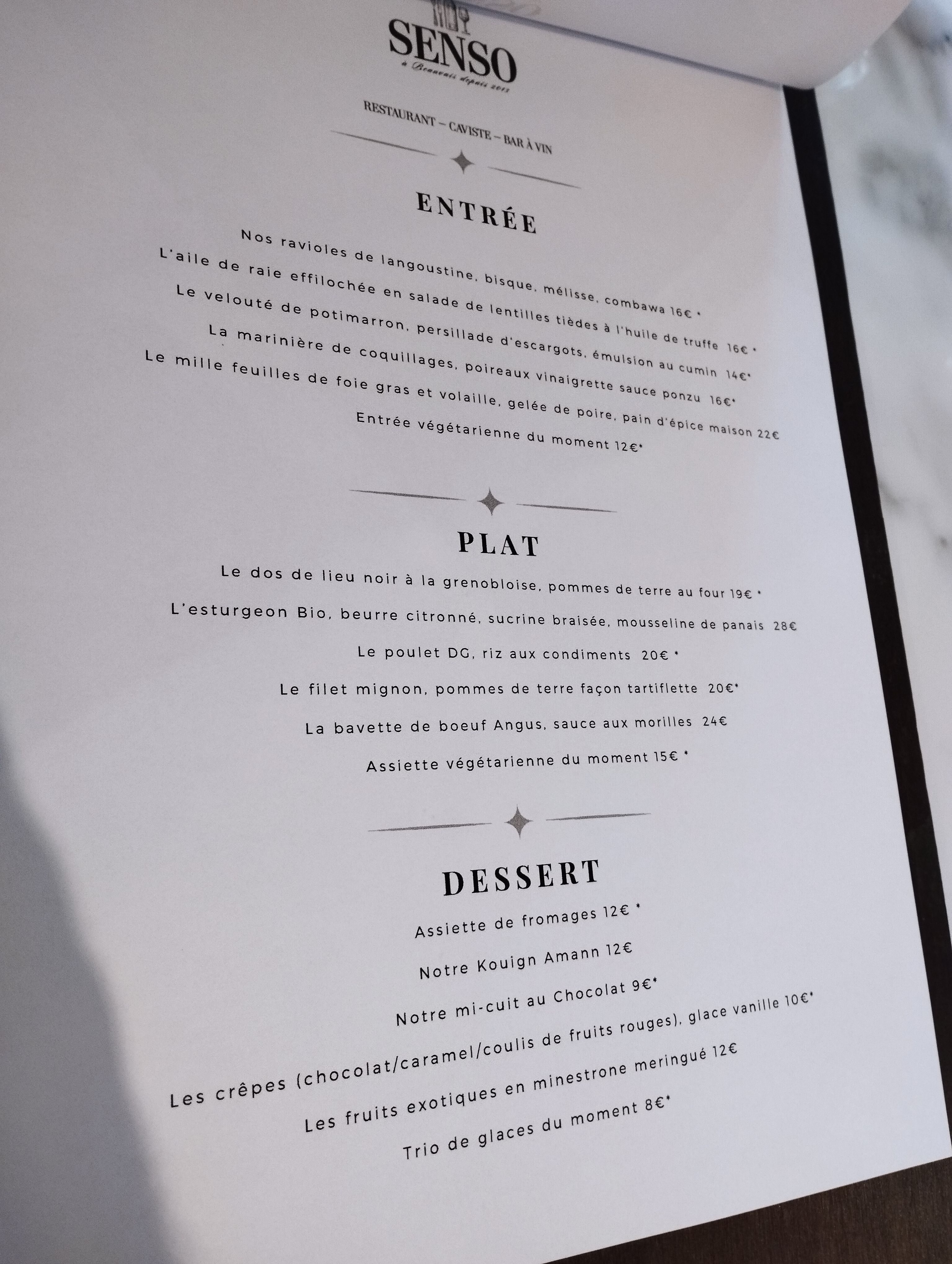 Il est toujours agréable de trouver un restaurant qui propose une carte simple avec de bon produits bien travaillés, noys avons pour notre première fois au Senso opté pour le menu dégustation en 6 plats 2 entrées, 1 plat de poissons 1 plat de viande, fromage et dessert, le tout accompagné de vin au verres Ce fut parfait tant au niveaux des cuissons que de la vitesse du service qui fut très agréable, les prix sont très raisonnable pour la qualité offerte