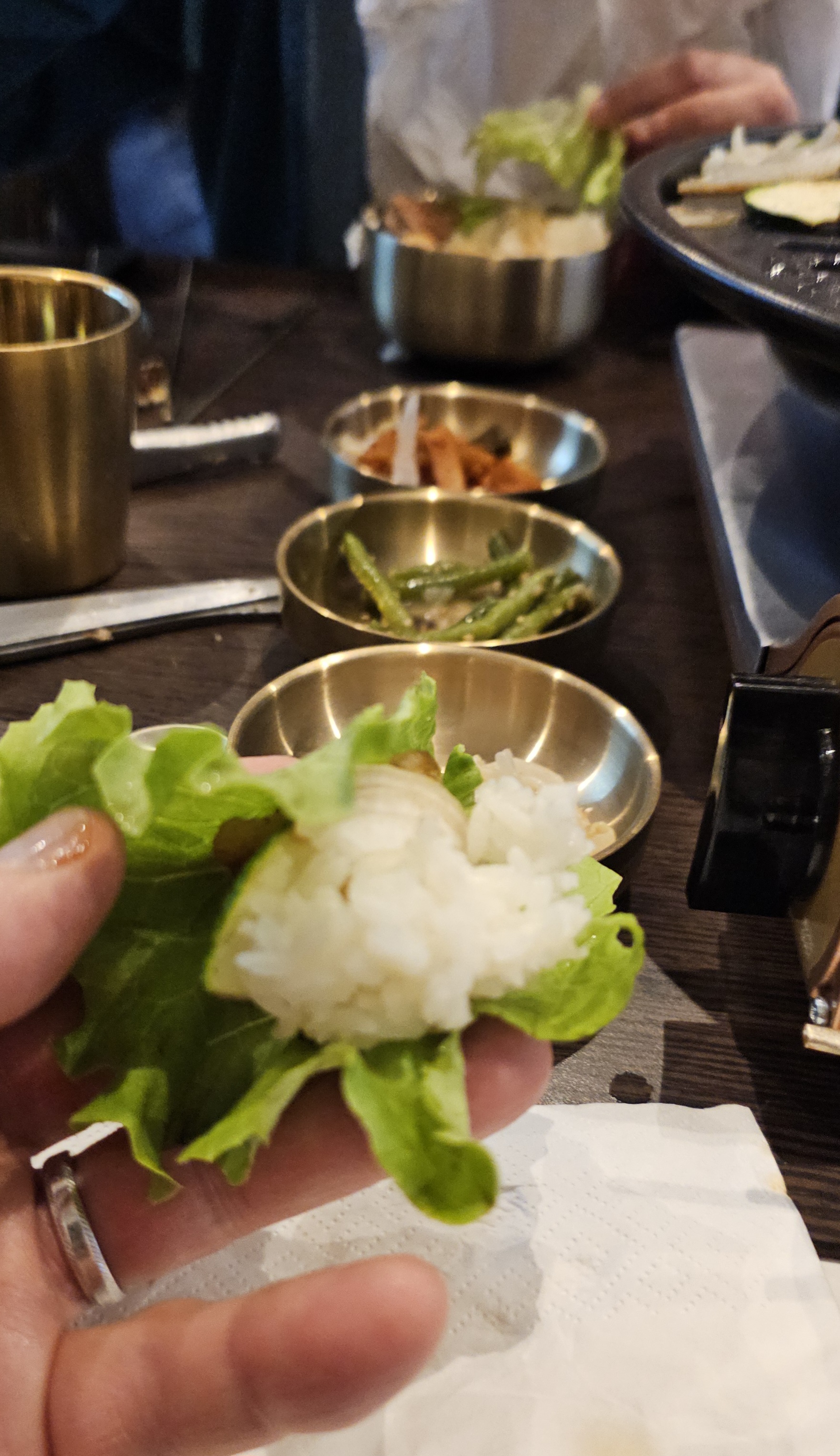 Très belle surprise. Excellent accueil. Nous avons pris barbecue porc et poulet mariné. La patronne fait tout : Rôtit la viande et la découpe en petite bouchées bien dorées et nous fait une démo pour manger typiquement coréen en enroulant viande, légumes, sauce et riz dans une petite feuille de salade. Simplement délicieux.