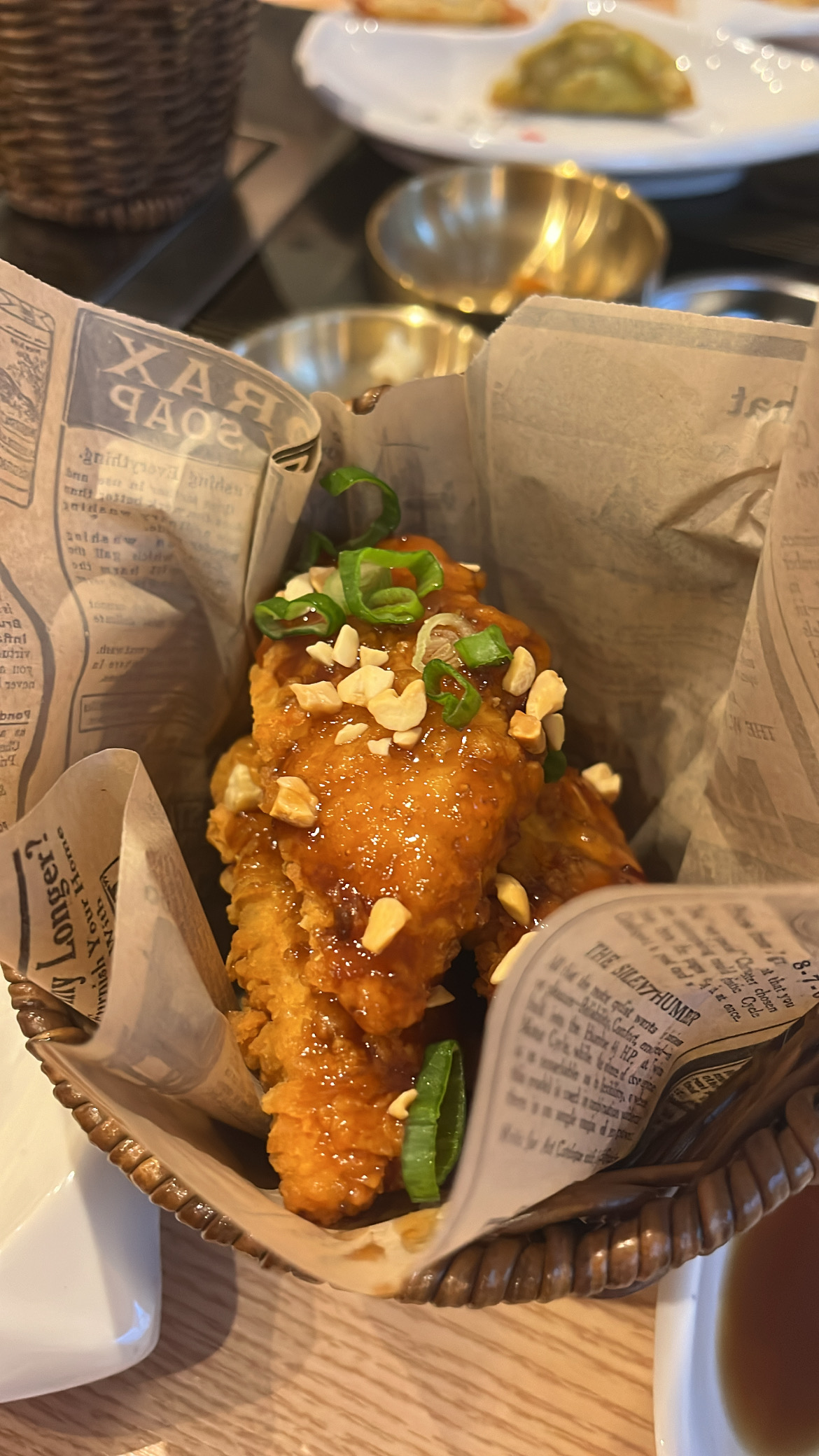 Nous avons pris du poulet frit en format pop en entrée avec une sauce à l'ail et au soja : un régal ! La panure était vraiment légère et le poulet fondant. Puis en plat, nous avons pris un BBQ de bœuf et de poulet : la viande était légèrement croustillante sur l'extérieur et tellement tendre à l'intérieur, une vraie merveille ! Mention spéciale pour l'infusion à l'aloé et au miel : particulièrement adaptée quand il fait 7°C dehors en soirée ! Et pour couronner le tout, le service était très chaleureux, très amical ! Je recommande chaudement !