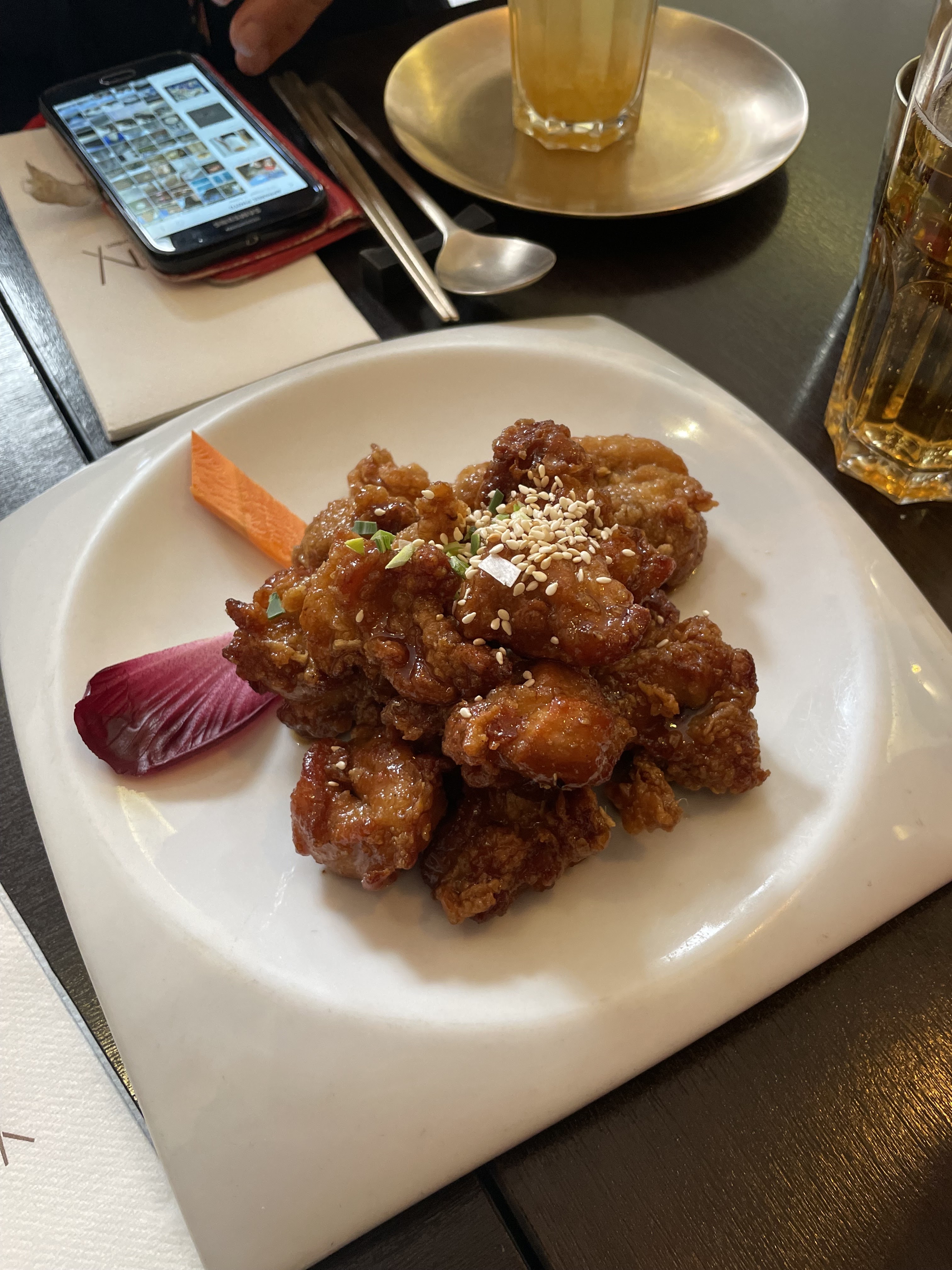 Les ailes de poulet ne sont pas cuites on peut dire c’est à point avec un peu sang. Il n'y a pas de goût du tout. Vous ne pouvez compter que sur la sauce à tremper. Je regrette de ne pas avoir pris de photos d'ailes de poulet. Si c'est délicieux, je prendrai des photos. Les gâteaux de riz sont trop salés.. Bibimbap, Le goût est vraiment moyen, pas du tout aussi bon que le style coréen. Je ne comprends pas pourquoi tant de gens ont tant marqué que je pensais que c'était de la nourriture coréenne authentique. Je ne comprends p