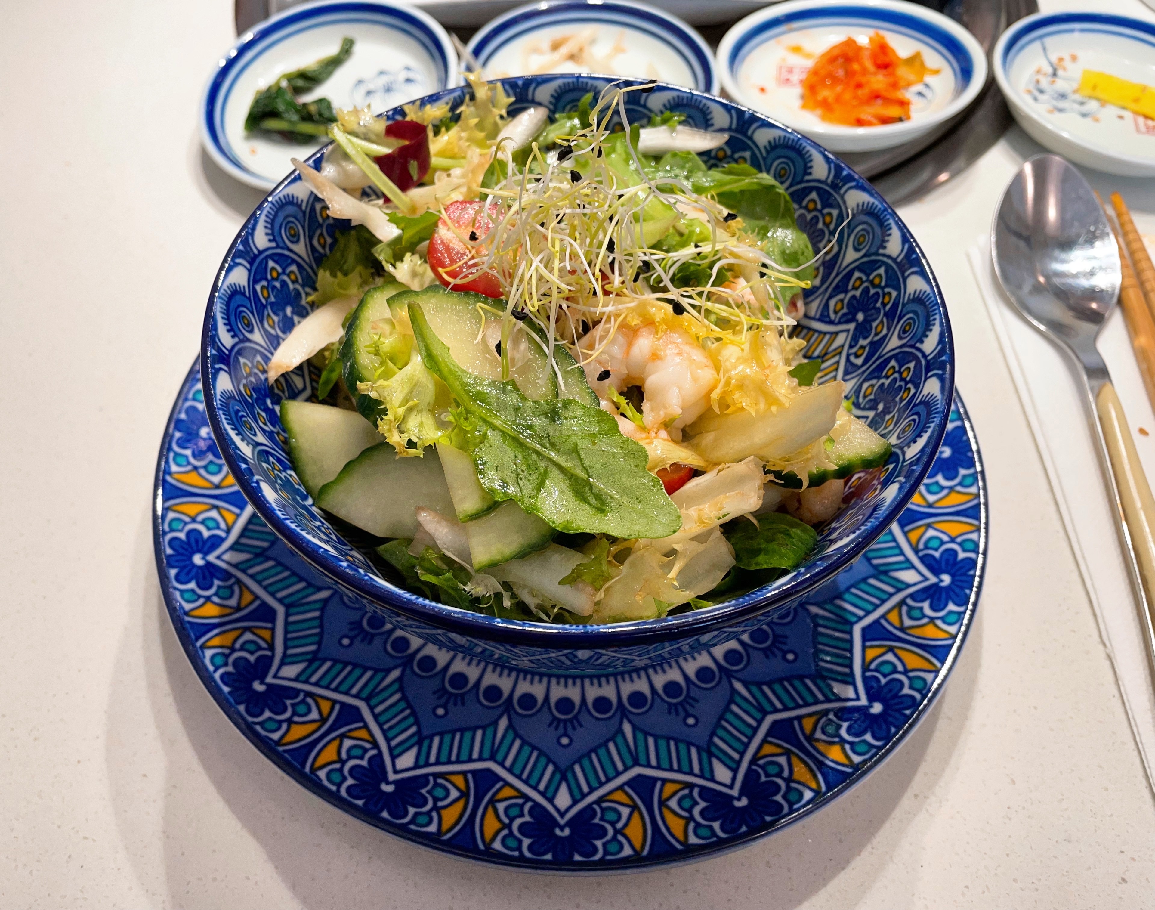 Excellent service, le serveur était vraiment très gentil et souriant. Les plats étaient très bons, sauf le poulet frit coréen qui était un peu décevant. Ça allait pour le goût, mais ce n’était pas ce à quoi je m’attendais en commandant. De plus je n’ai pas trop aimé la sauce qui l’accompagnait. De même pour la salade, il n’était pas précisé qu’elle était avec des crevettes ; n’aimant pas les crevettes j’ai été un peu déçue mais la salade restait bonne. J’ai beaucoup aimé le japchae et la viande pour le barbecue était très bonne, finement découpée (mais sûrement décongelée). Enfin, les prix sont un peu élevés. Expérience sympa.