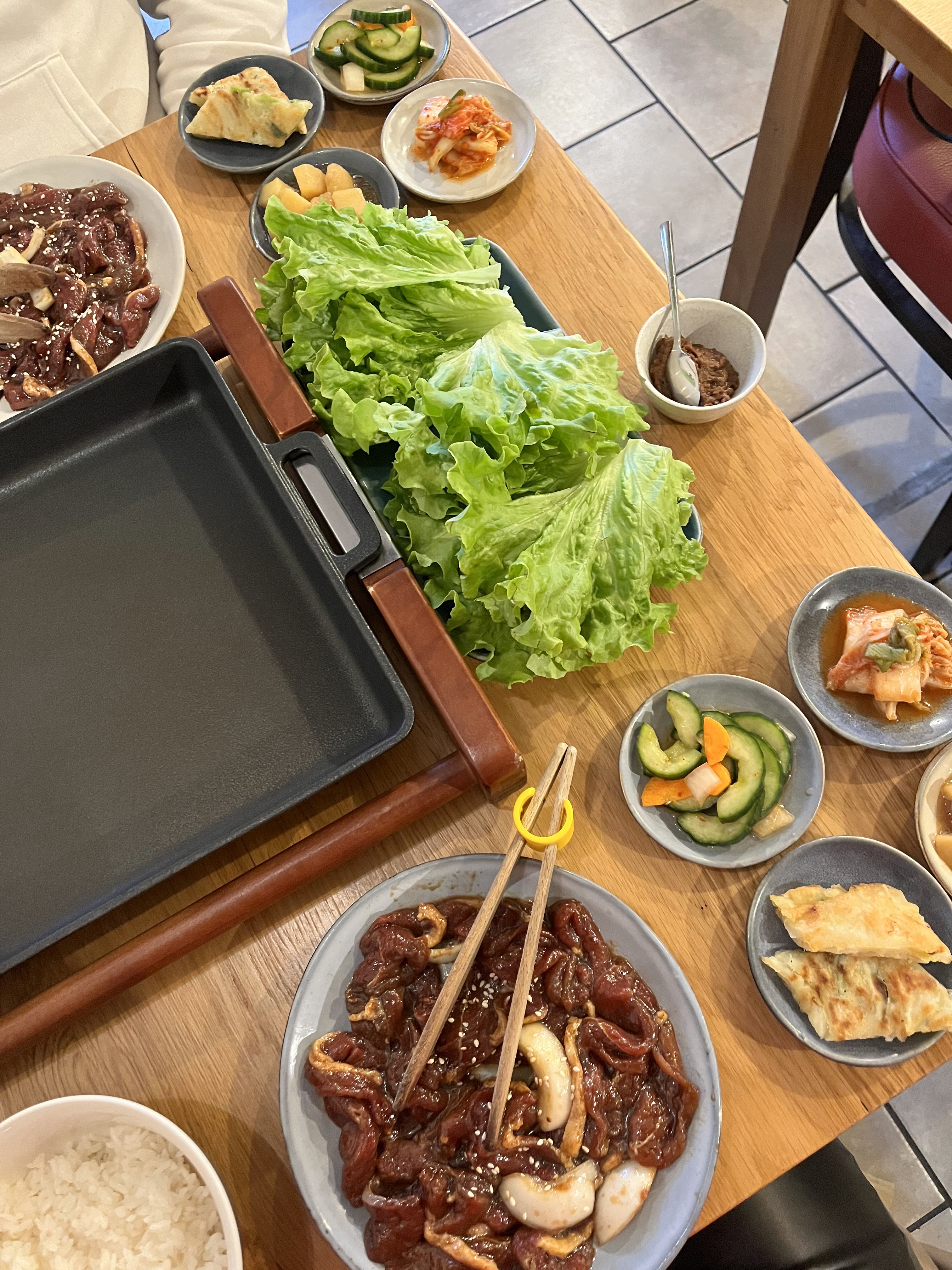 Super restaurant coréen En revanche nous sommes arrivés 1h avant la fermeture et on nous a bien fait comprendre plusieurs fois qu’on avait 1h pour manger et pas 1min de plus … Mis à part ça tout était parfait, viande succulente ainsi que les accompagnements Et cerise sur le gâteau cette délicieuse crêpe coréenne! Je n’ai jamais mangé une aussi bonne pâtisserie de toute ma vie !!