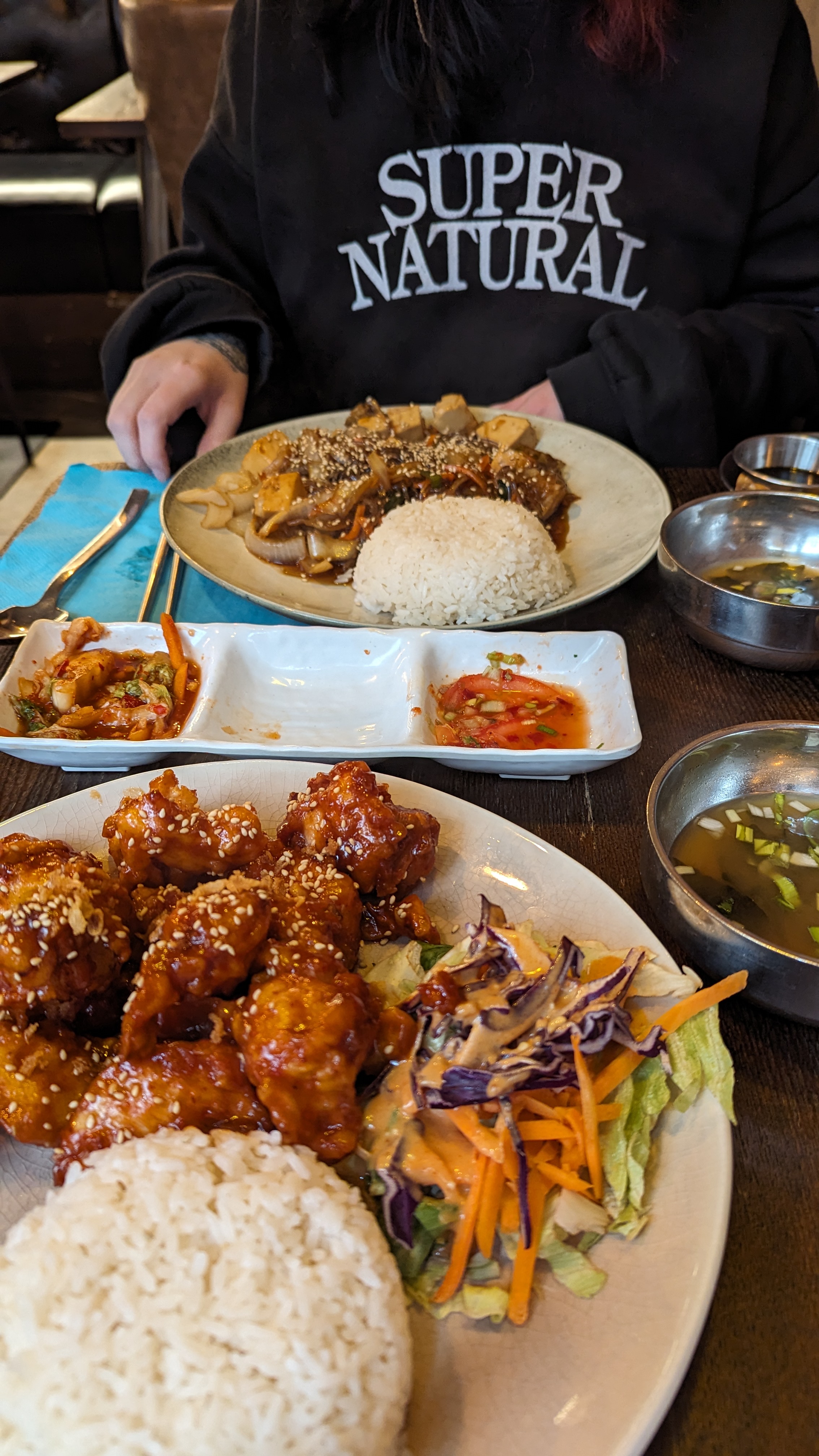 La nourriture est bonne, mais j'ai eu un meilleur Bibimbap. Le leur était un peu sucré à cause de la façon dont ils cuisinaient le tofu et je n'aimais pas ça. J'ai aussi eu une crêpe au kimchi, mais il n'y avait pas de kimchi, juste de l'oignon. Je ne sais pas si c'est comme ça que c'est censé se passer. Je m'attendais à un goût de kimchi. Vous recevez également de la maison une petite assiette de kimchi, d'algues, de radis daikon fermenté et de soupe miso. En dessert, j'ai eu un mochi fourré à la pâte de haricots rouges.