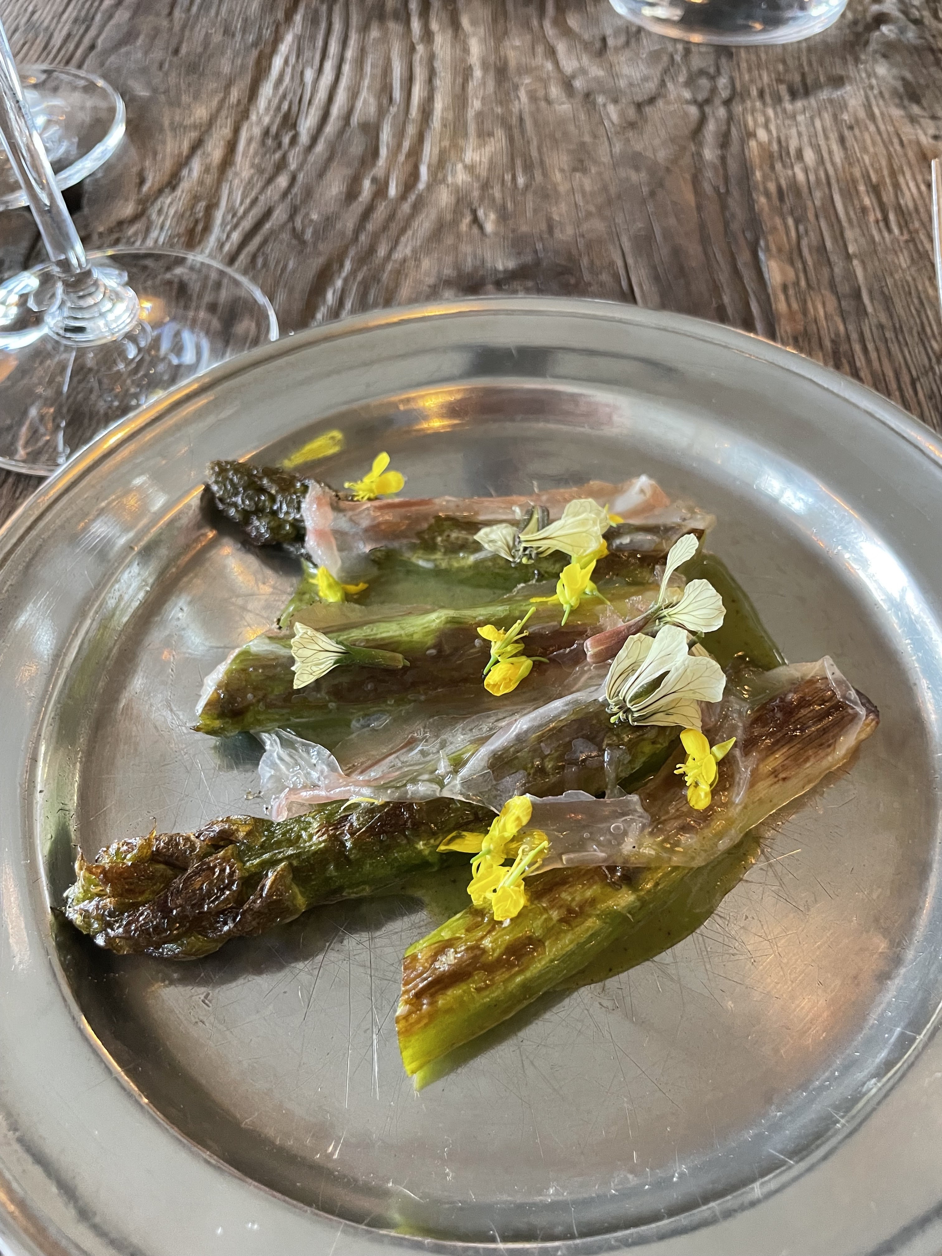 Nous sommes arrivés pour le déjeuner pour deux et avions le menu carte blanche avec accord mets et vins. Nous attendions avec impatience les plats lourds de légumes. Nous aimons la viande, étant un éleveur, mais la possibilité de prendre un repas composé de plats végétariens bien pensés était charmante. Le personnel n'aurait pas pu être plus charmant. Très à l'écoute, très compétent. Les asperges sont à ne pas manquer.
