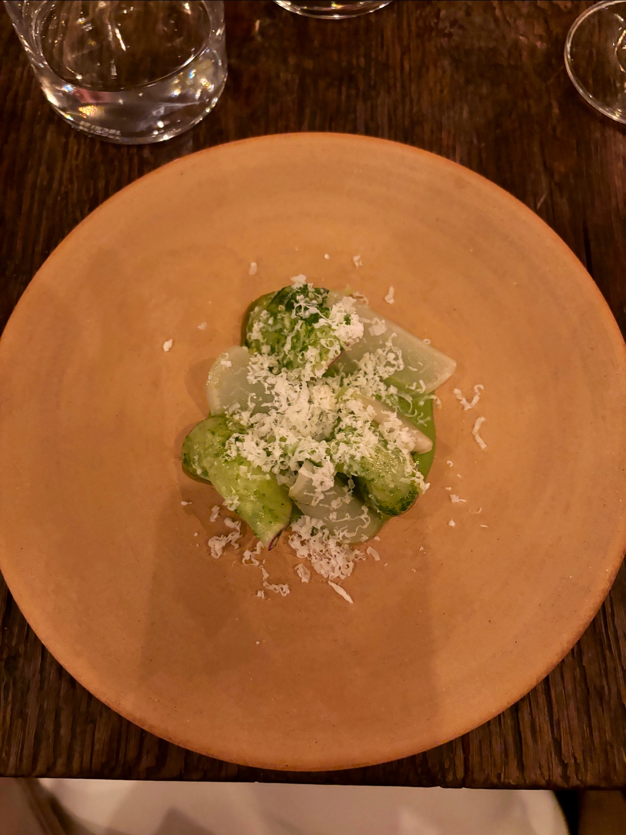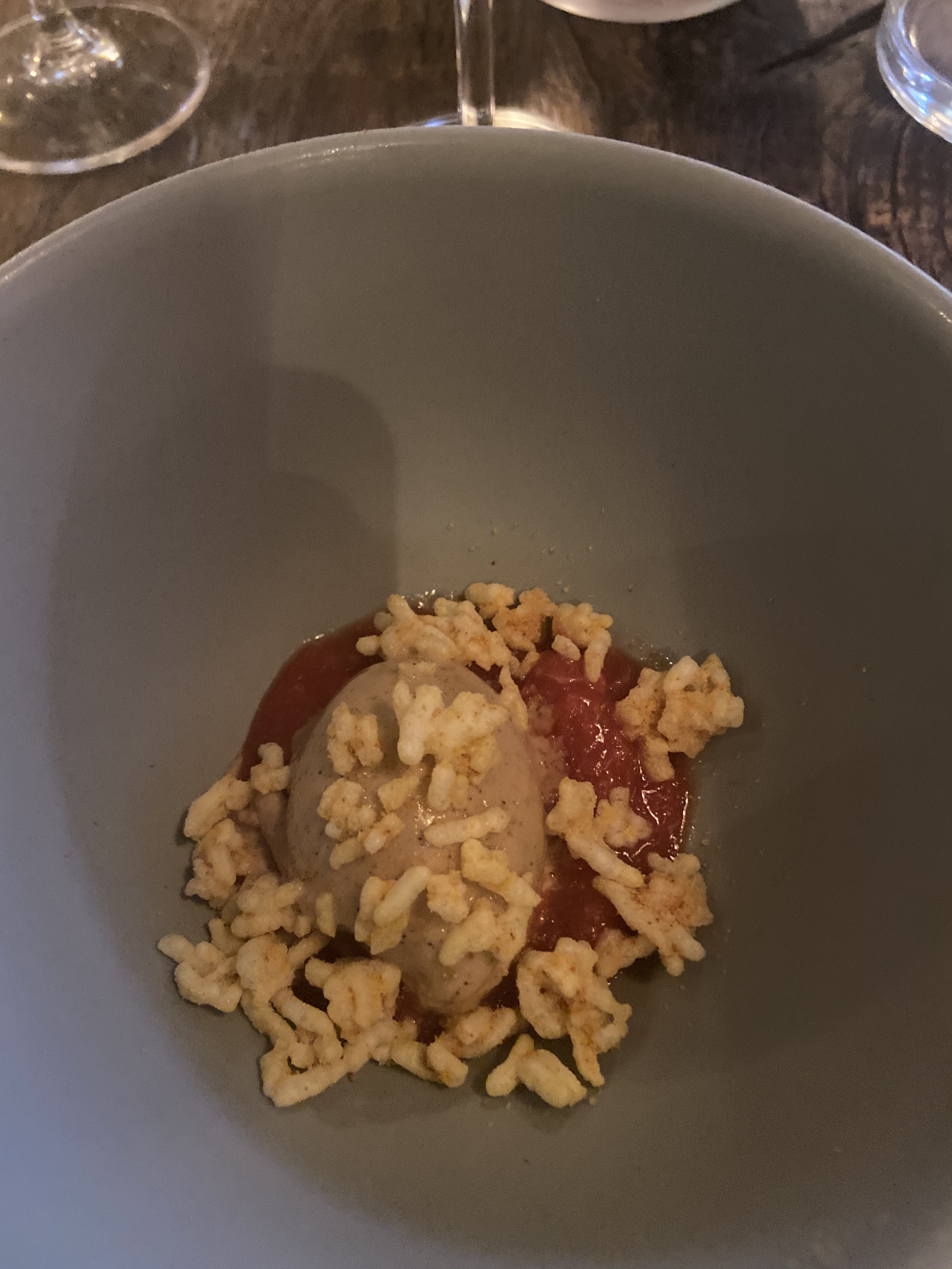 Essentiellement de l'esbroufe. Lorsque j'y ai dîné à la fin de l'été en tout cas. Quelques saveurs intéressantes mais rien qui ne vale une étoile Michelin. Certainement pas les sortes de tortellini servis dans un bouillon type bortsch par exemple qui étaient à peine dignes d'une cantine. Seul point vraiment positif : le service est décontracté sans être familier et c'est quelque chose que j'apprécie.