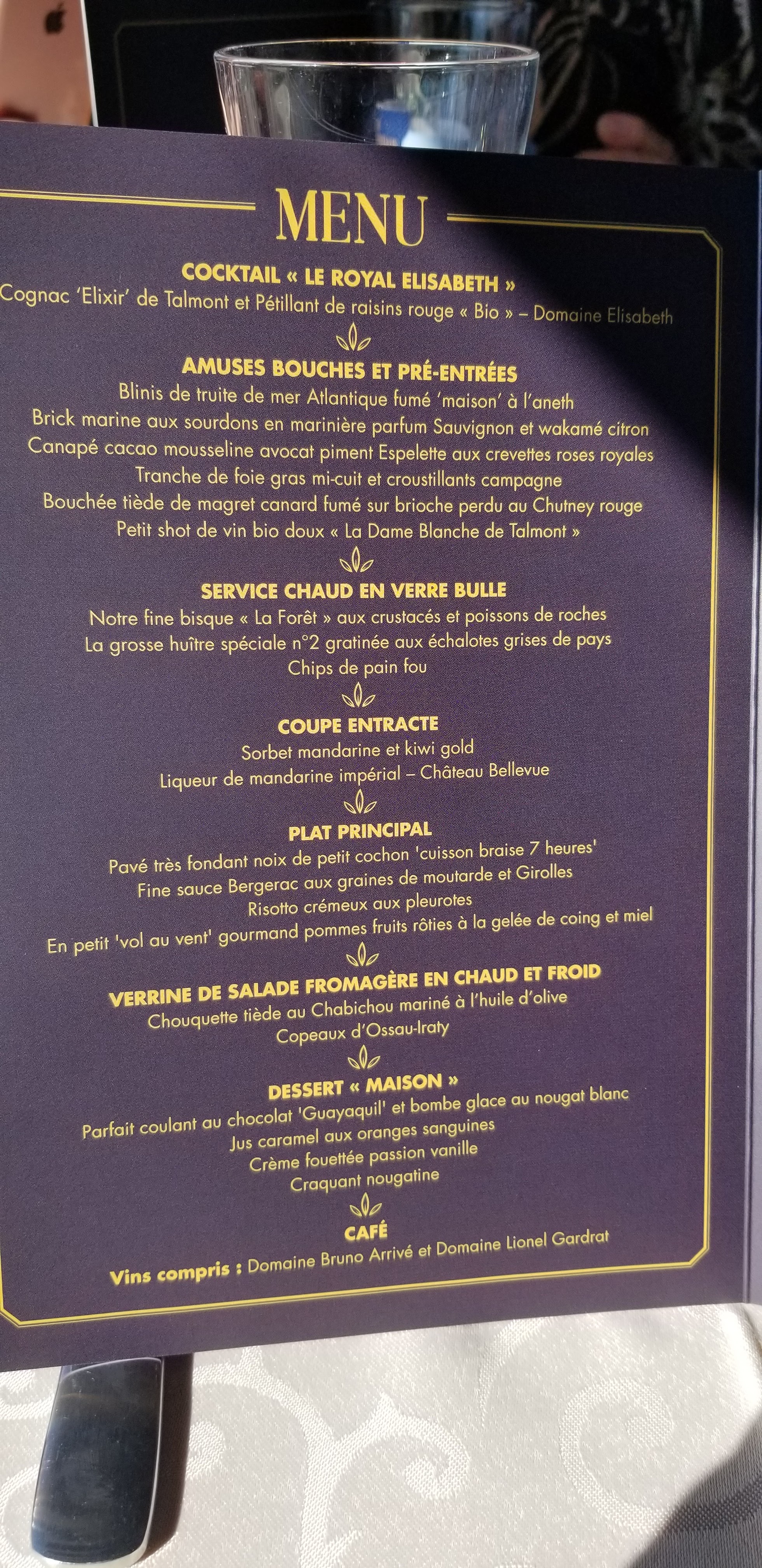 C'est un repas offert par ma fille en cadeau de Noël 21 , et où après des tentatives de réservation nous avons réussi à avoir la date du 17 novembre 22 à midi . À notre arrivée à la gare il pleuvait, un vrai temps d'automne , il y avait beaucoup de gens, c'est là que l'on a compris pourquoi il fallait réserver longtemps à l'avance . Le train garé à proximité donnait envie d'y monter , c'est pas commun de voir des wagons poolman dans notre région ! À l'entrée dans l'un des deux correspondant à notre billet , je fus ravi par le décor , nous avons été mon ami et moi placés côté ouest , ce qui fait que dans le parcours qui passe par des villages typiques Charentais nous avons eu du soleil ⛅☀️ . Le repas qui fut gastronomique du début à la fin a été servi par des employés hommes et femmes en tenues correctes et agréables en conversations . Je recommande ce voyage très sympa à tous gens de jeunes à moins jeunes !!! Signé , Mer Fouilleron Gilles , du pays Royannais .