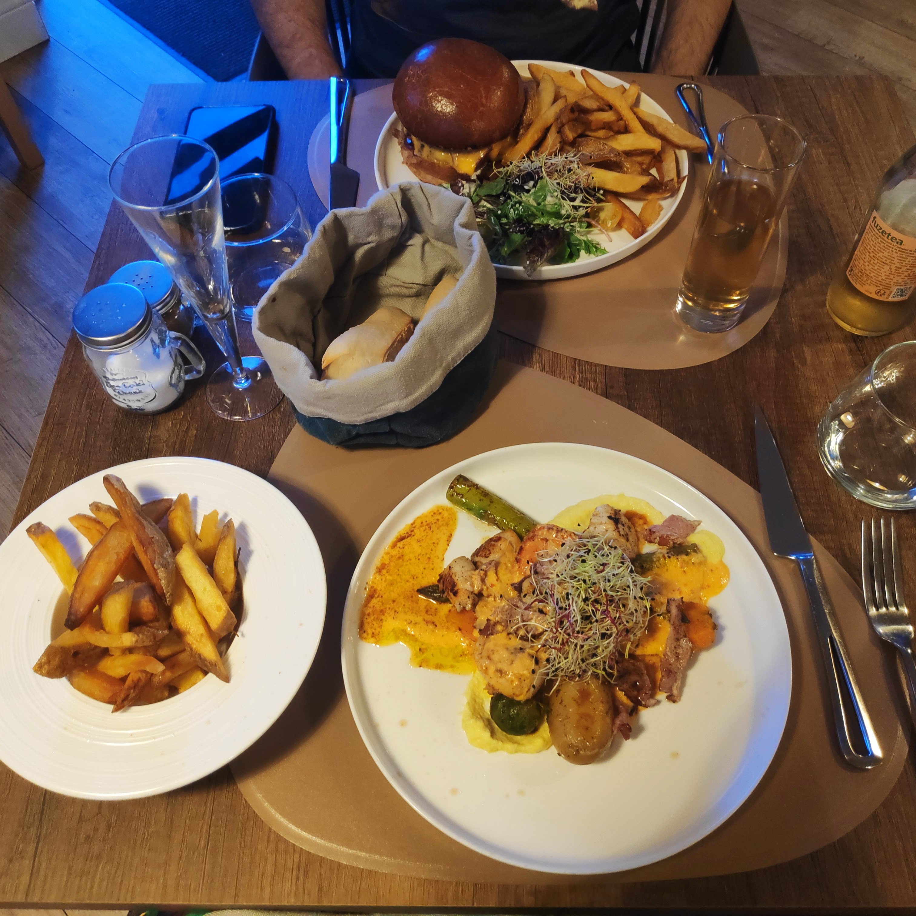 Si vous cherchez un restaurant cosy que ce soit pour la saint-valentin, un anniversaire, entre amis ou avec sa famille Ce restaurant sera fait pour vous. Tout est fait maison, Le rapport qualité prix est imbattable, Il y en a pour tous les gouts burger, entrecôte, poisson, plats végétarien... Les Saint-Jacques Sont fondantes en bouche, La cuisson des viandes est très bien réalisé L'assiette est bien décoré et La garniture des plats est excellente, La serveuse est très sympathique et de bon conseils, a nôtre fin de repas nous avons eu le privilège D'avoir le cuisinier qui nous ramène les desserts. C'est sans hésitation que je recommande ce restaurant Avec un prix plus que abordable pour la qualité des produits que vous ne retrouverez pas dans le coin.