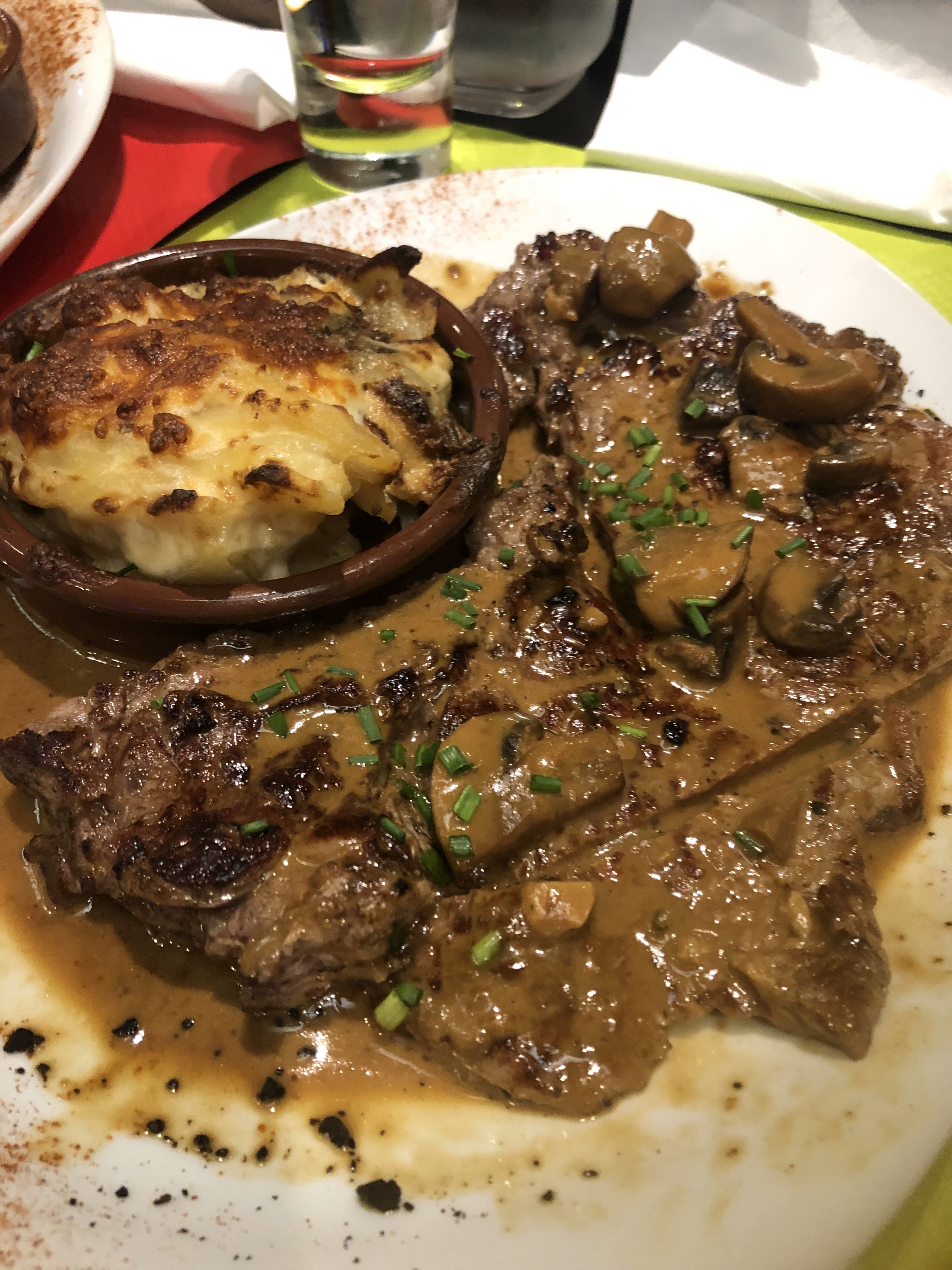 Escalope forestière bien bonne , accompagnement haricot bien bon mais gratin dauphinois pas à notre goût nous n avons pas pu le manger . Je recommande le coulant chocolat très bon . Tarifs élevés pour le filet de bœuf qui n est pas fameux . Dommage que les tickets restaurant ne soient pas acceptés et que les tarifs soient élevés. Un accompagnement par plat le reste en supplément 2 accompagnements seraient un plus au vu des montants. Serveur agréable mais télé à éteindre ou couper le son pour un repas plus au calme car être assis juste en dessous n est pas très agréable.