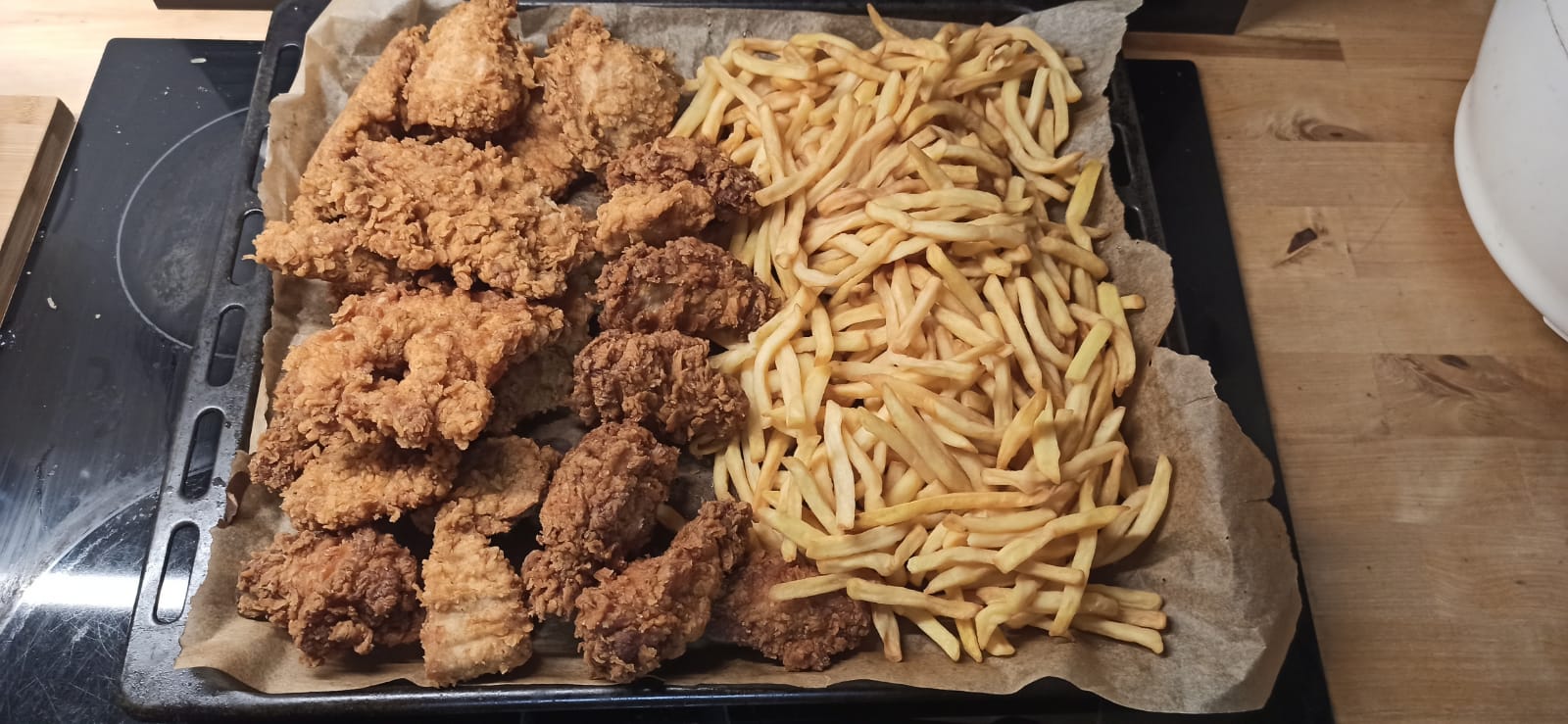 Un peu trop cuit au niveau panure de poulet Frites excellentes