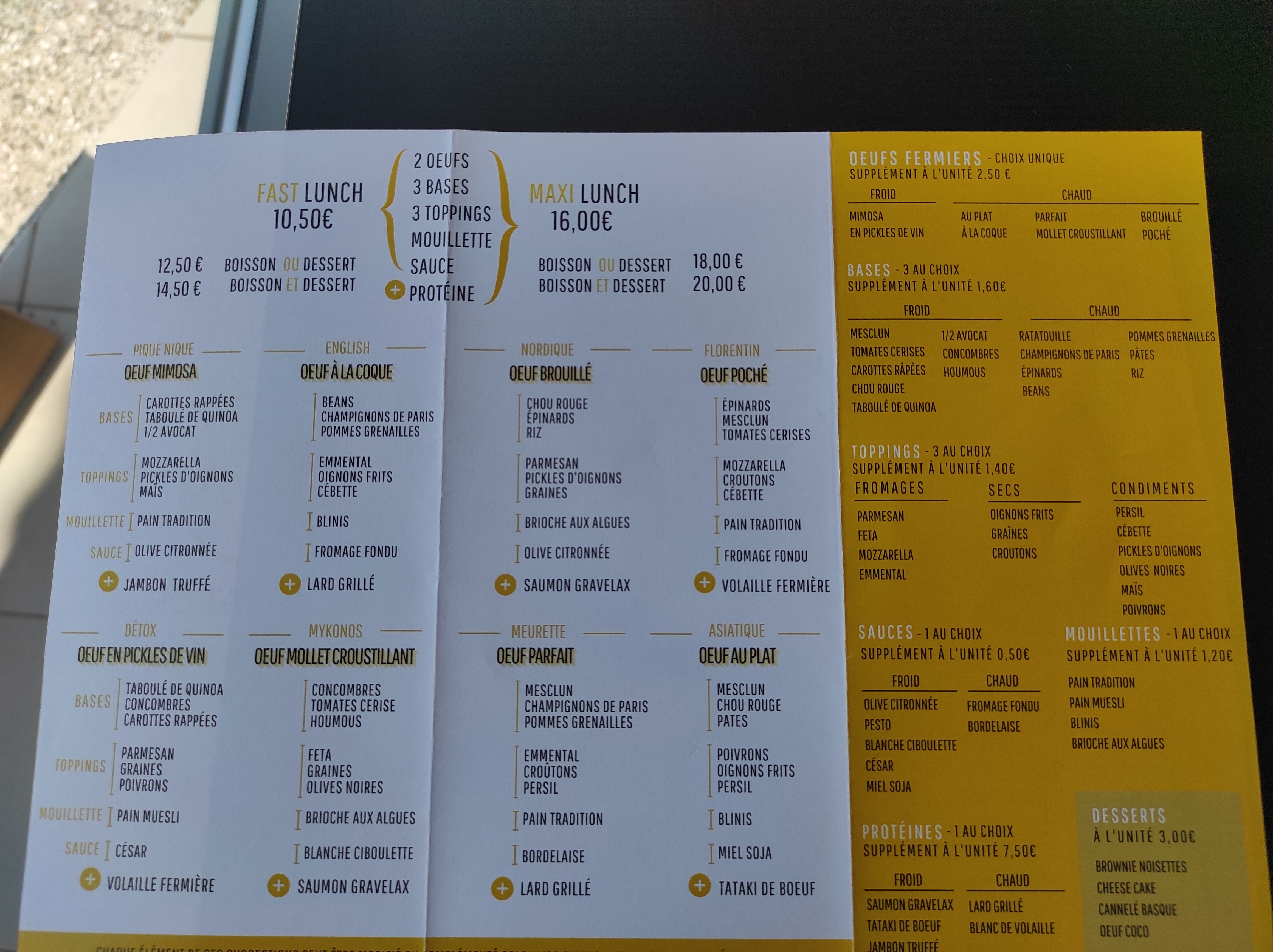 Endroit sympathique, ambiance calme et personnel accueillant. Les choix sont variés et ils ont mis les moyens dans chaque détail ce qui est remarqué et plaisant. Nous avons été satisfaits et avons passé un bon moment, simplement, nous avons trouvé le concept un peu discret car l'ingrédient principal ; l'œuf ne constitue pas la majorité du plat mais plus un à côté. Malgré cela, nous recommandons vivement ce petit point de restauration.